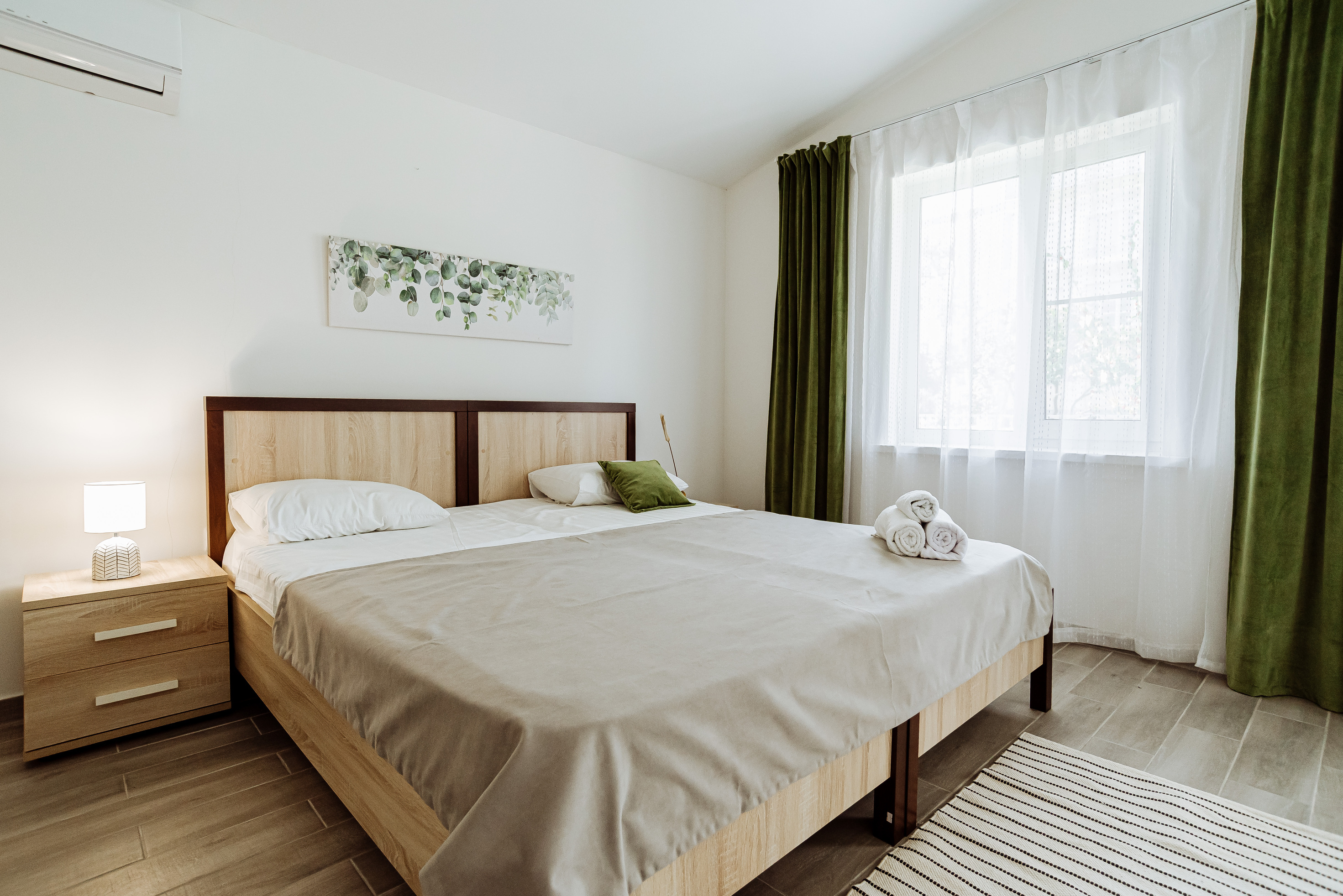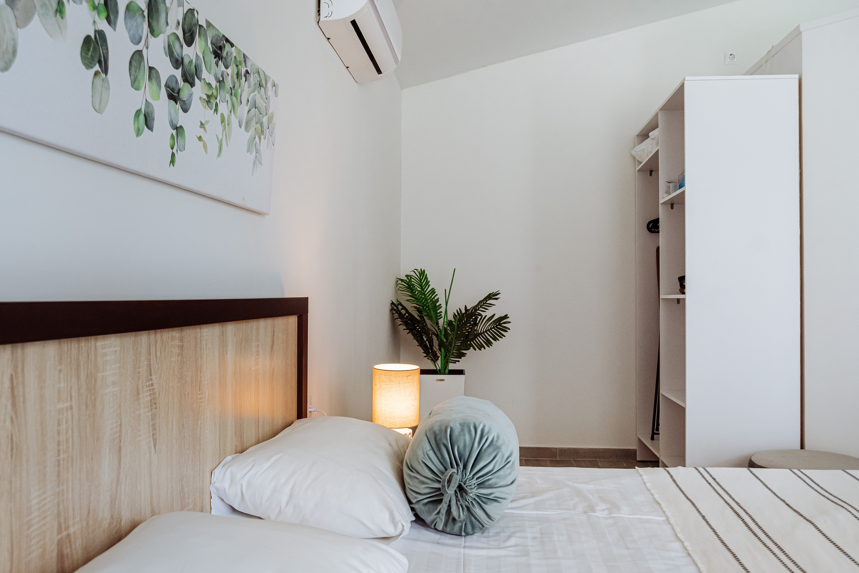 В номере: вешалка, диван раскладной, зеркало, кровать двуспальная, прикроватные тумбочки, стол, столик журнальный, шкаф, кондиционер, телевизор, телефон, холодильник, чайная станция