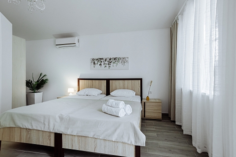 В номере: вешалка, зеркало, кровати односпальные /одна двуспальная кровать, прикроватные тумбочки, стол, шкаф, кондиционер, телевизор, телефон, холодильник