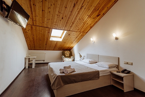 В номере: вешалка, зеркало, кровати односпальные /одна двуспальная кровать, прикроватные тумбочки, пуфик, стол, шкаф, кондиционер, телевизор, теплый пол, холодильник, чайная станция