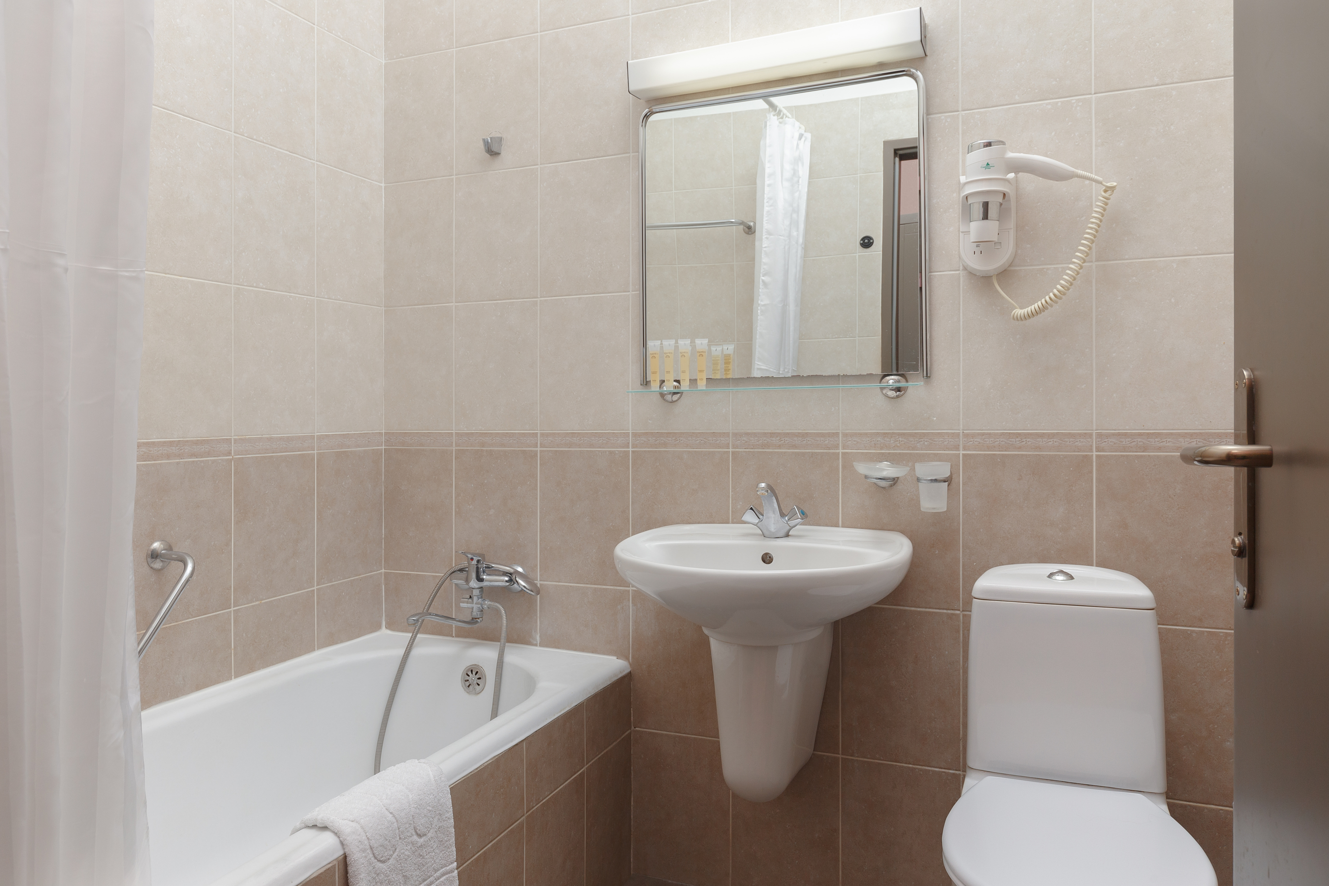 Санузел: с ванной, туалетные принадлежности, фен