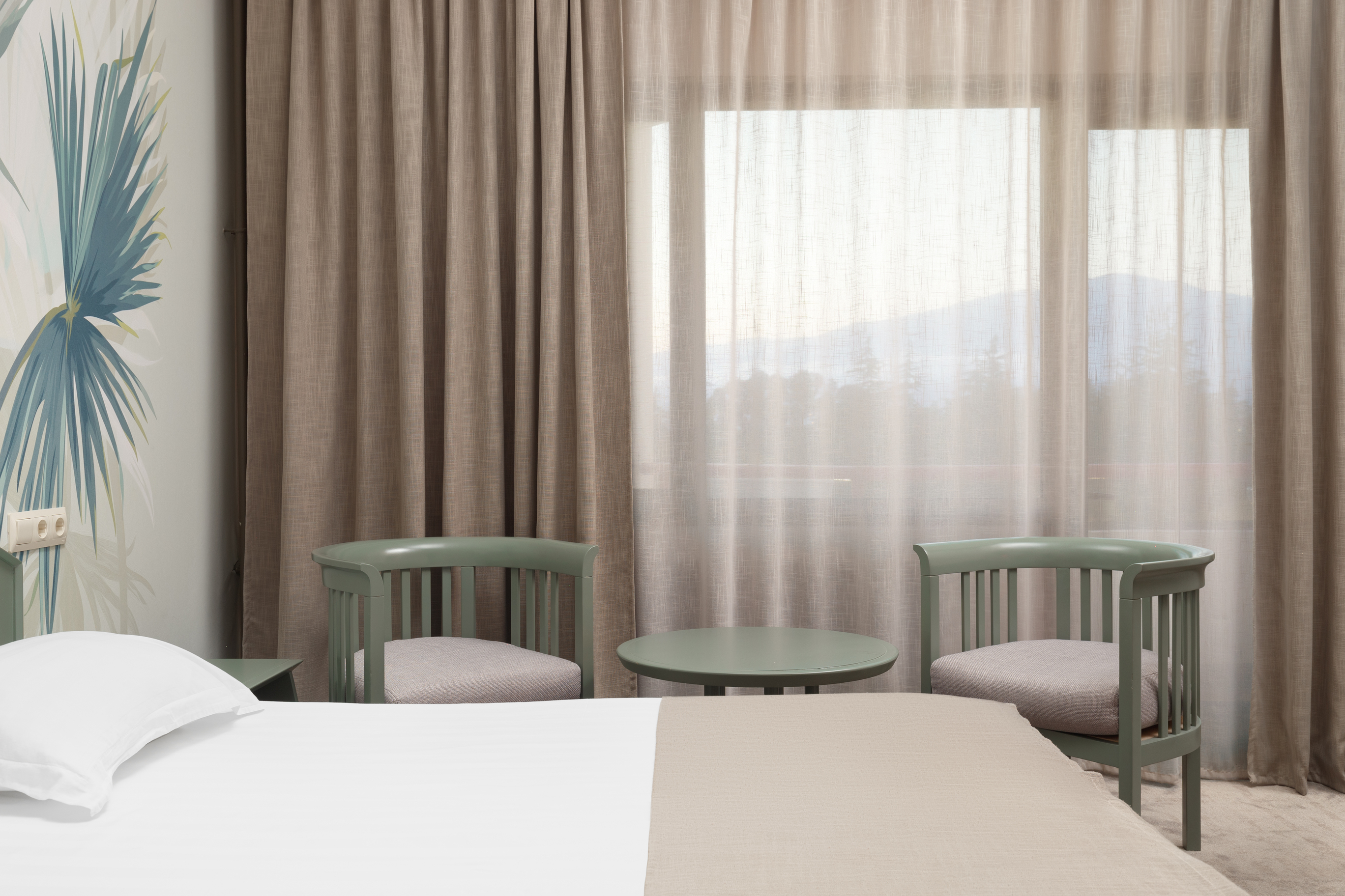 В номере: вешалка, диван, зеркало, кресла, кровать двуспальная, прикроватные тумбочки, столик журнальный, столик туалетный, стул, шкаф, сейф, сплит-система, телевизор, холодильник, чайный набор посуды, электрочайник