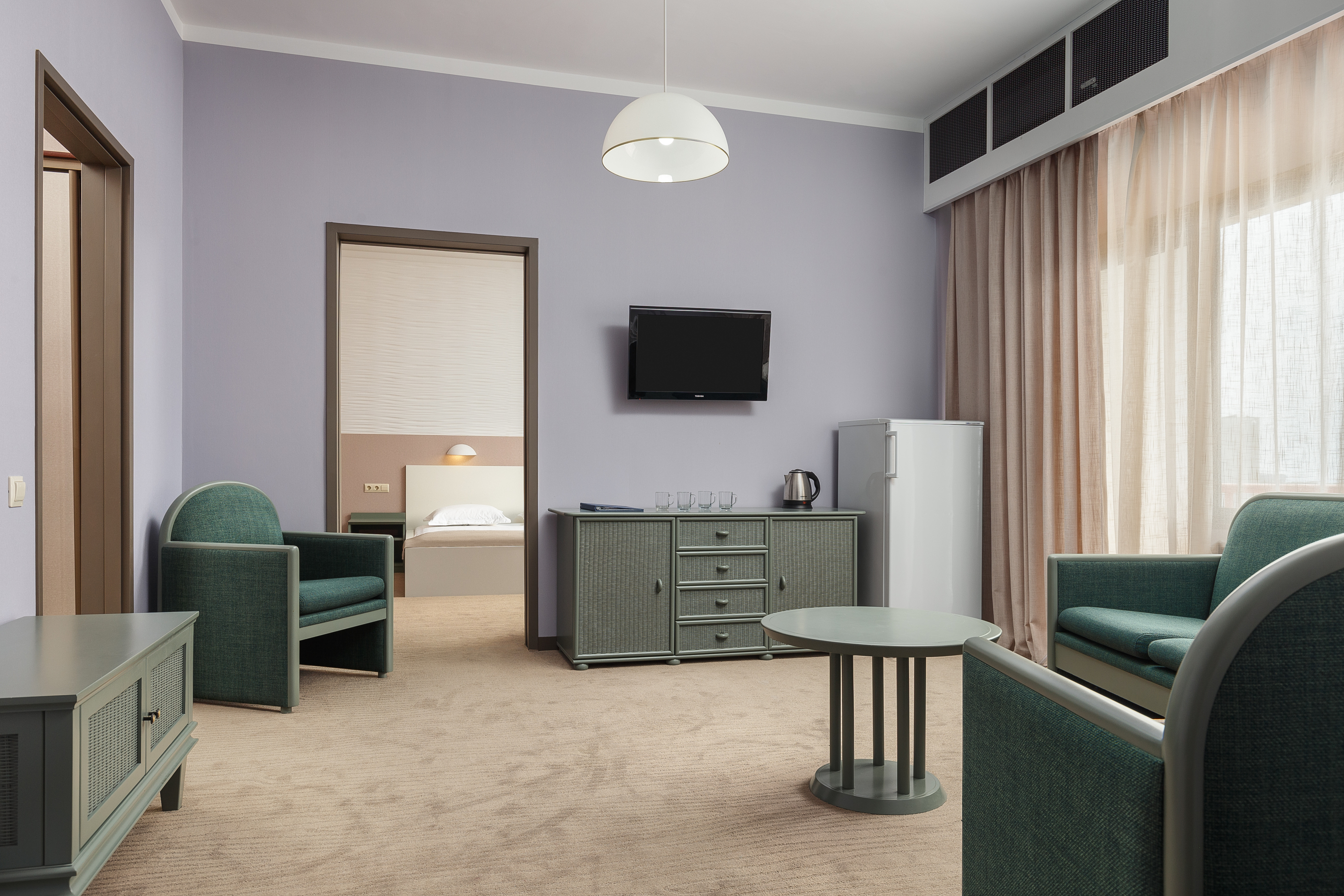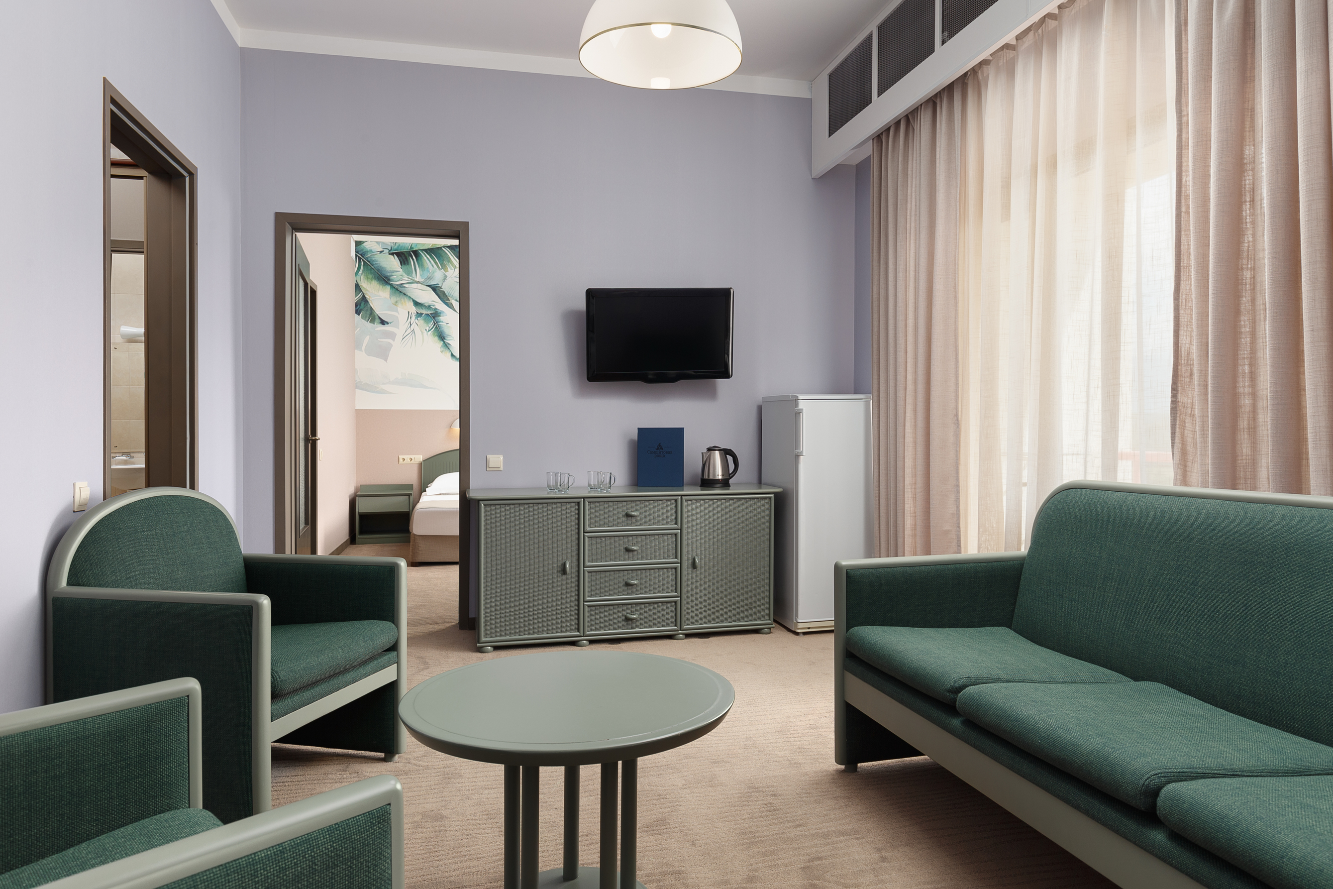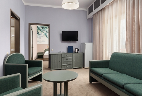 В номере: вешалка, диван, зеркало, кресла, кровати односпальные, кровать двуспальная, прикроватные тумбочки, стол, столик журнальный, стулья, шкаф, сейф, сплит-система, телевизор, холодильник, чайный набор посуды, электрочайник
