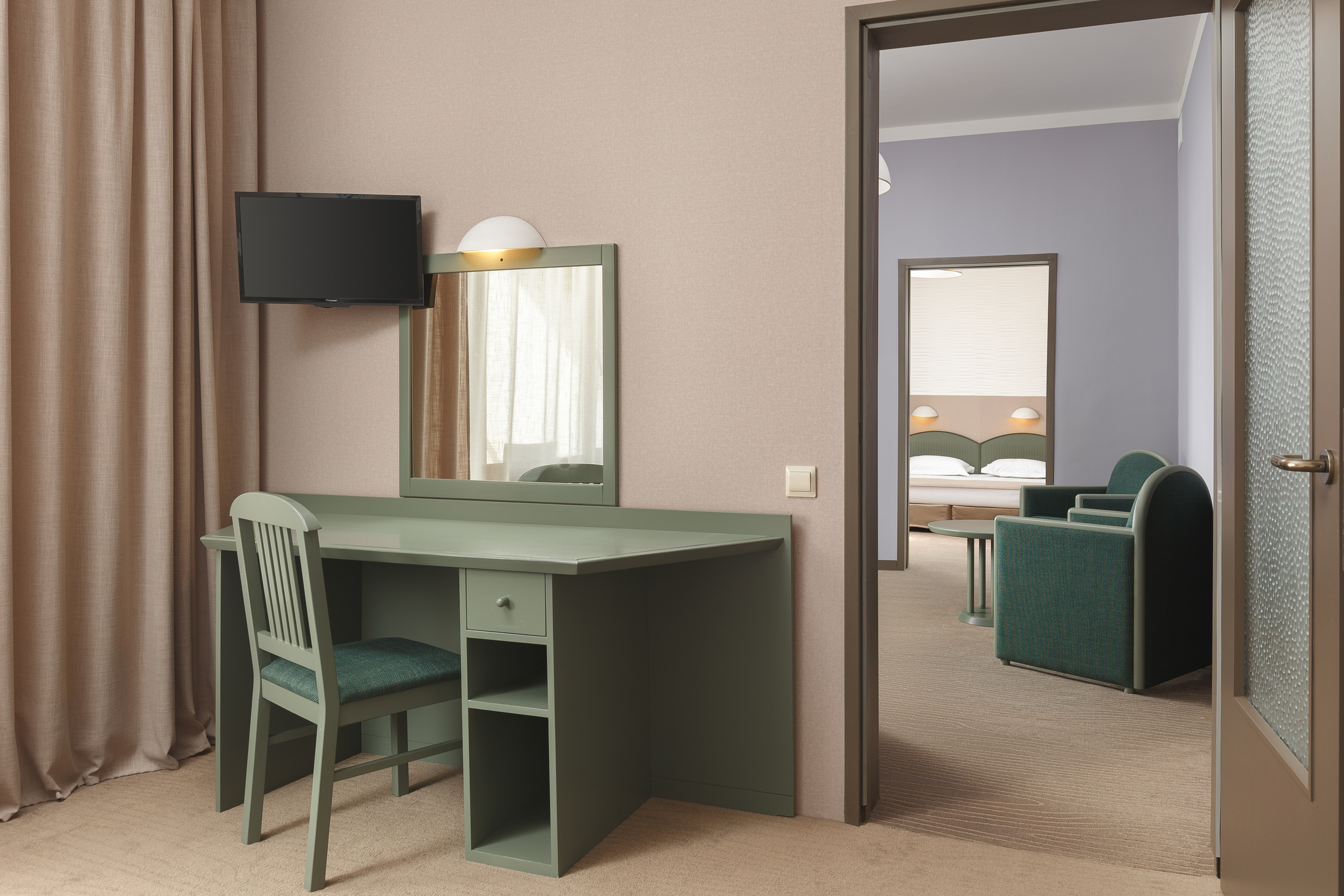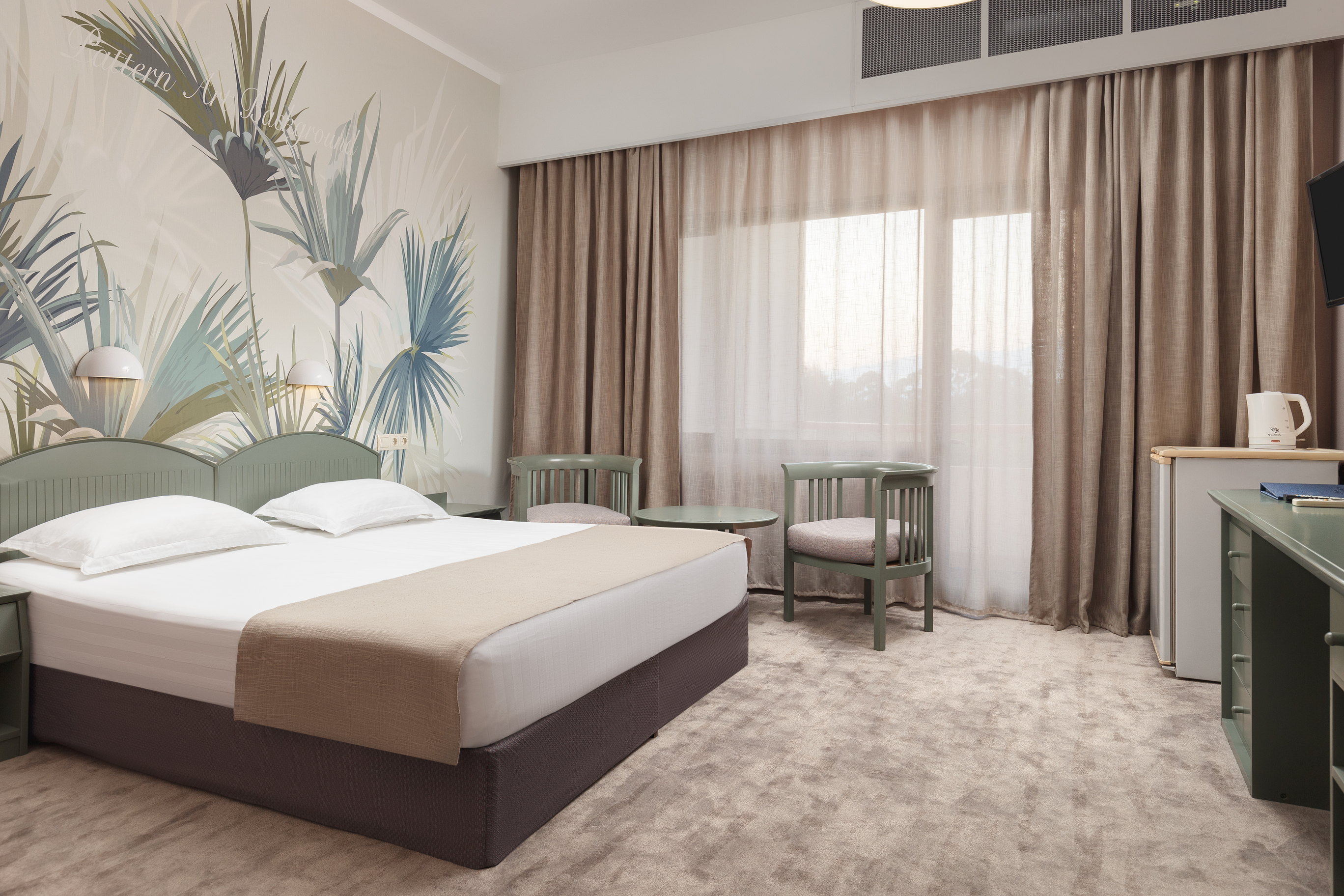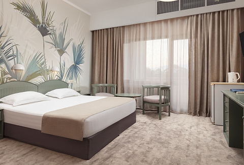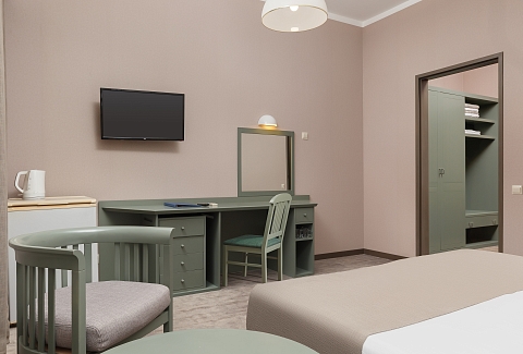 В номере: вешалка, зеркало, кресла, кровати односпальные /одна двуспальная кровать, прикроватные тумбочки, столик журнальный, столик туалетный, стул, шкаф, сейф, сплит-система, телевизор, холодильник, чайный набор посуды, электрочайник