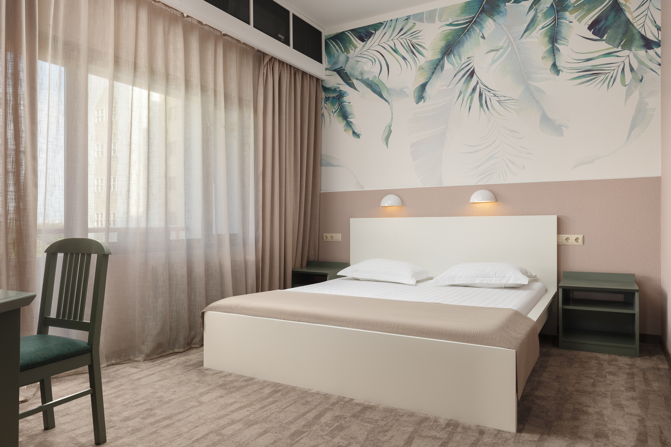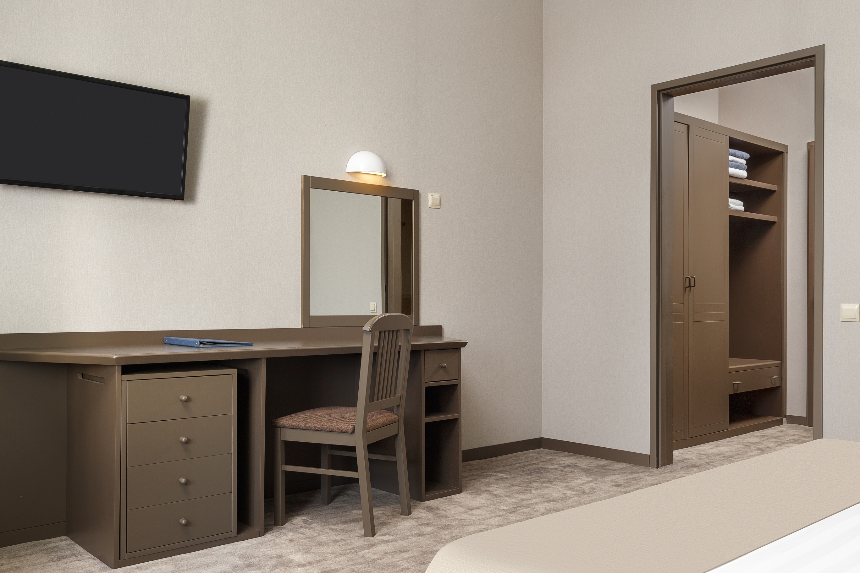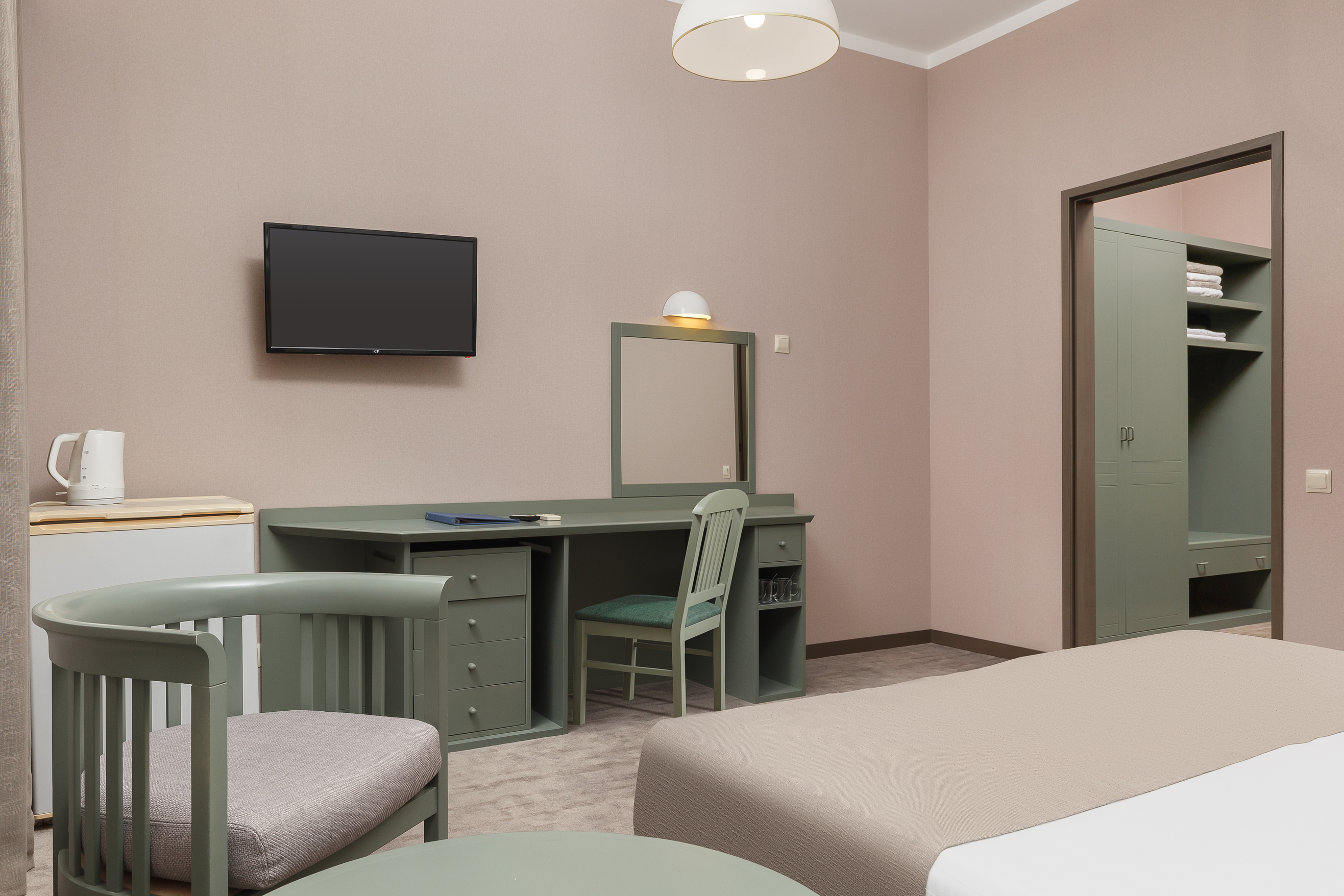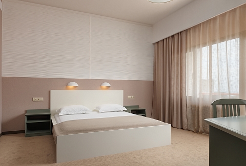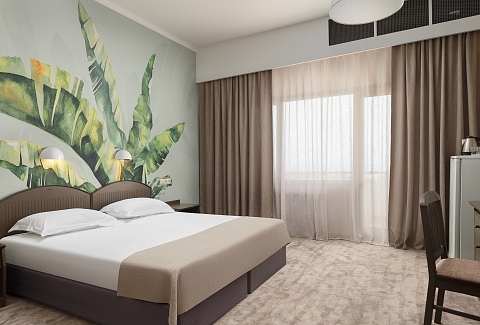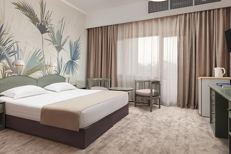 В номере: вешалка, зеркало, кровать двуспальная, прикроватные тумбочки, столик туалетный, стул, шкаф, сейф, сплит-система, телевизор, холодильник, чайный набор посуды, электрочайник
