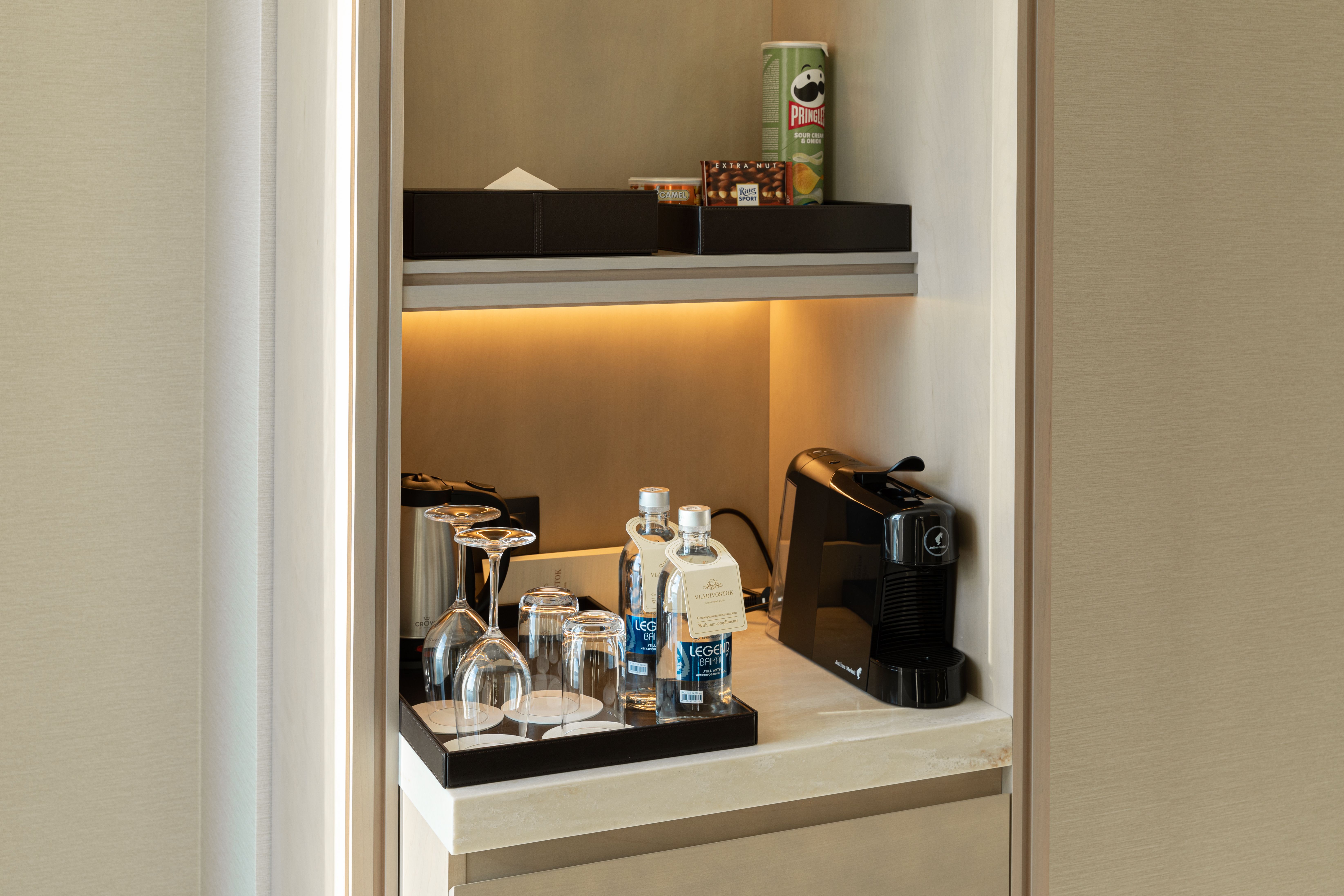 В номере: вешалка, диван, зеркало, кресло, кровать двуспальная, прикроватные тумбочки, стол, стулья, шкаф, кондиционер, кофемашина, сейф, телевизор, телефон, утюг, чайный набор посуды, электрочайник