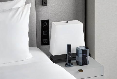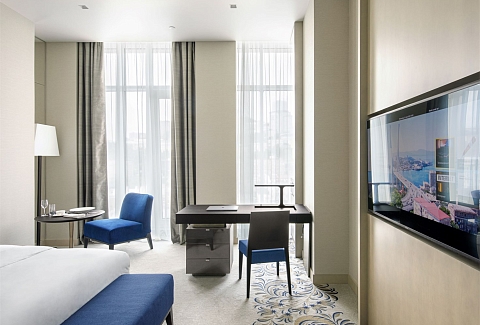 В номере: вешалка, зеркало, кровать двуспальная, прикроватные тумбочки, стол, стулья, шкаф, гладильная доска, кондиционер, кофемашина, сейф, телевизор, телефон, утюг, чайный набор посуды, электрочайник