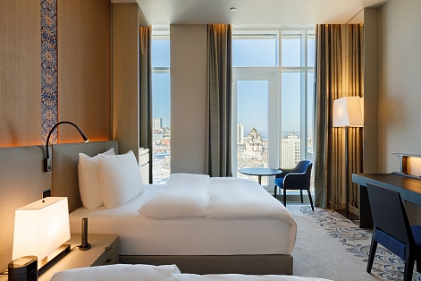 Меню представлено блюдами авторской кухни с яркими локальными акцентами. Лобби-бар «Сапфир» приглашает гостей Отеля насладиться приятной живой музыкой и широким выбором премиальных напитков.Отель удобно расположен на Корабельной набережной, в престижной локации исторического центра Владивостока, где сосредоточены основные достопримечательности.В пяти минутах от отеля, в непосредственной близости от грандиозного вантового моста через бухту Золотой Рог, расположена набережная Цесаревича – одна из самых популярных точек притяжения для прогулок и отдыха во Владивостоке.