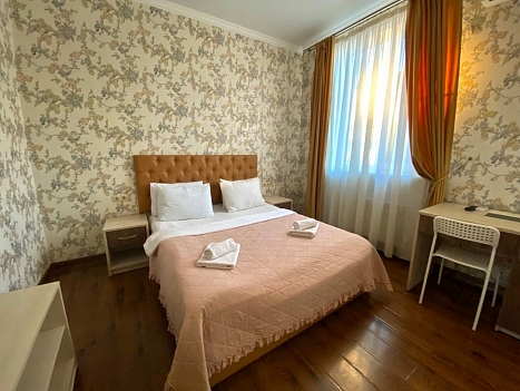 В номере: вешалка, диван, зеркало, кровать двуспальная, прикроватные тумбочки, стол, стул, шкаф, набор посуды, телевизор, холодильник, чайный набор посуды, электрочайник