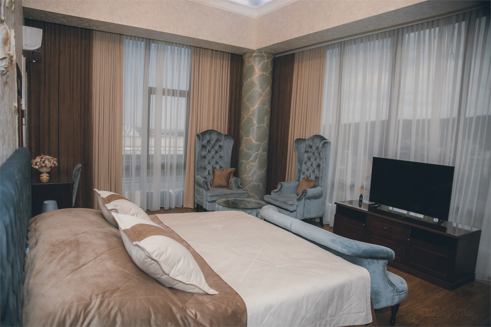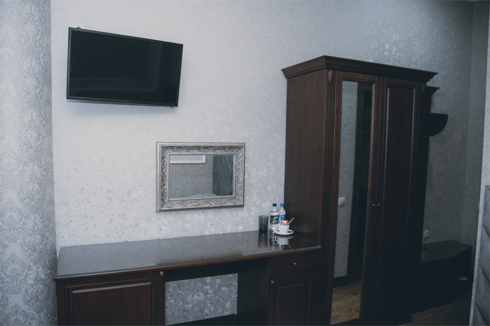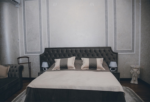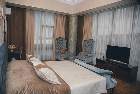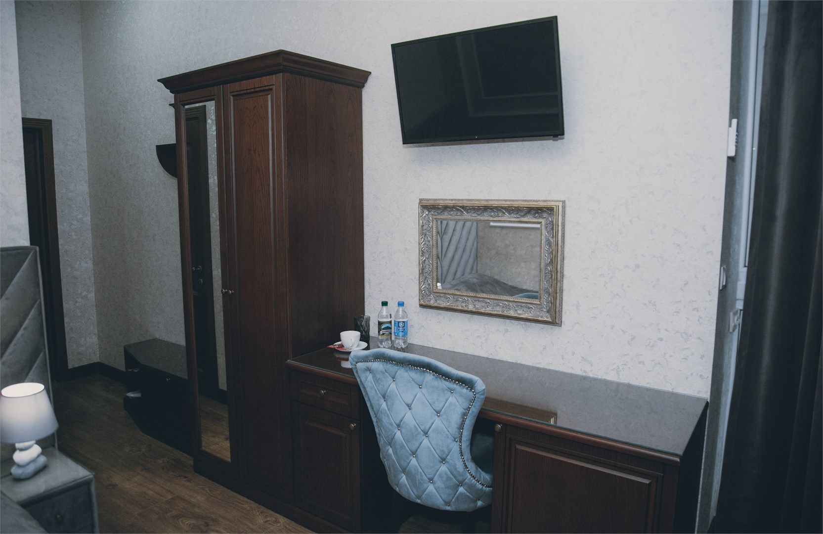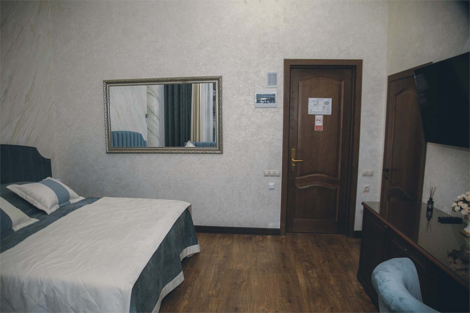 В номере: вешалка, диван, зеркало, кровать двуспальная, прикроватные тумбочки, стол, стул, шкаф, кондиционер, сейф, телевизор, холодильник