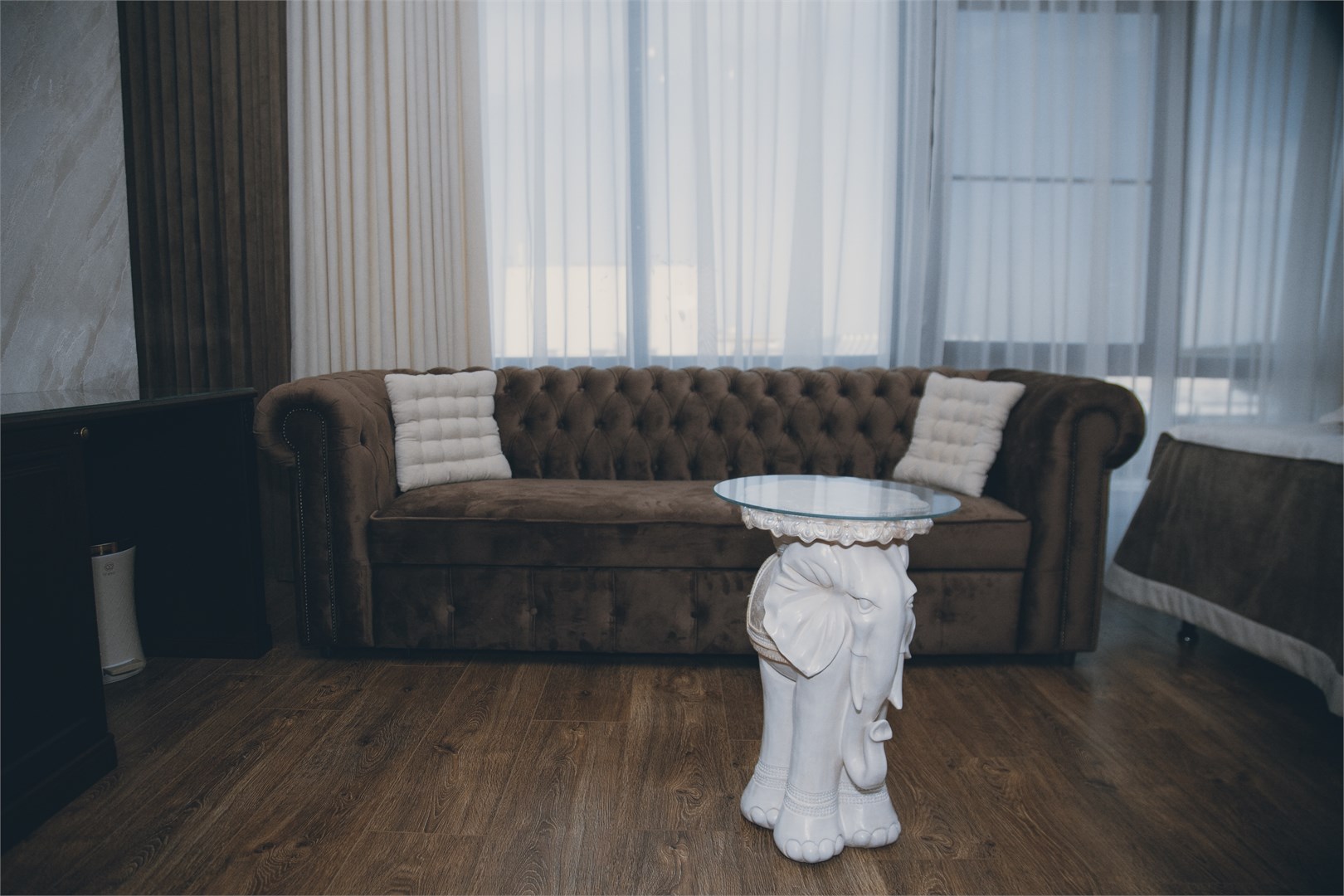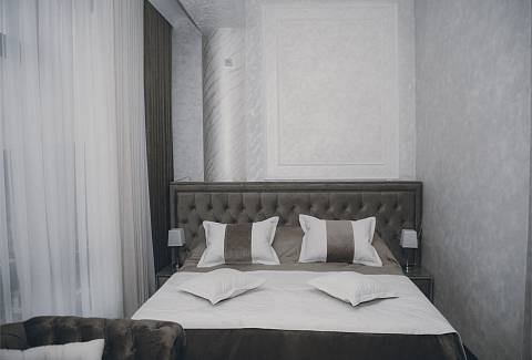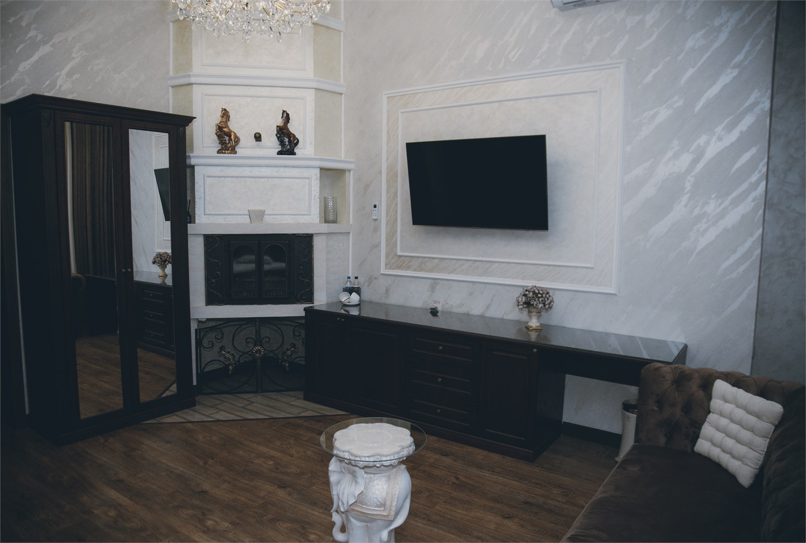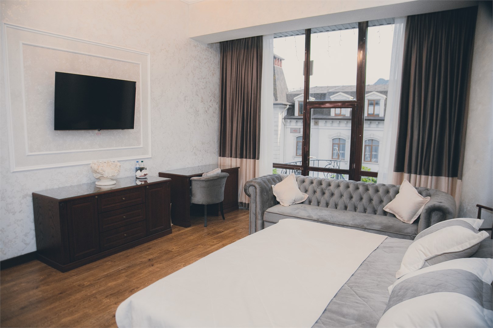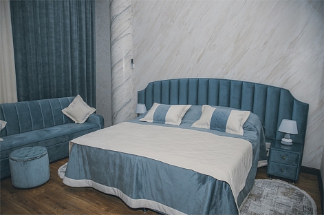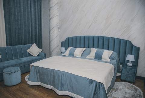 В номере: вешалка, диван, зеркало, кровать двуспальная, прикроватные тумбочки, стол, стул, шкаф, кондиционер, сейф, телевизор, холодильник