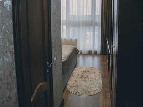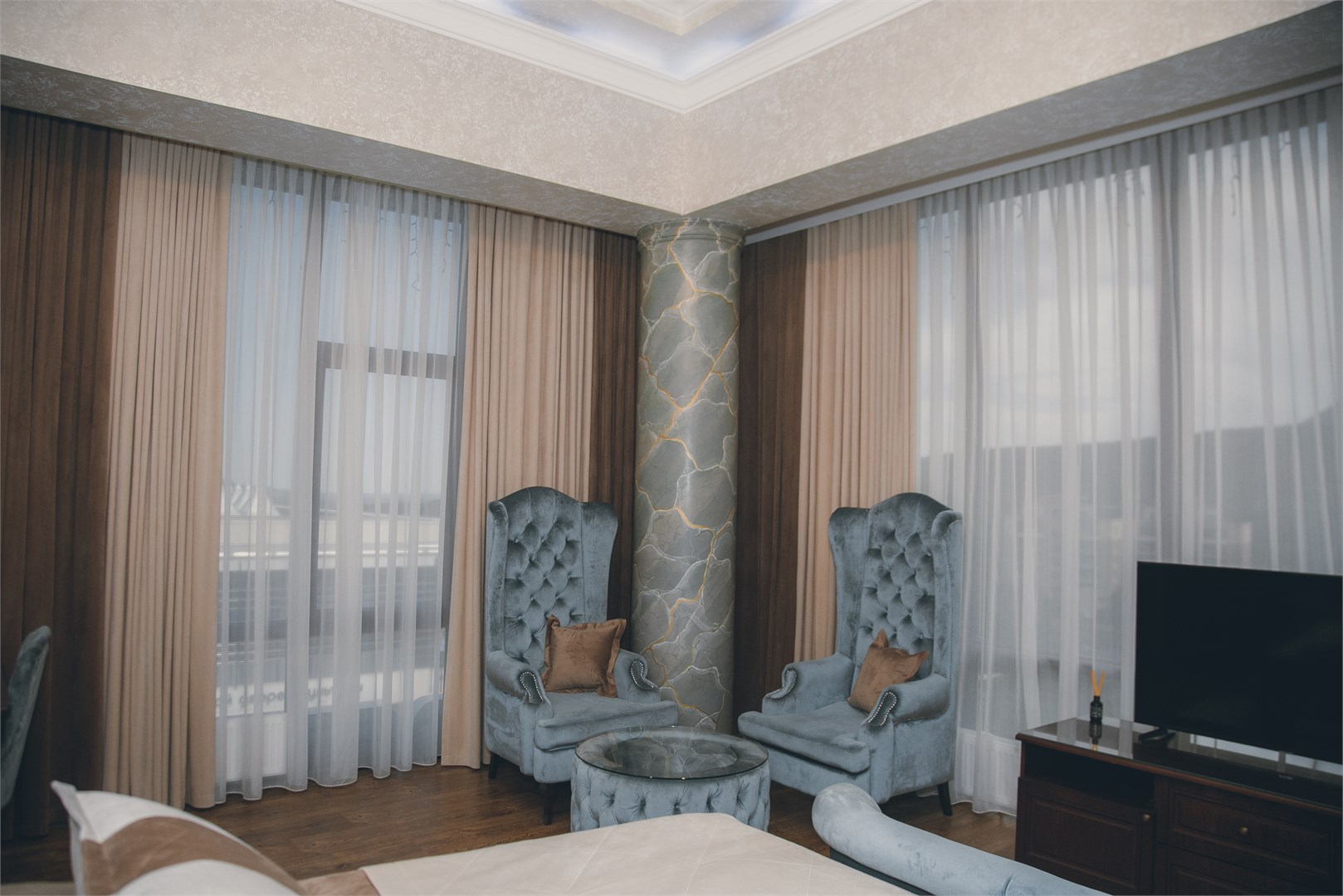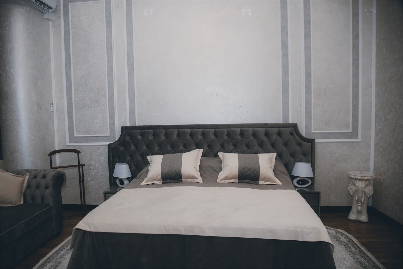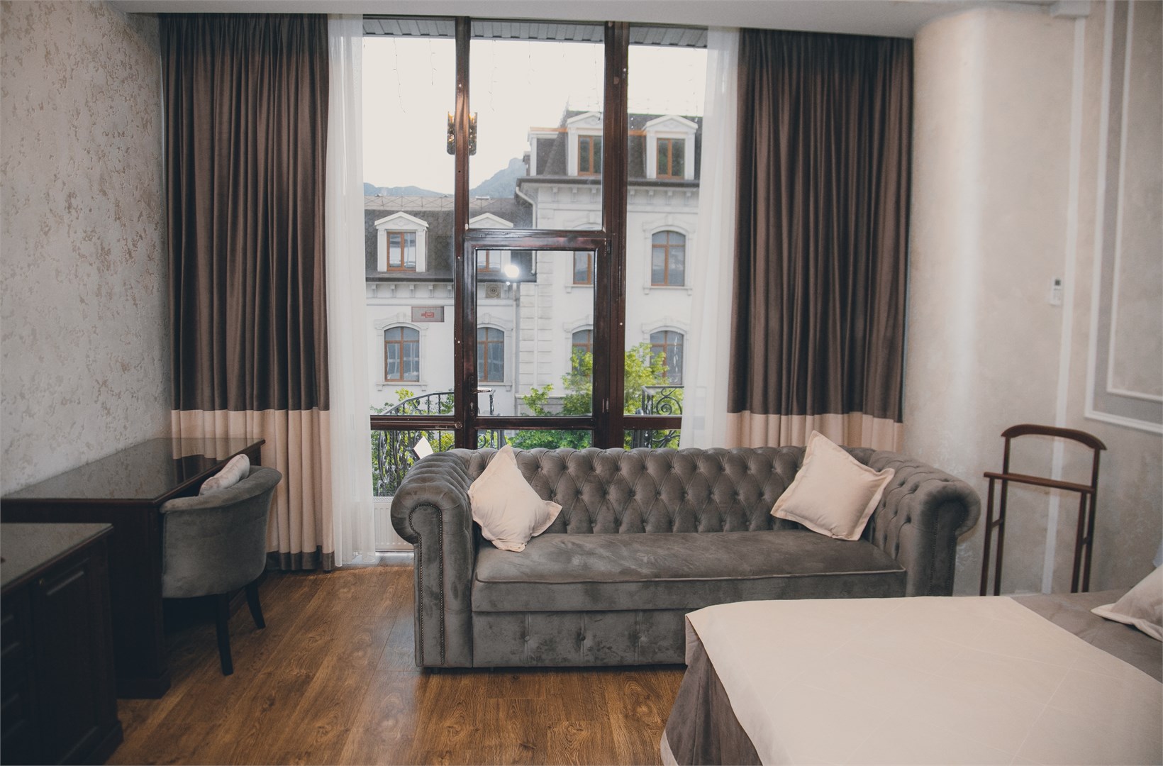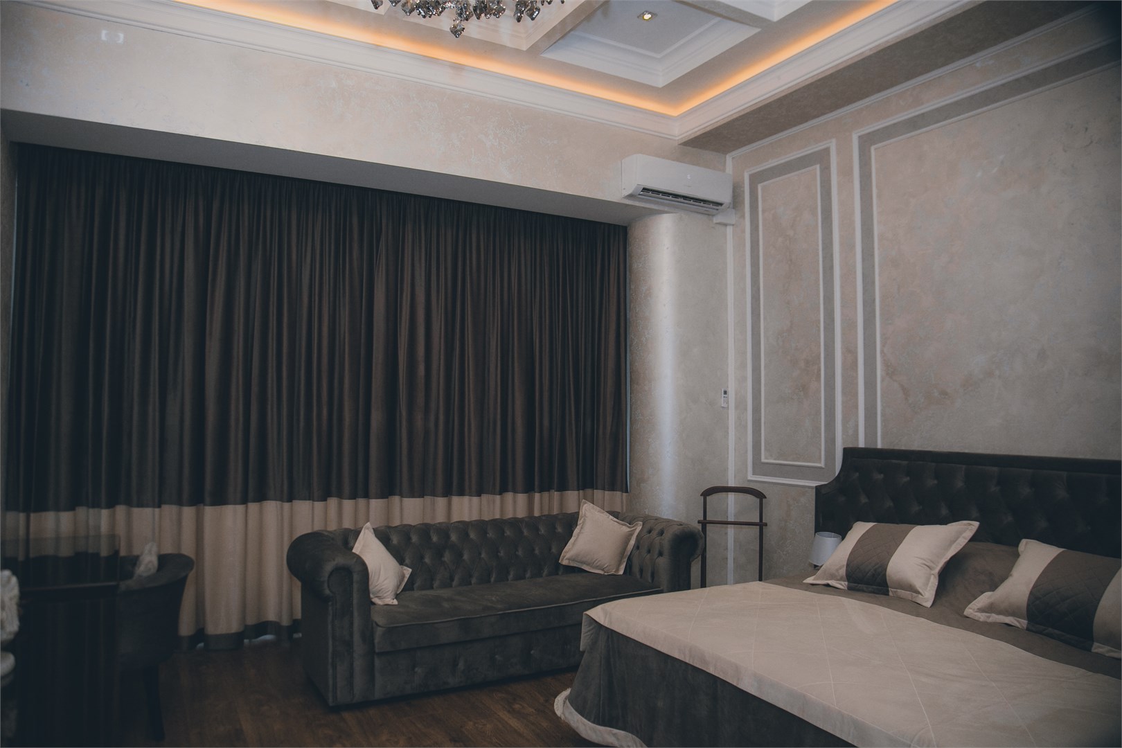 В номере: вешалка, диван, зеркало, кровать двуспальная, прикроватные тумбочки, стол, стул, шкаф, кондиционер, сейф, телевизор, холодильник