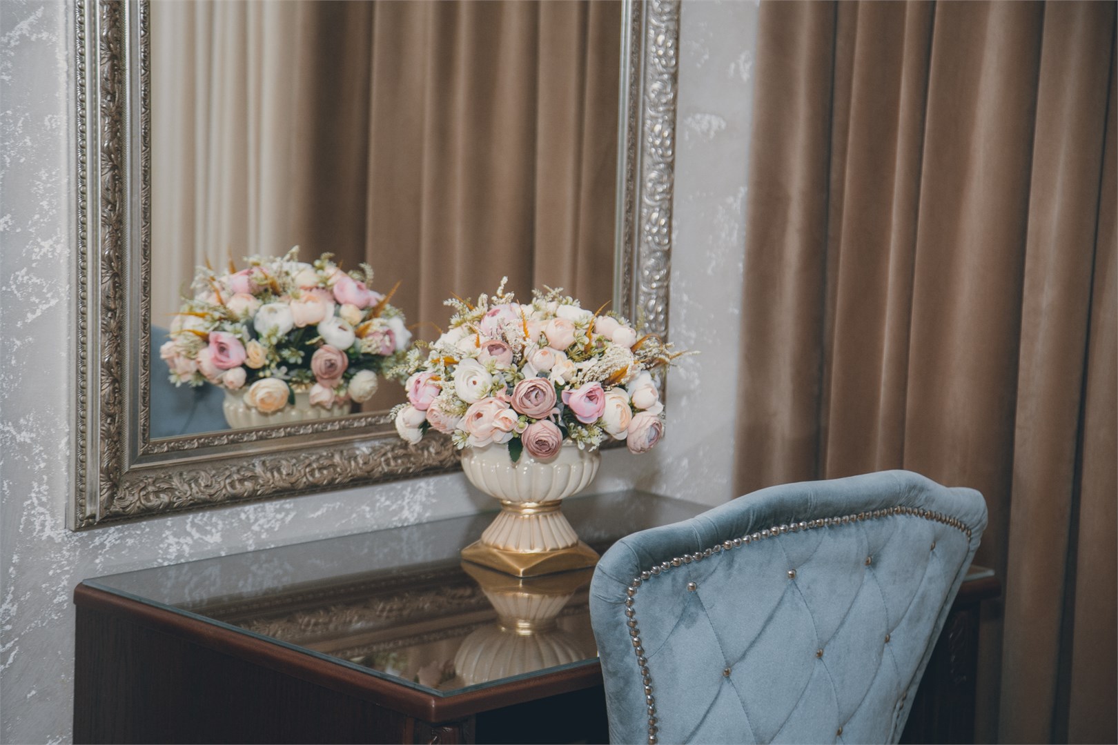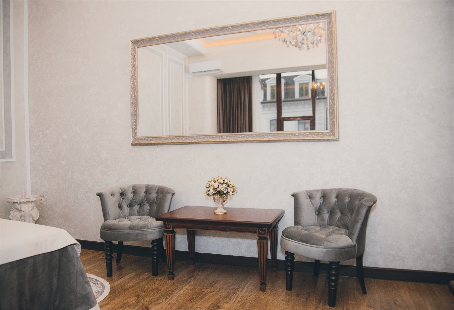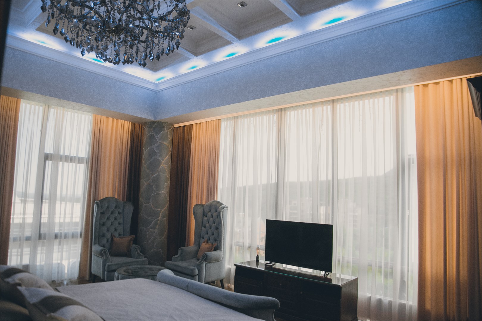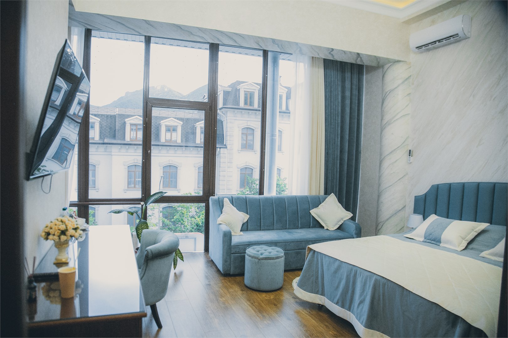 В номере: вешалка, диван, зеркало, кровать двуспальная, прикроватные тумбочки, стол, стул, шкаф, кондиционер, сейф, телевизор, холодильник