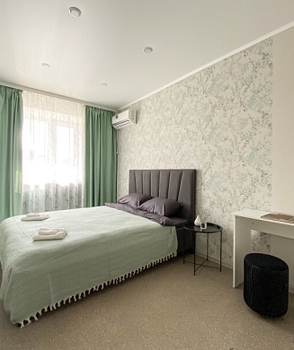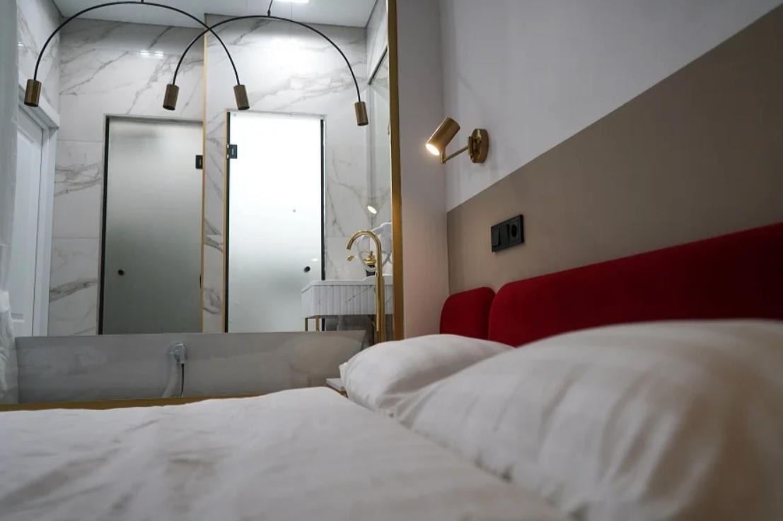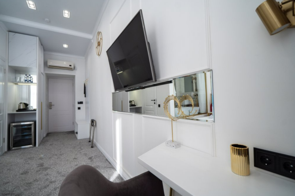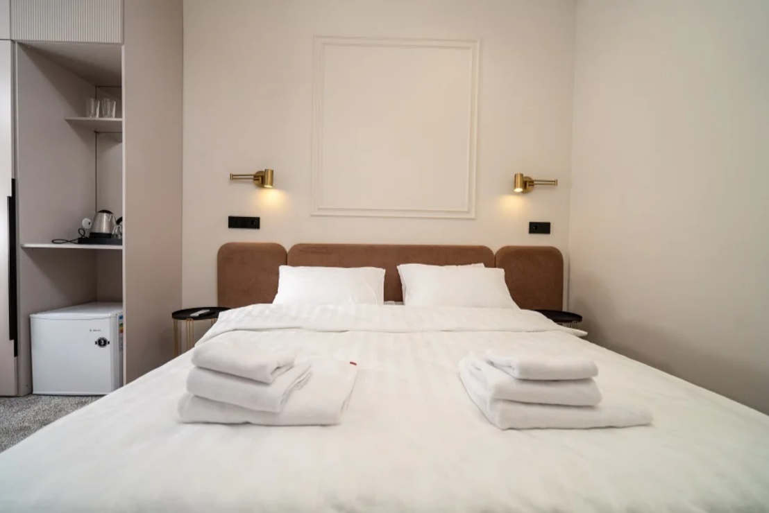 В номере: вешалка, зеркало, кровать двуспальная, прикроватные тумбочки, стол, стул, шкаф, гладильная доска, кондиционер, мини-холодильник, сейф, телевизор, утюг, электрочайник
