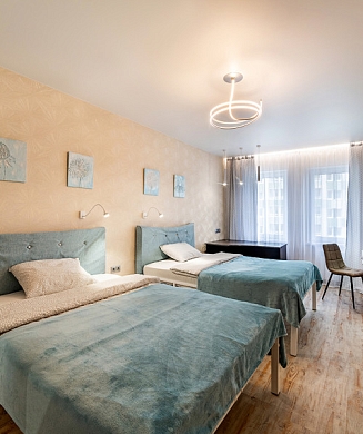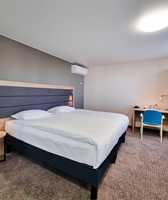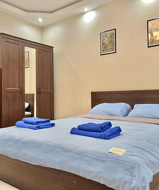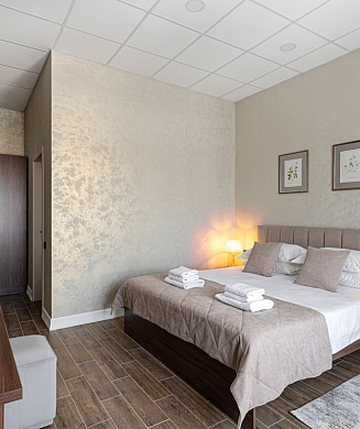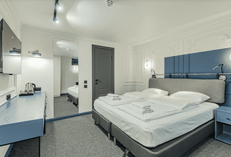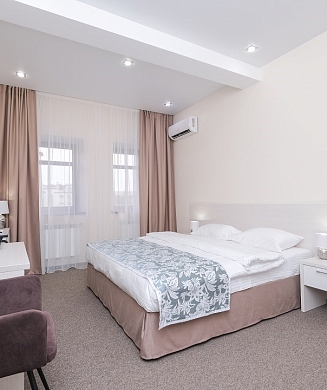 В номере: вешалка, зеркало, кровать двуспальная/ две полутороспальные кровати, прикроватные столики, стол, стул, шкаф, гладильная доска, кондиционер, мини-холодильник, сейф, утюг, электрочайник