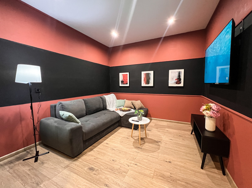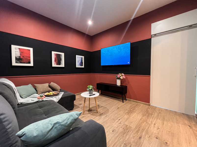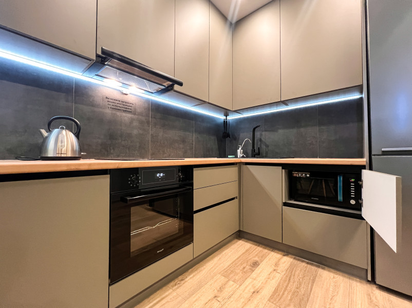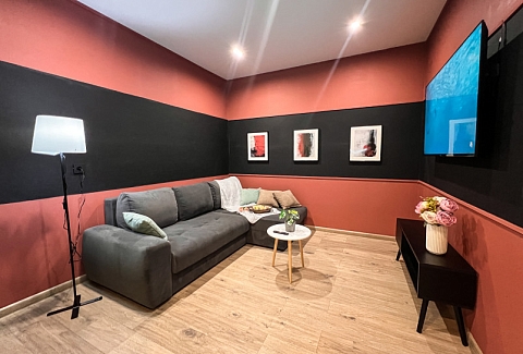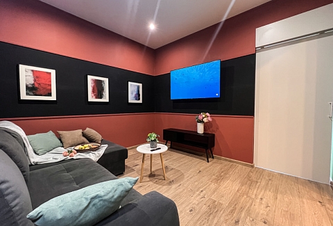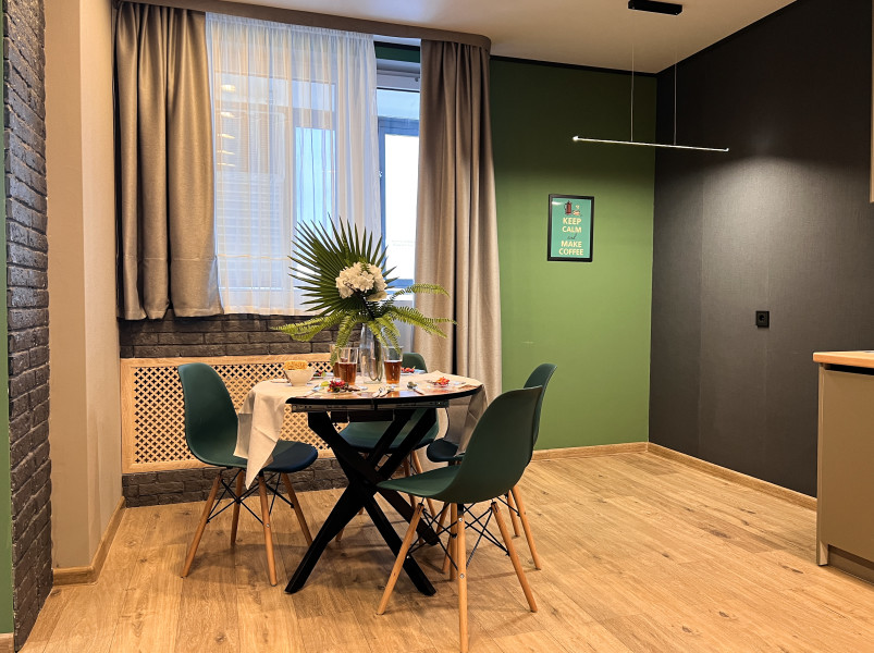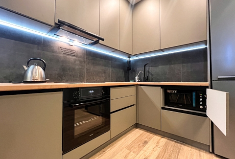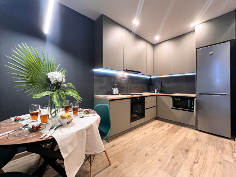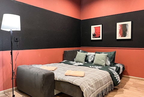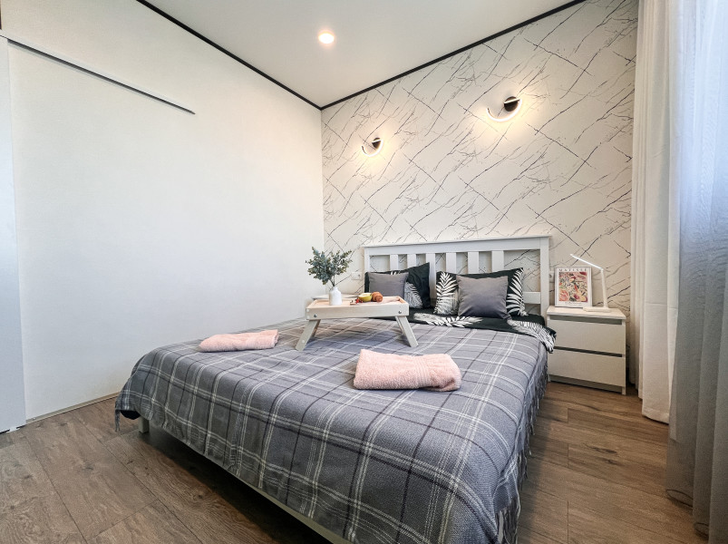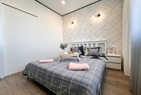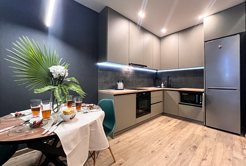 В номере: вешалка, диван раскладной, кровать двуспальная, прикроватные тумбочки, стол, стулья, шкаф, гладильная доска, кондиционер, набор посуды, плита индукционная, стиральная машина, телевизор, утюг, холодильник