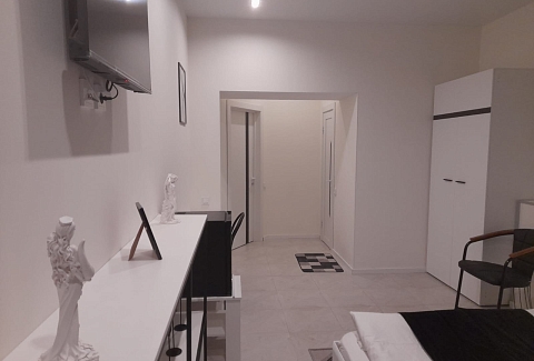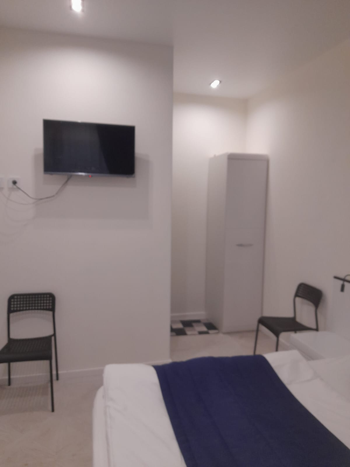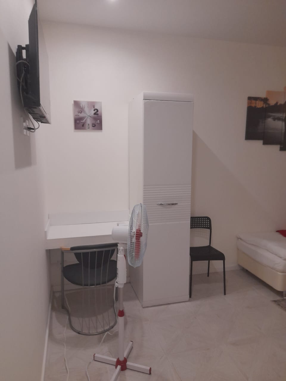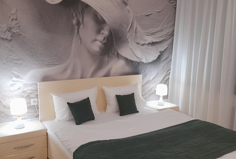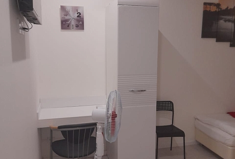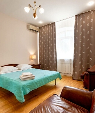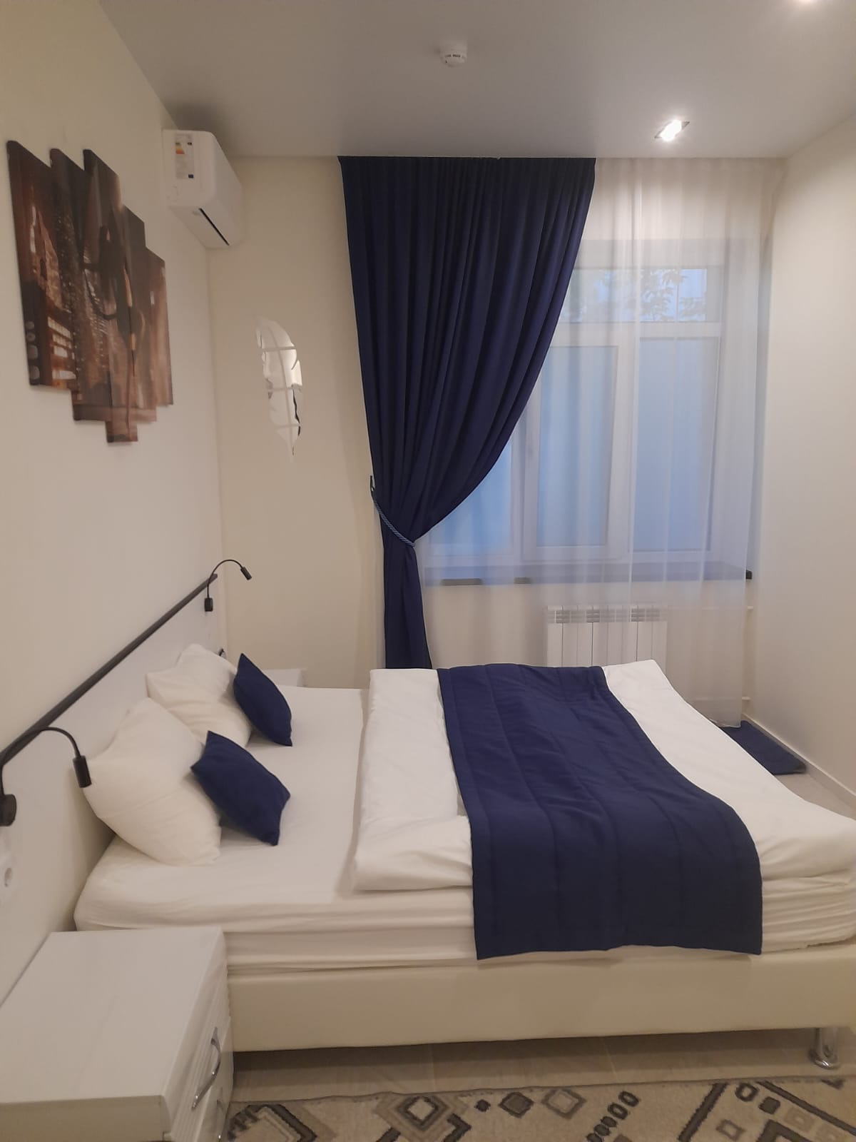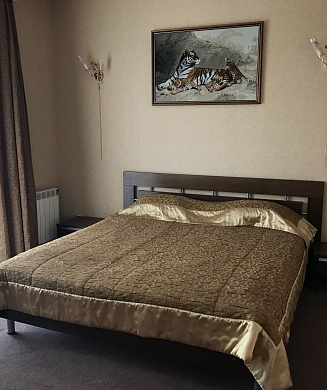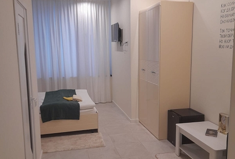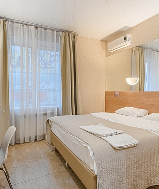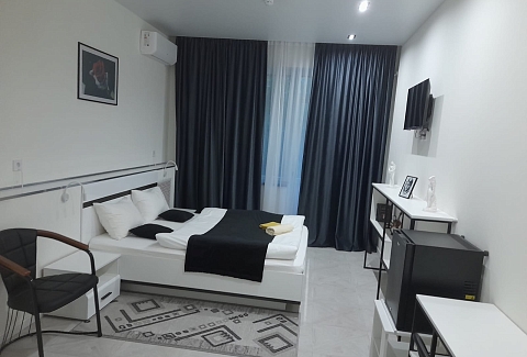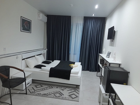 В номере: кресло, кровать двуспальная, прикроватные тумбочки, стол, шкаф, кондиционер, мини-холодильник, телевизор