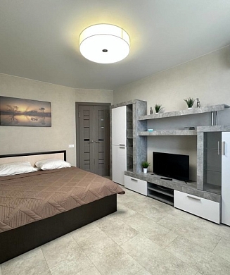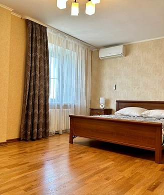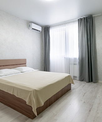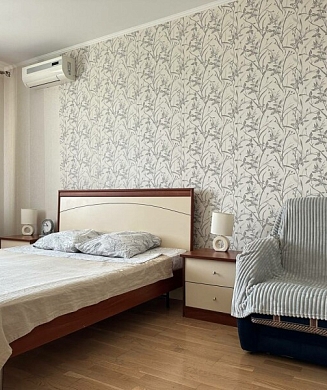 В номере: кресло, кровать двуспальная, прикроватные тумбочки, шкаф, кондиционер, телевизор
