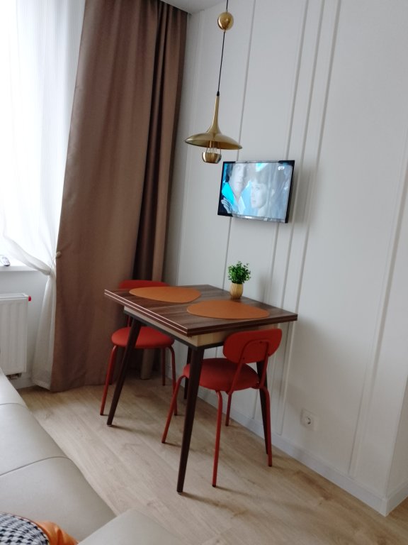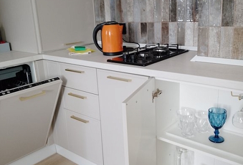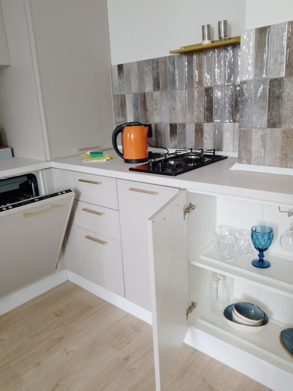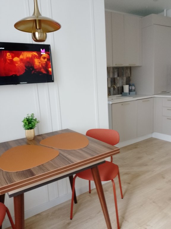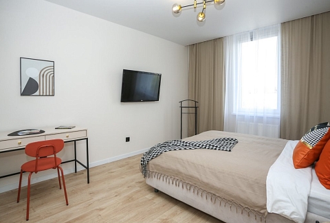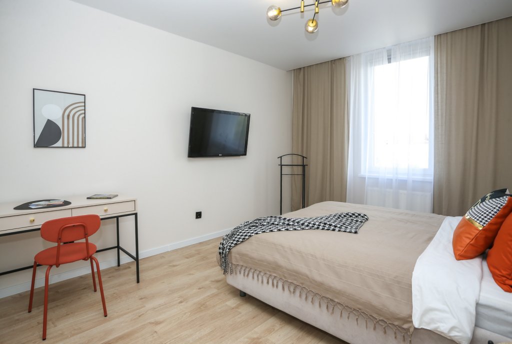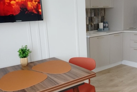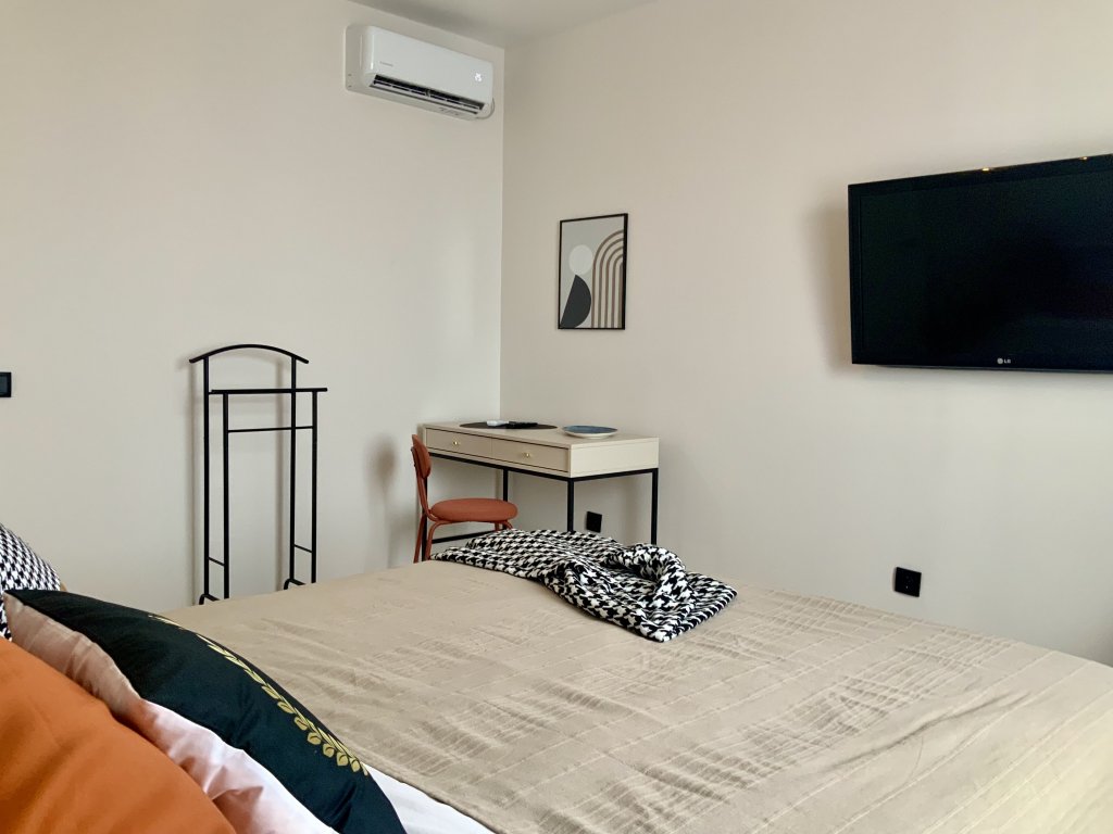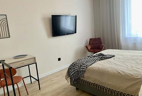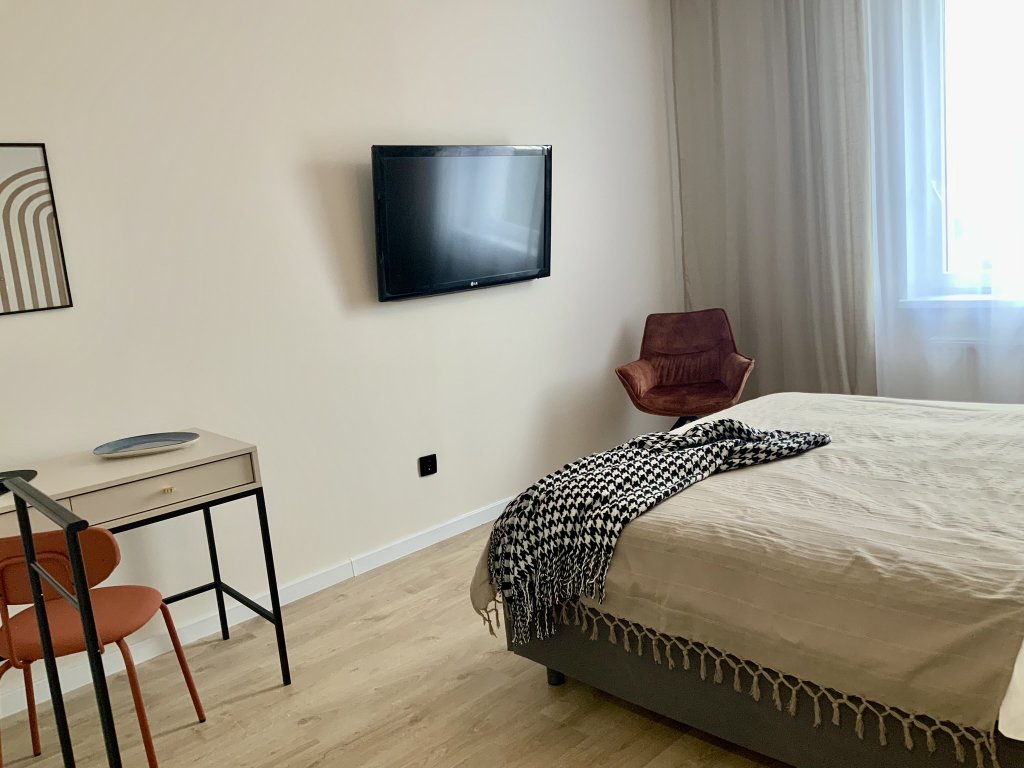 К услугам гостей светлый уютный номер с кухней, спальней и ванной комнатой. Апартаменты укомплектованы необходимой мебелью и техникой: есть двуспальная кровать, утюг, фен, кондиционер, телевизор-ЖК, стиральная и посудомоечная машины, плита, микроволновая печь, холодильник. В ванной комнате – для гостей подготовлены косметические принадлежности. Среди услуг – безлимитный интернет, парковка и детская площадка возле здания.