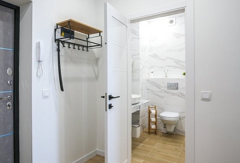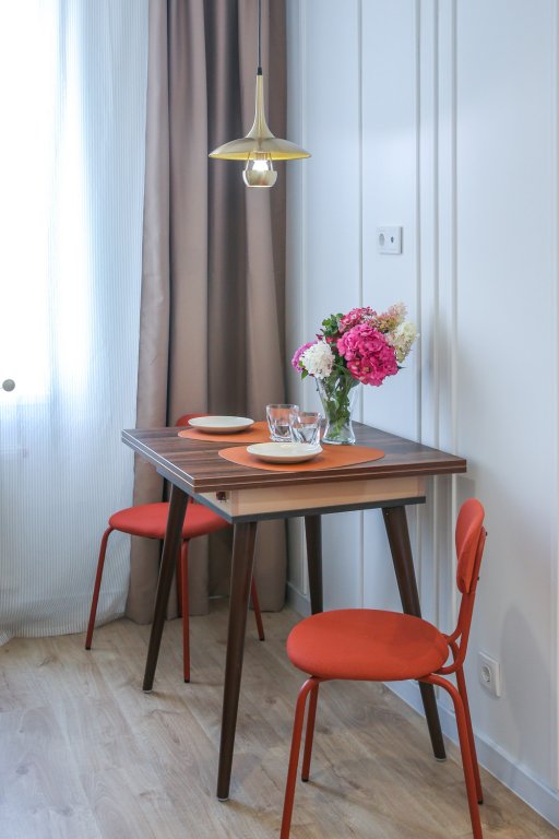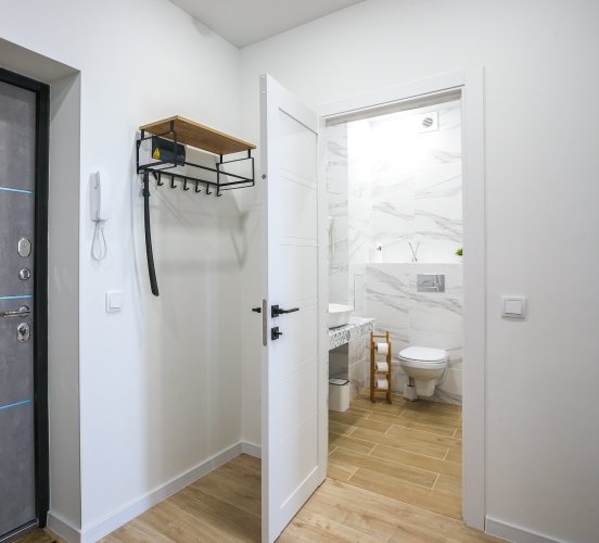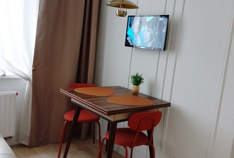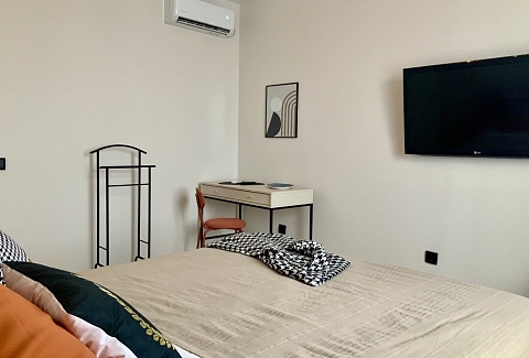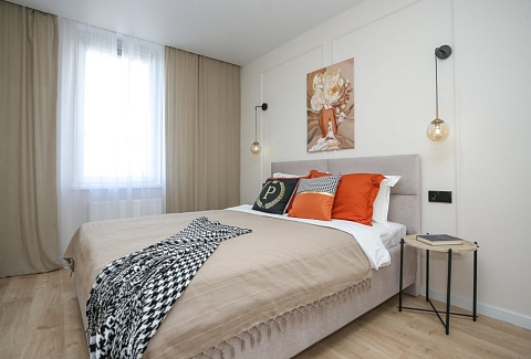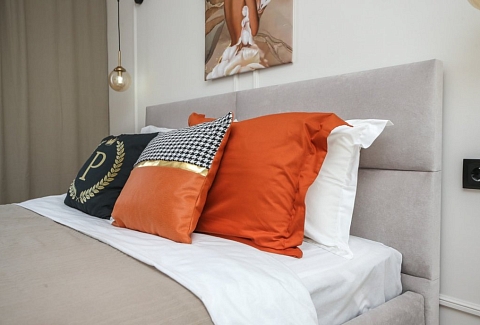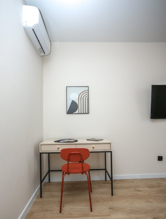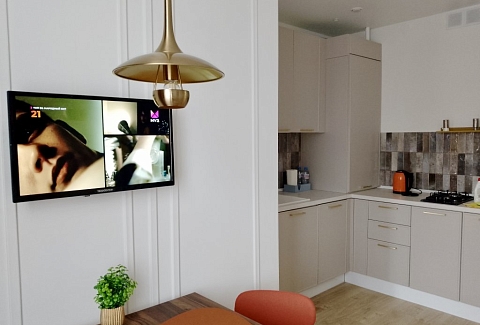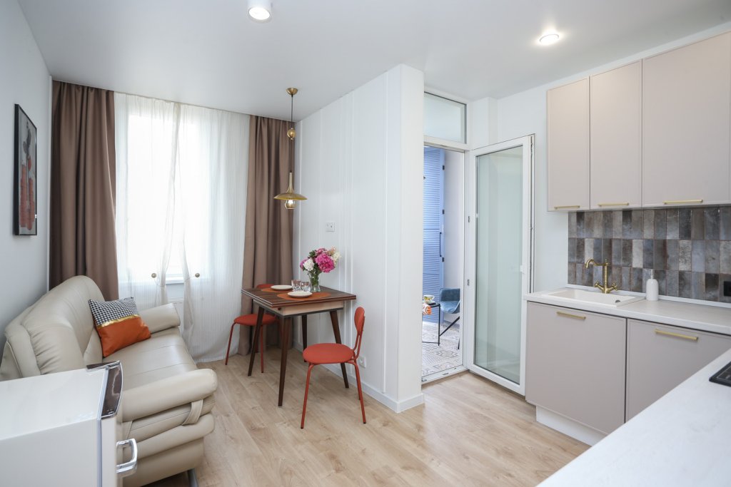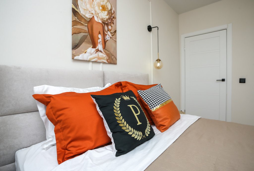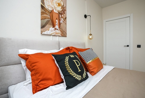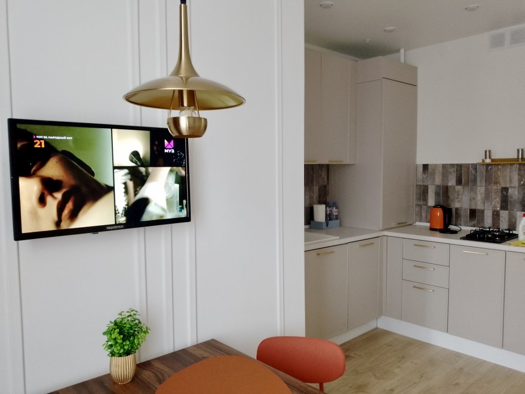 К услугам гостей светлый уютный номер с кухней, спальней и ванной комнатой. Апартаменты укомплектованы необходимой мебелью и техникой: есть двуспальная кровать, утюг, фен, кондиционер, телевизор-ЖК, стиральная и посудомоечная машины, плита, микроволновая печь, холодильник. В ванной комнате – для гостей подготовлены косметические принадлежности. Среди услуг – безлимитный интернет, парковка и детская площадка возле здания.