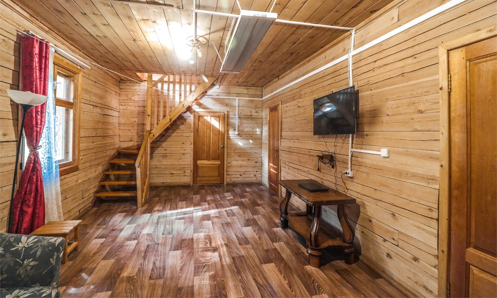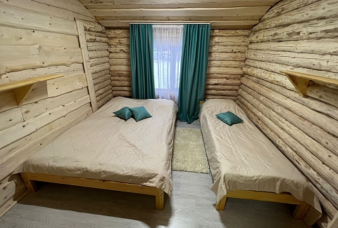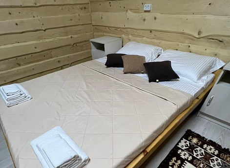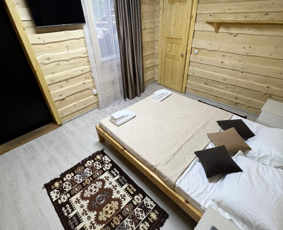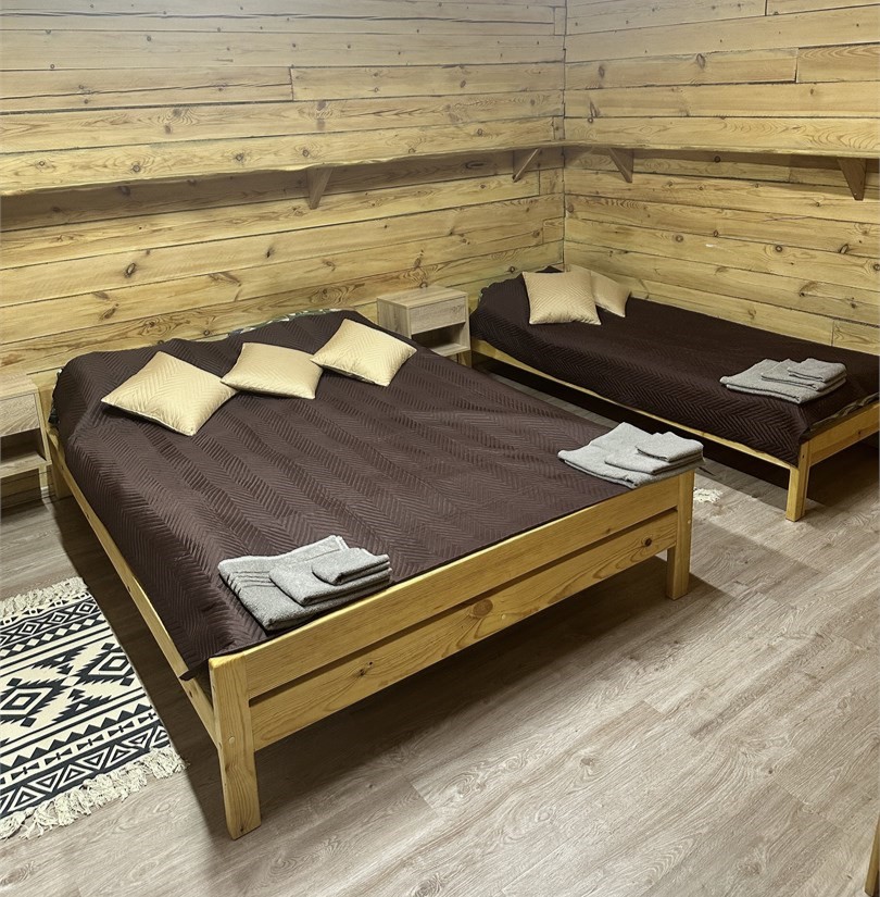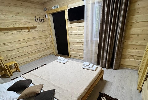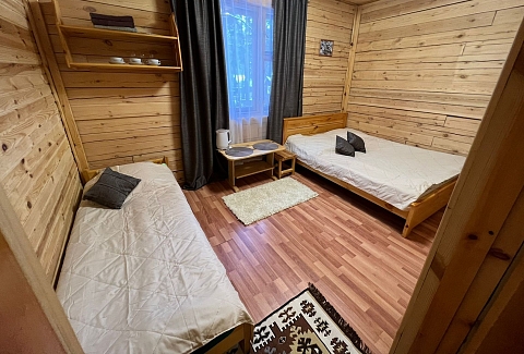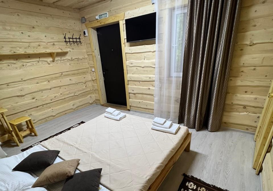 В номере: вешалка, диван раскладной, кровати односпальные, кровать двуспальная, обувная полка, стол, тумба, микроволновая печь, набор посуды, телевизор, теплый пол, холодильник, электрочайник