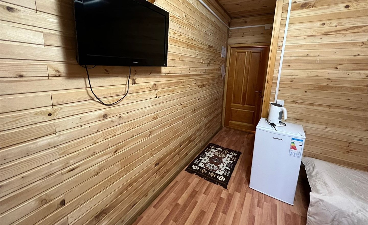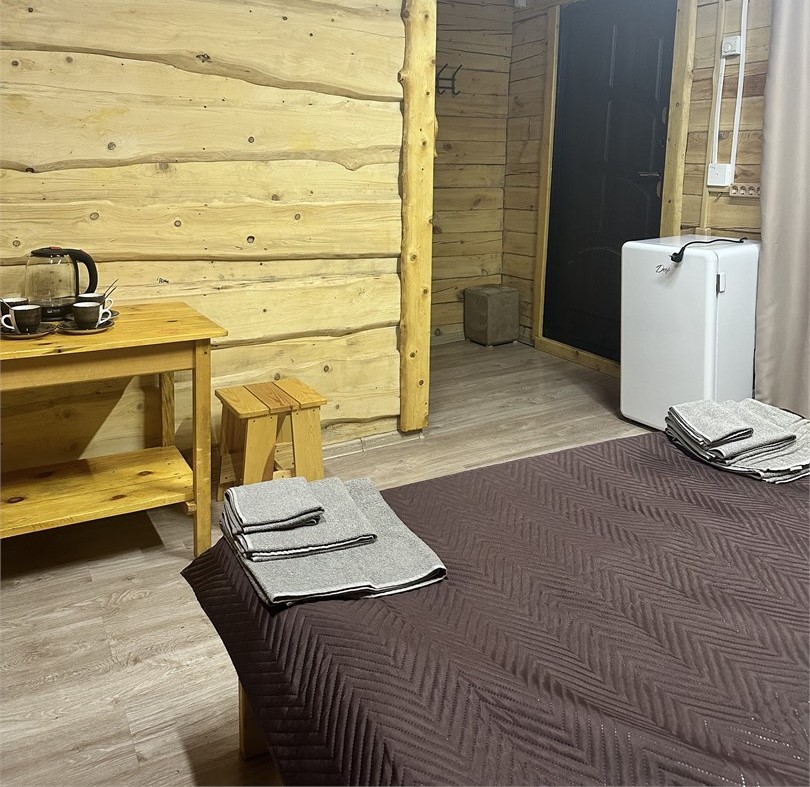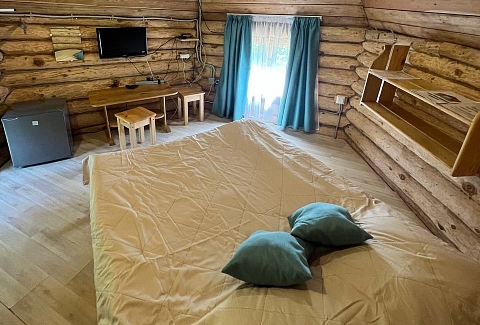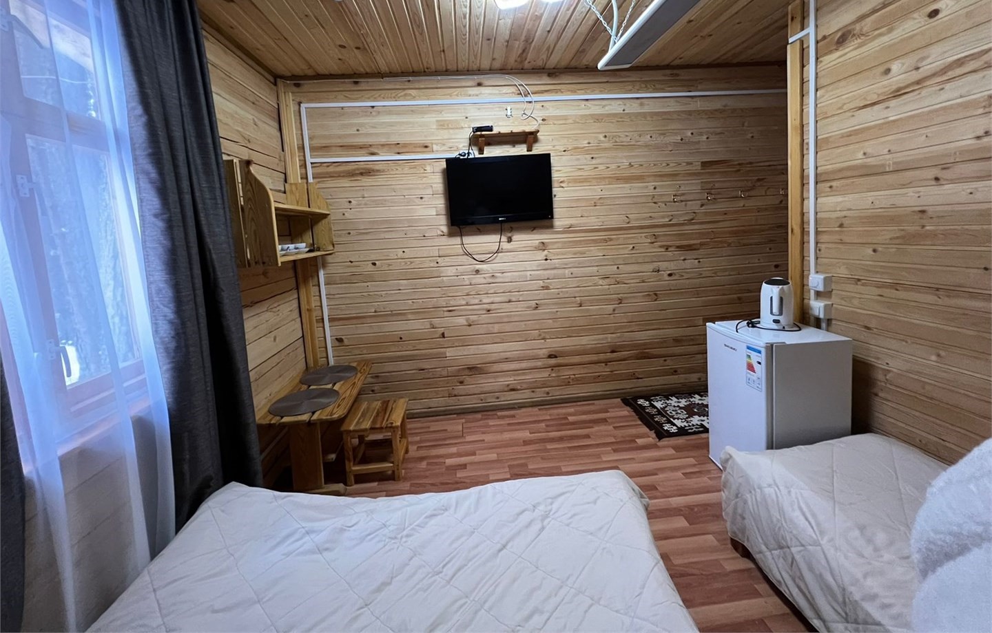 В номере: вешалка, кровать двуспальная, кровать односпальная, стол, стул, телевизор, теплый пол, холодильник, чайный набор посуды, электрочайник