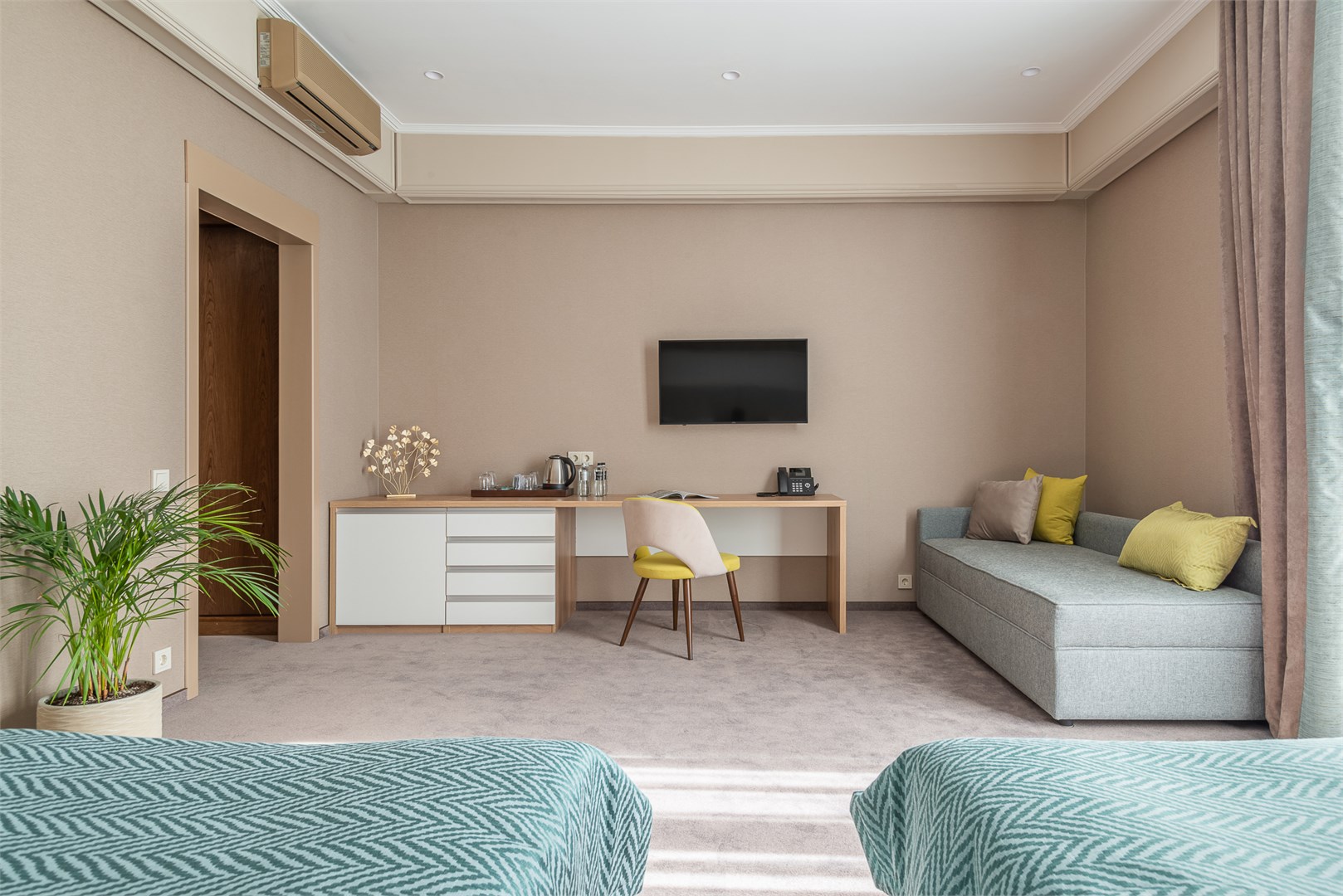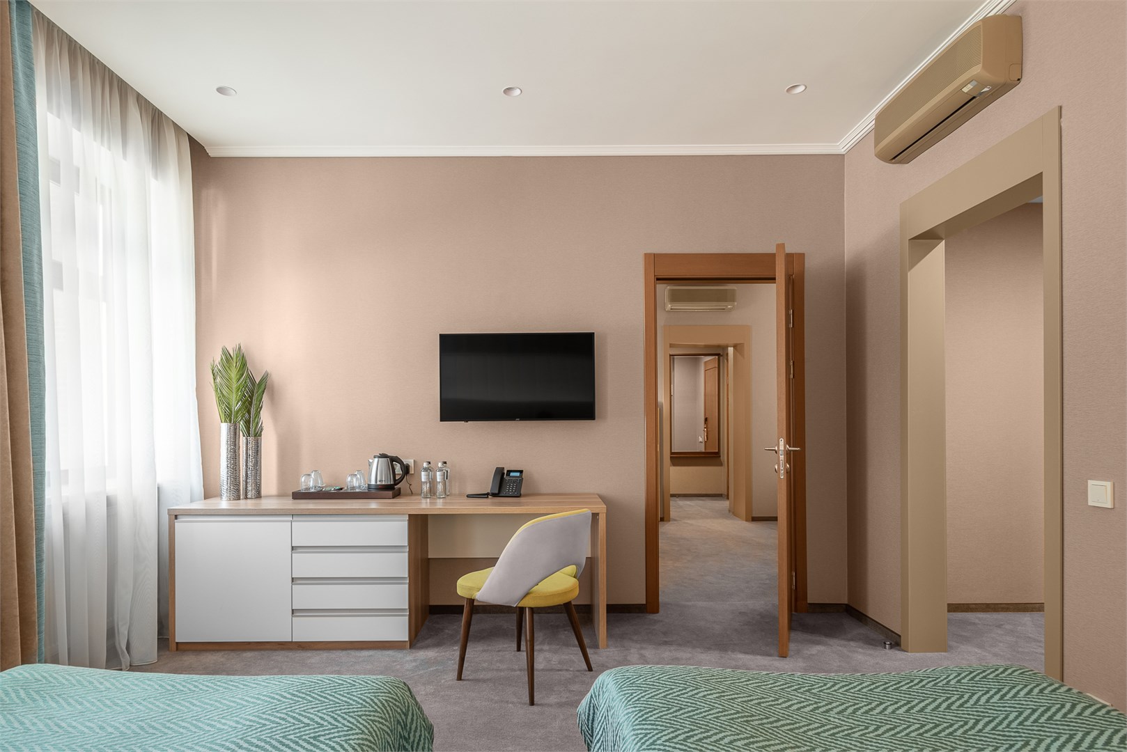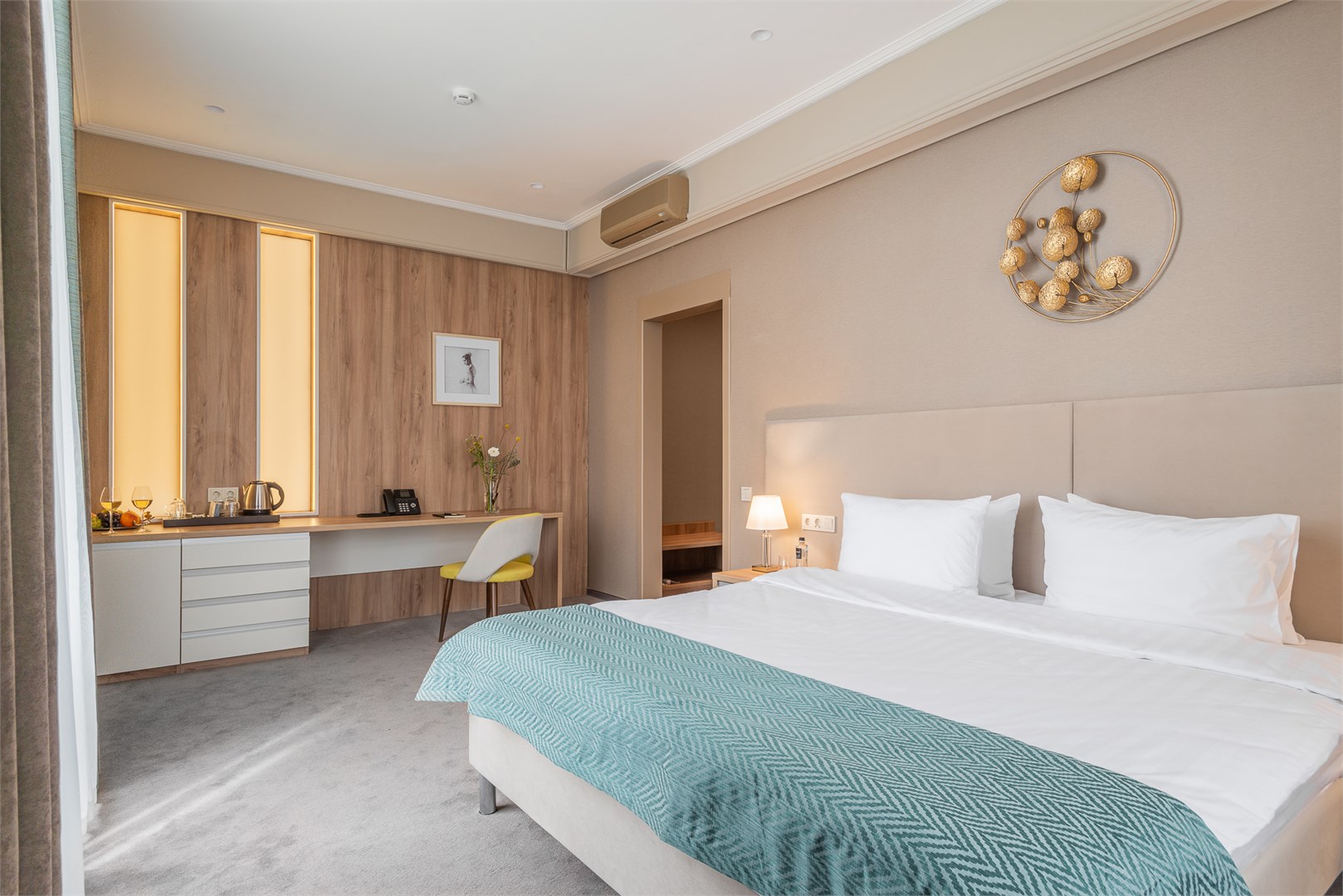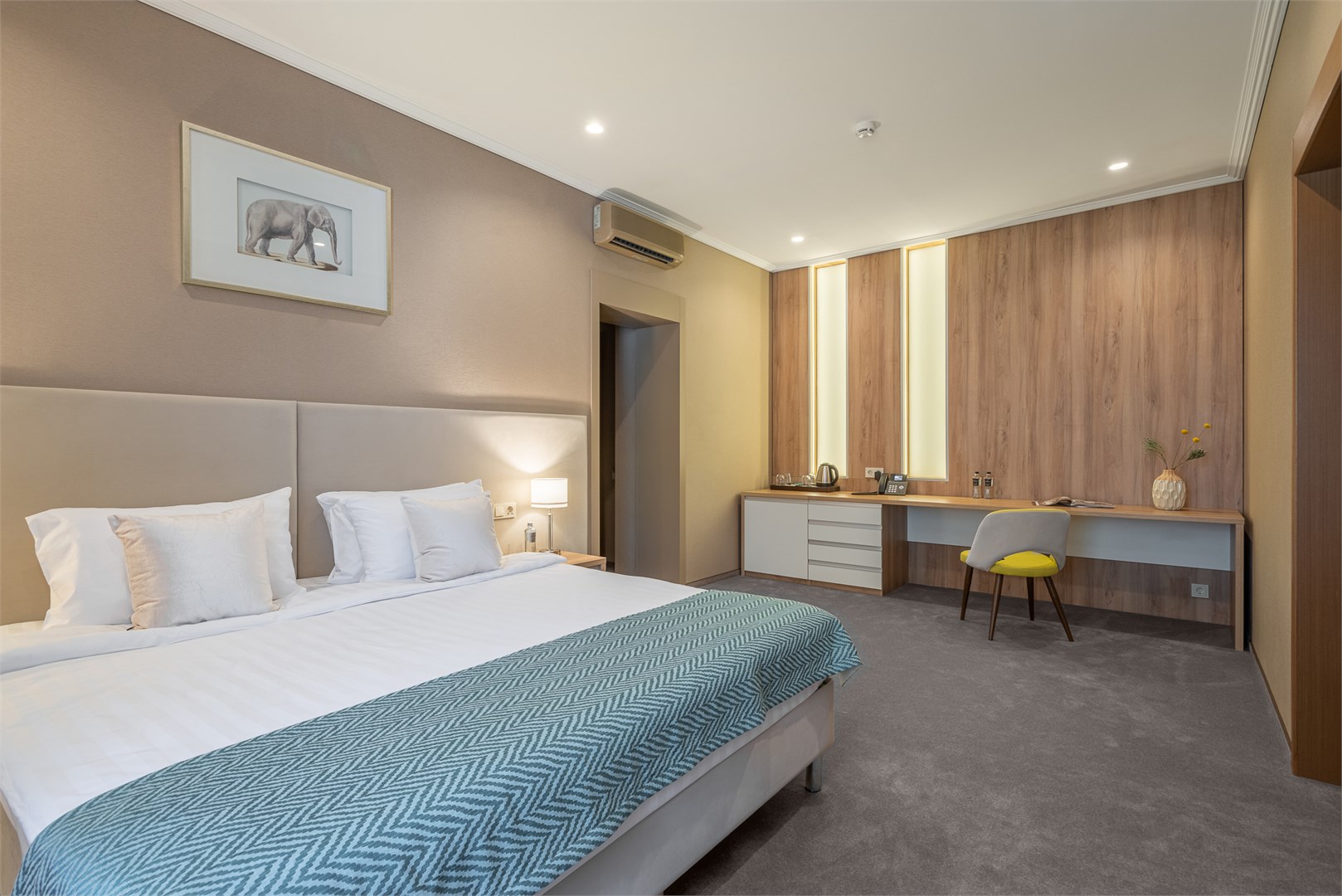 В номере: вешалка, диван раскладной, кровать двуспальная, прикроватные тумбочки, стол, стулья, шкаф, кондиционер, сейф, телевизор, телефон, чайная станция