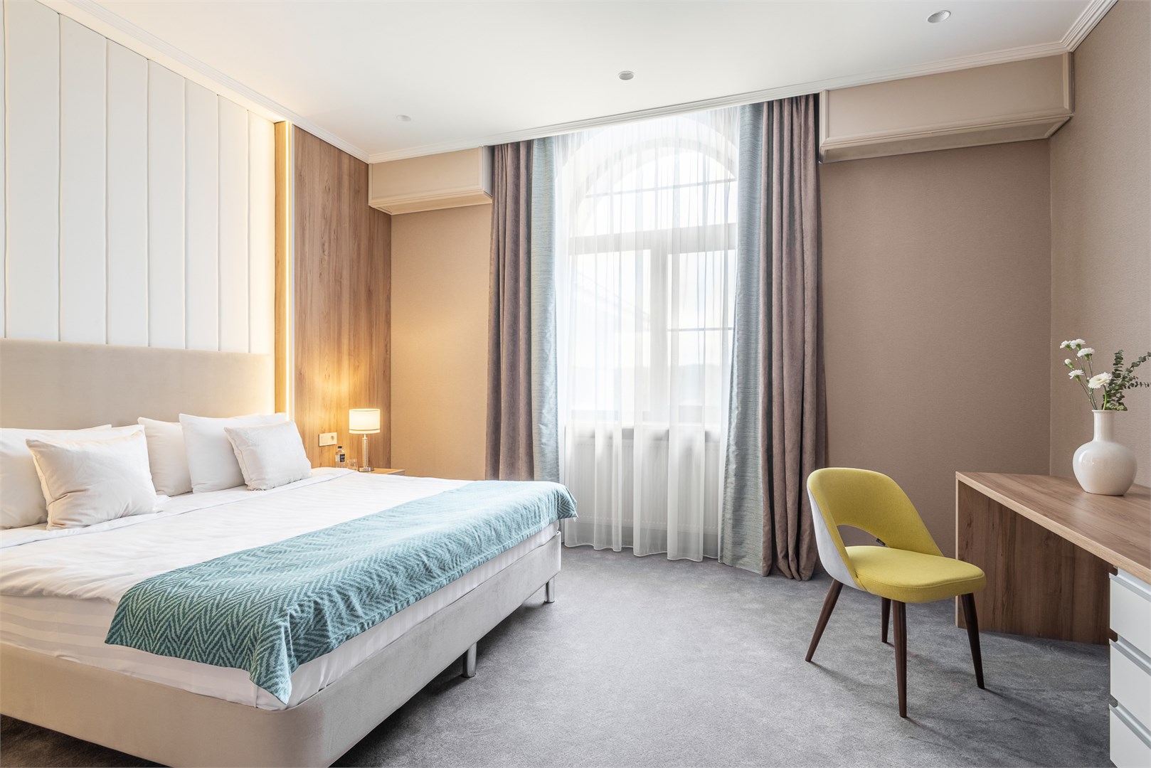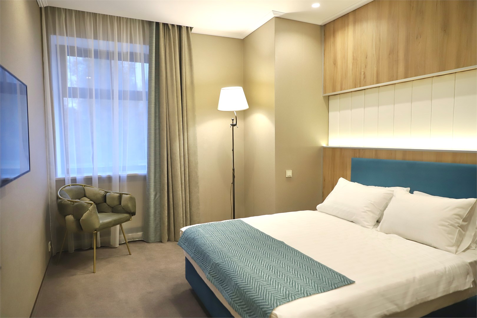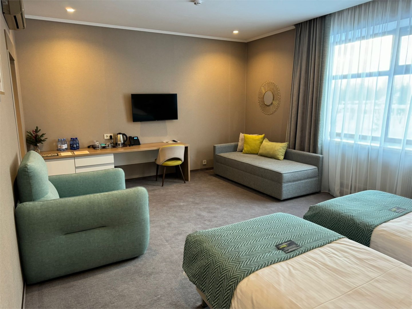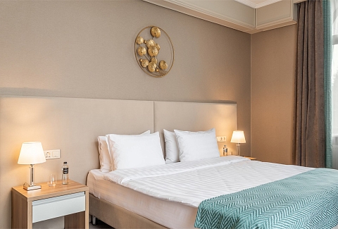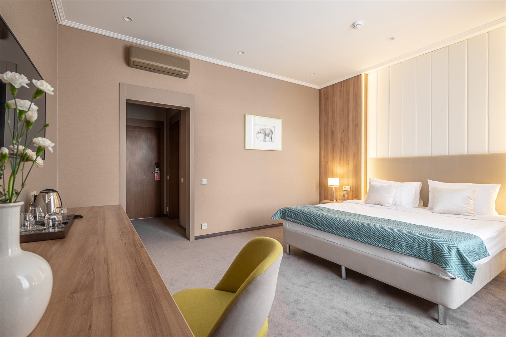 В номере: вешалка, диван раскладной, кровать двуспальная, прикроватные тумбочки, стол, стулья, шкаф, кондиционер, сейф, телевизор, телефон, чайная станция