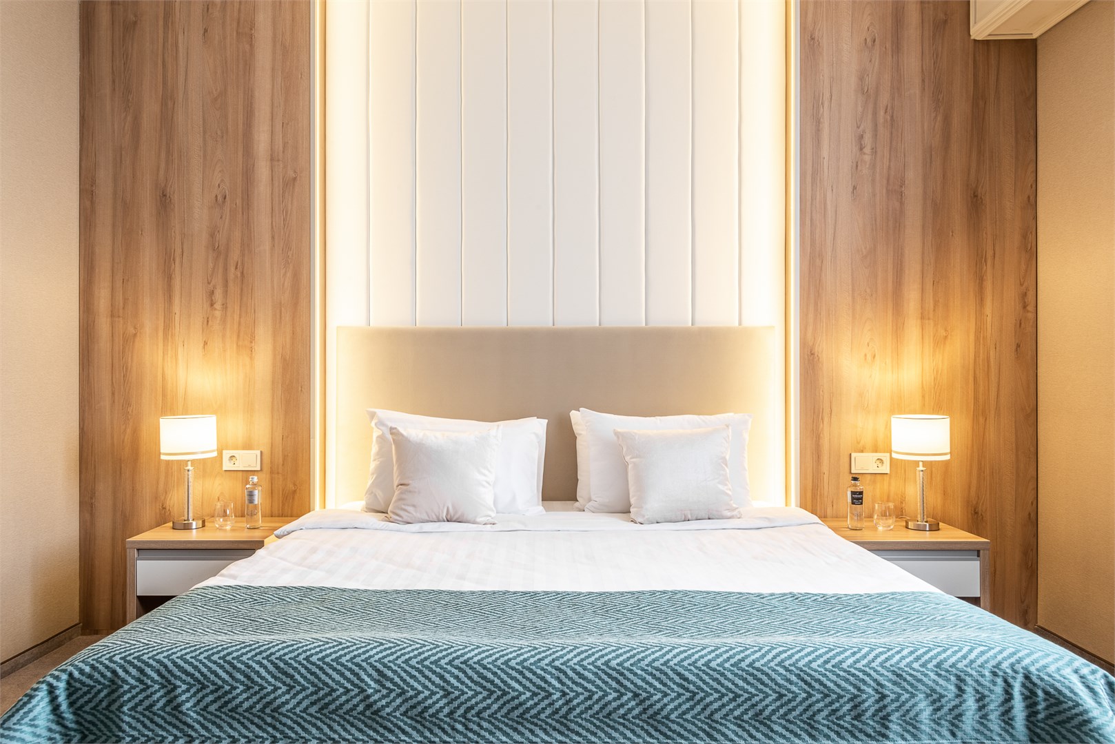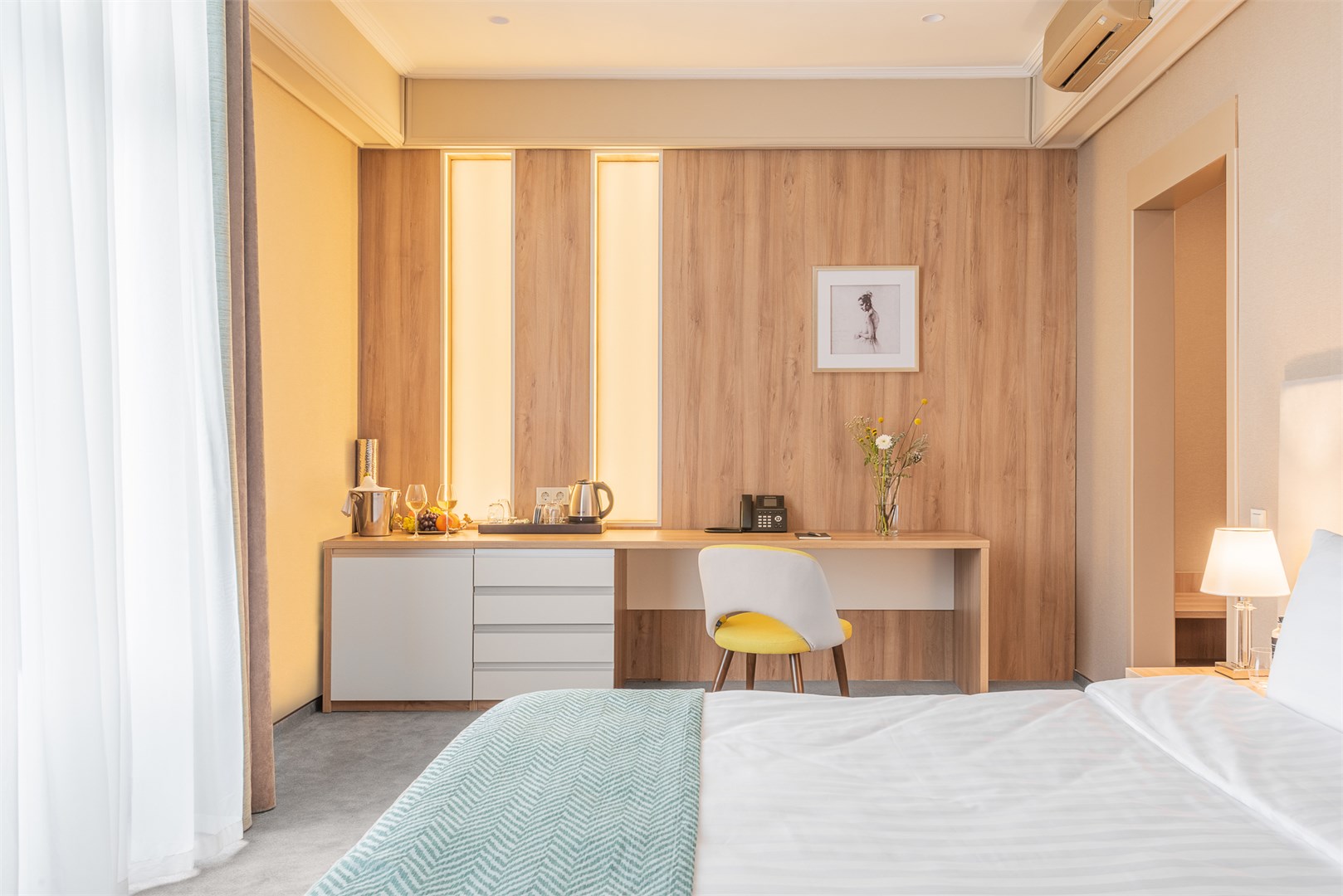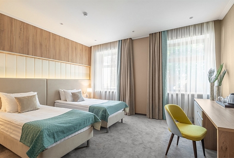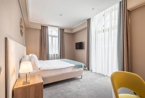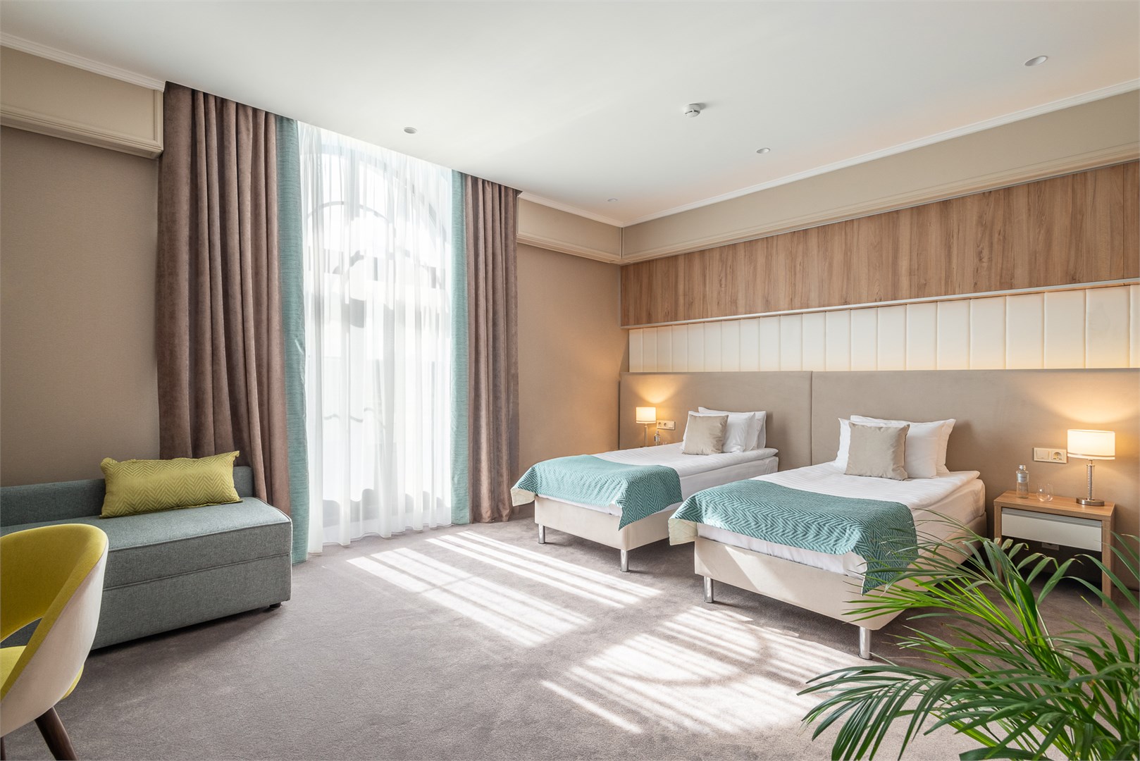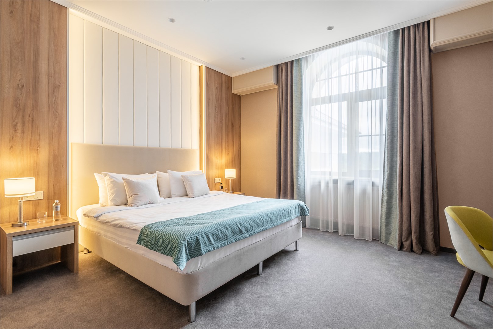 В номере: вешалка, диван раскладной, кровать двуспальная, прикроватные тумбочки, стол, стулья, шкаф, кондиционер, сейф, телевизор, телефон, чайная станция