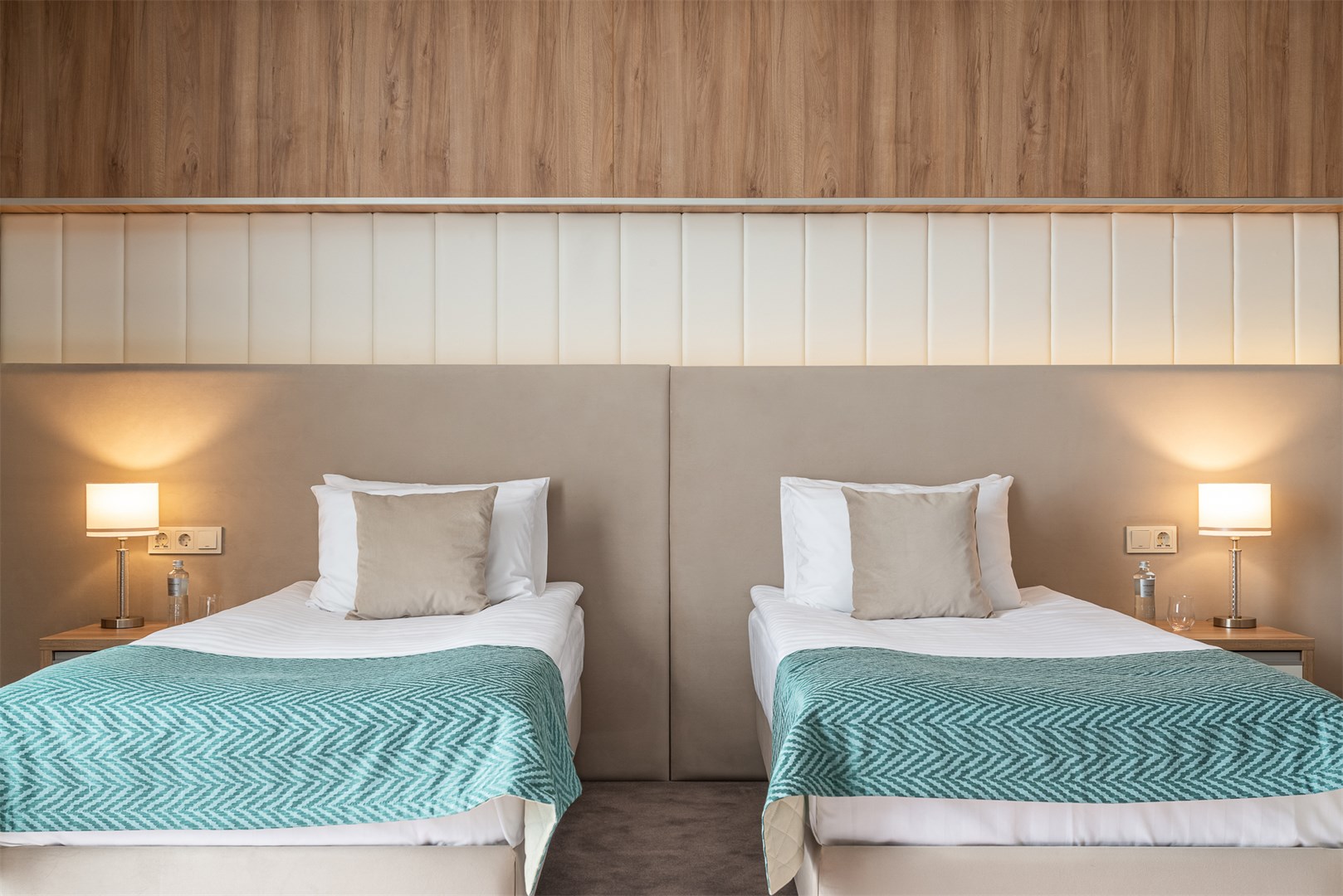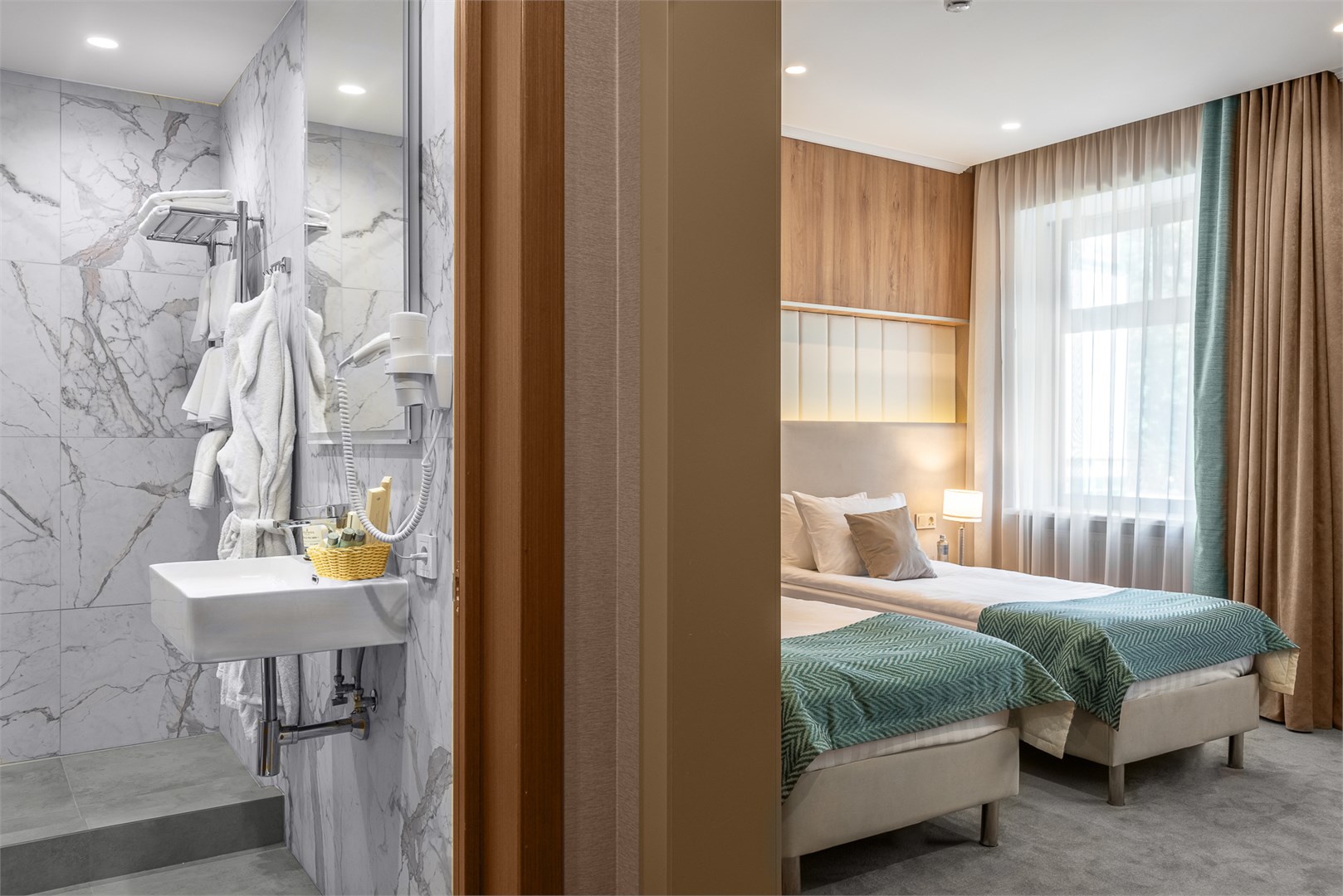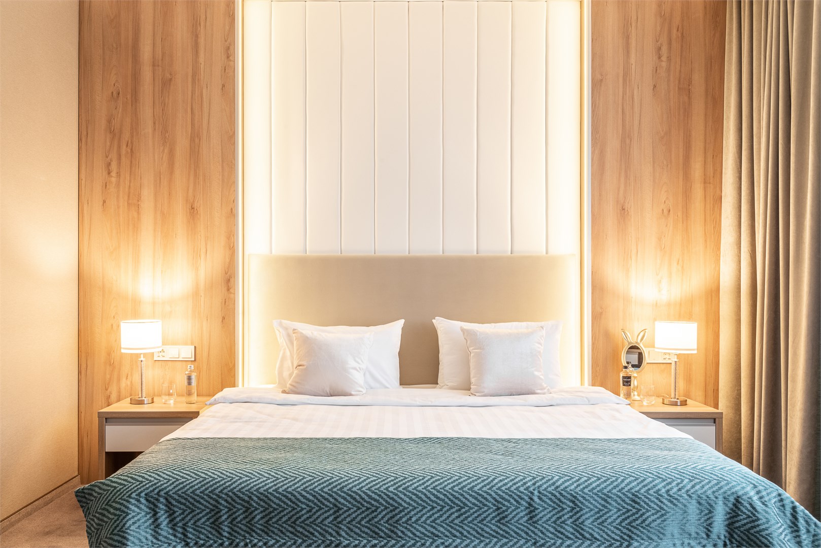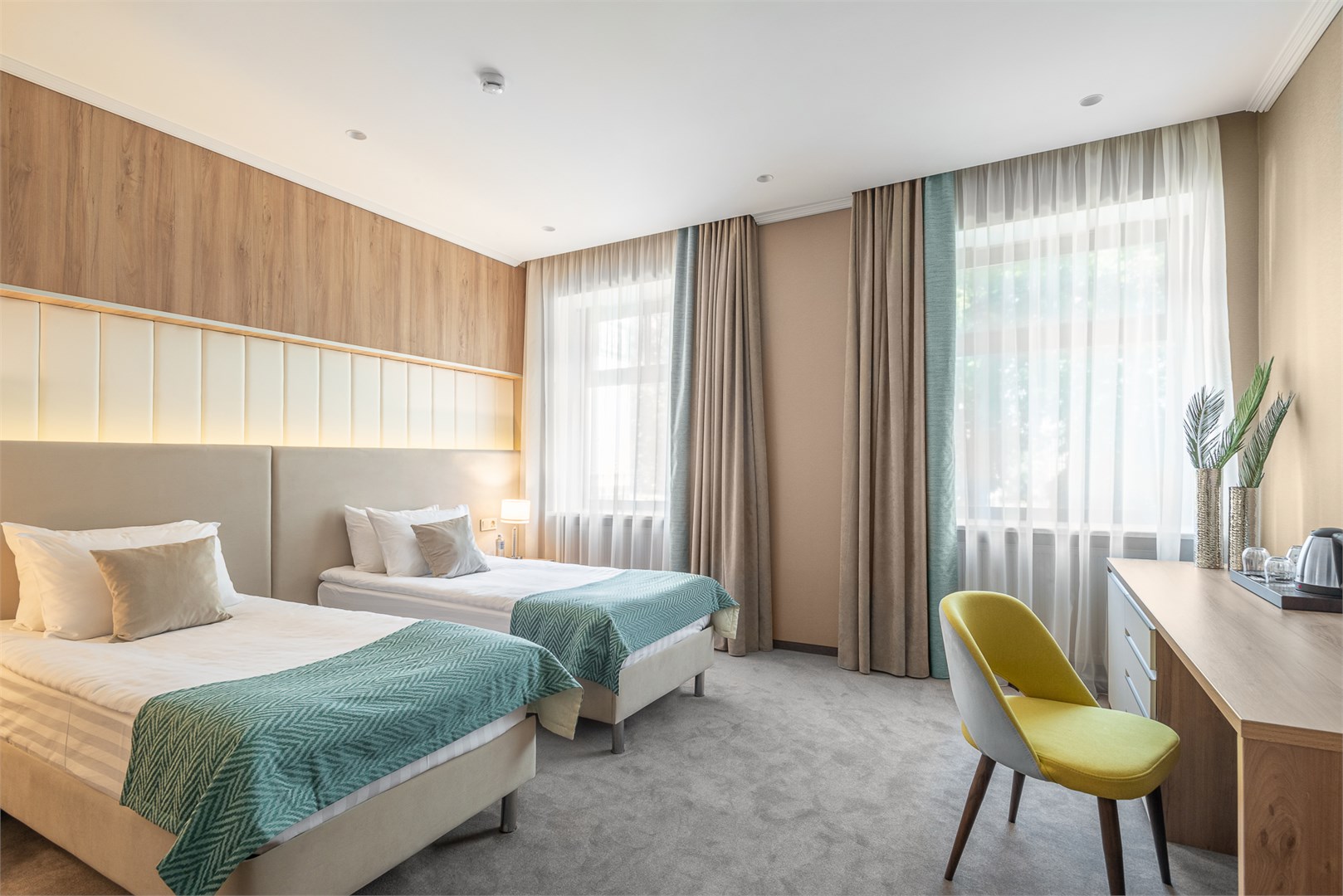 В номере: вешалка, диван раскладной, кровать двуспальная, прикроватные тумбочки, стол, стулья, шкаф, кондиционер, сейф, телевизор, телефон, чайная станция