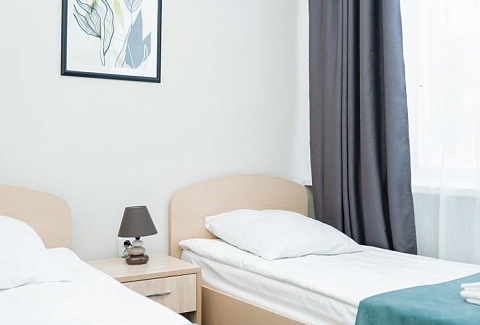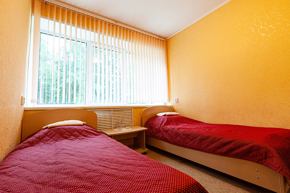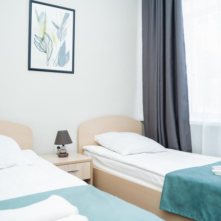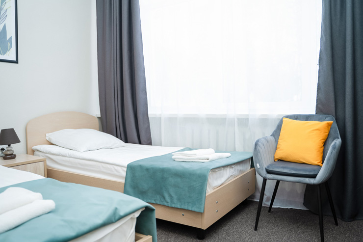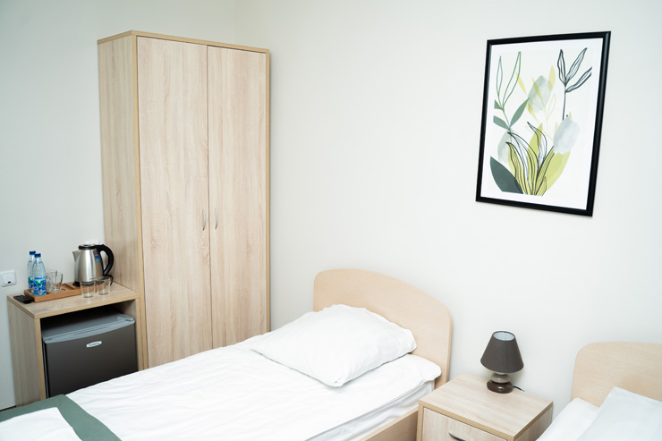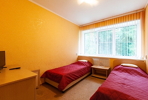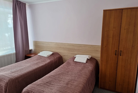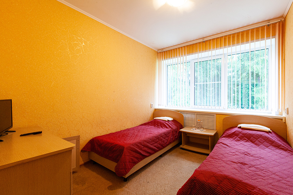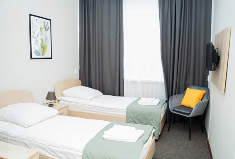 В номере: вешалка, зеркало, комод, кровати односпальные, прикроватные тумбочки, стол, стул, мини-холодильник, телевизор, чайная станция, чайный набор посуды, электрочайник