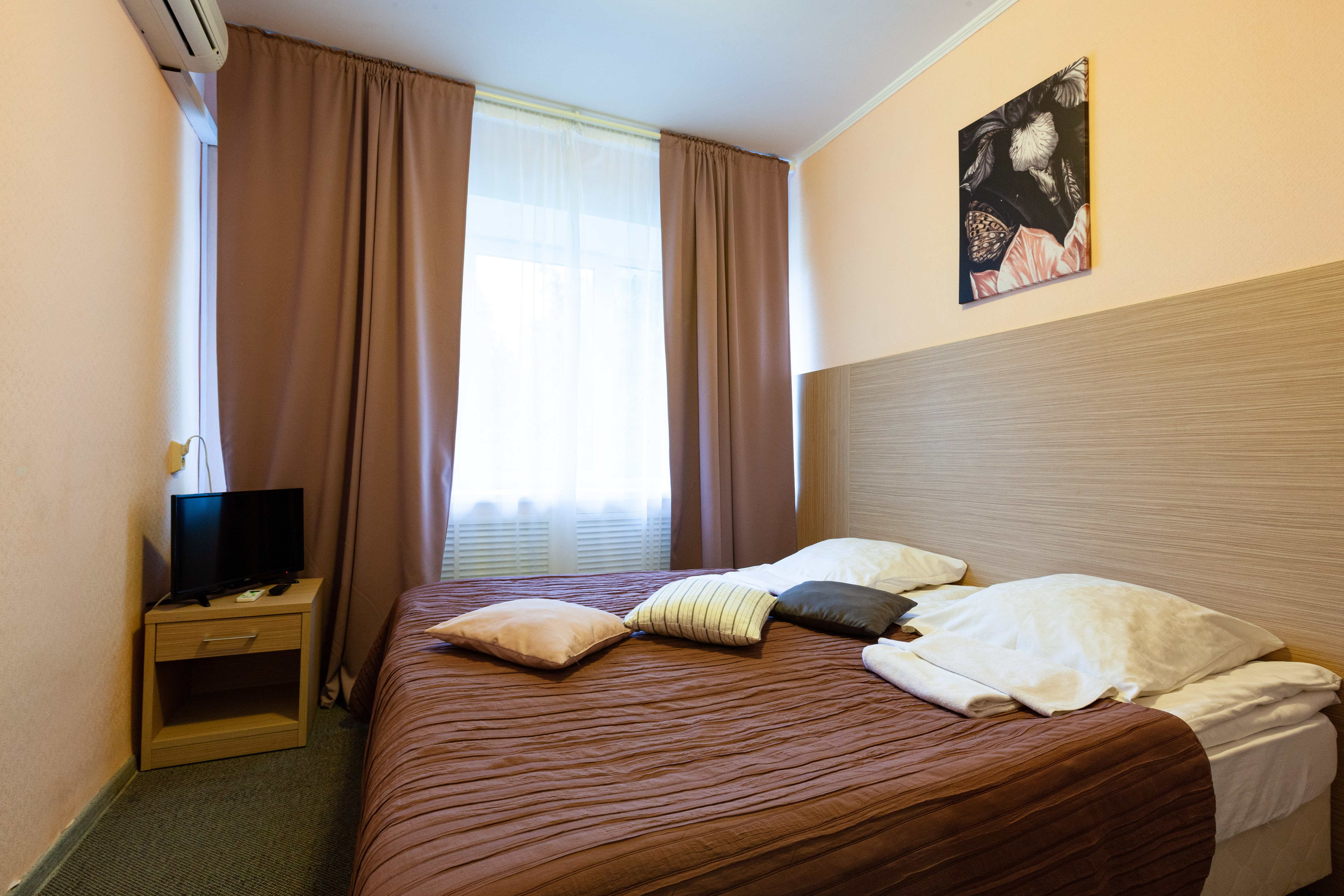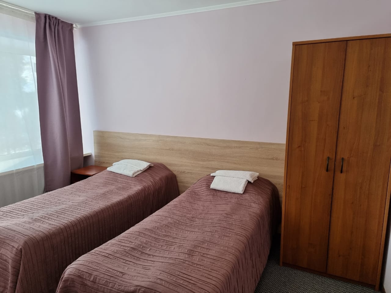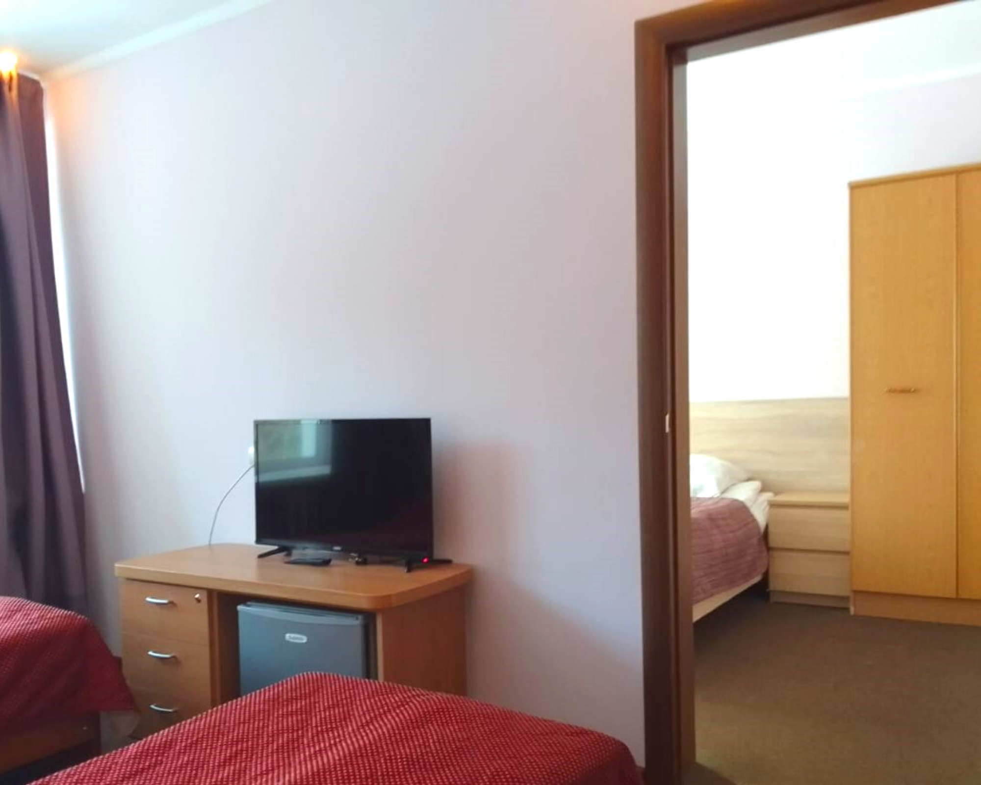В номере: вешалка, зеркало, комод, кровати односпальные, прикроватные тумбочки, стол, стул, мини-холодильник, телевизор, чайная станция, чайный набор посуды, электрочайник