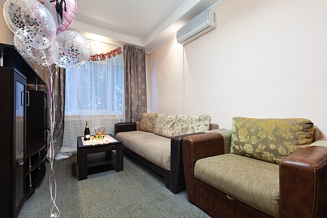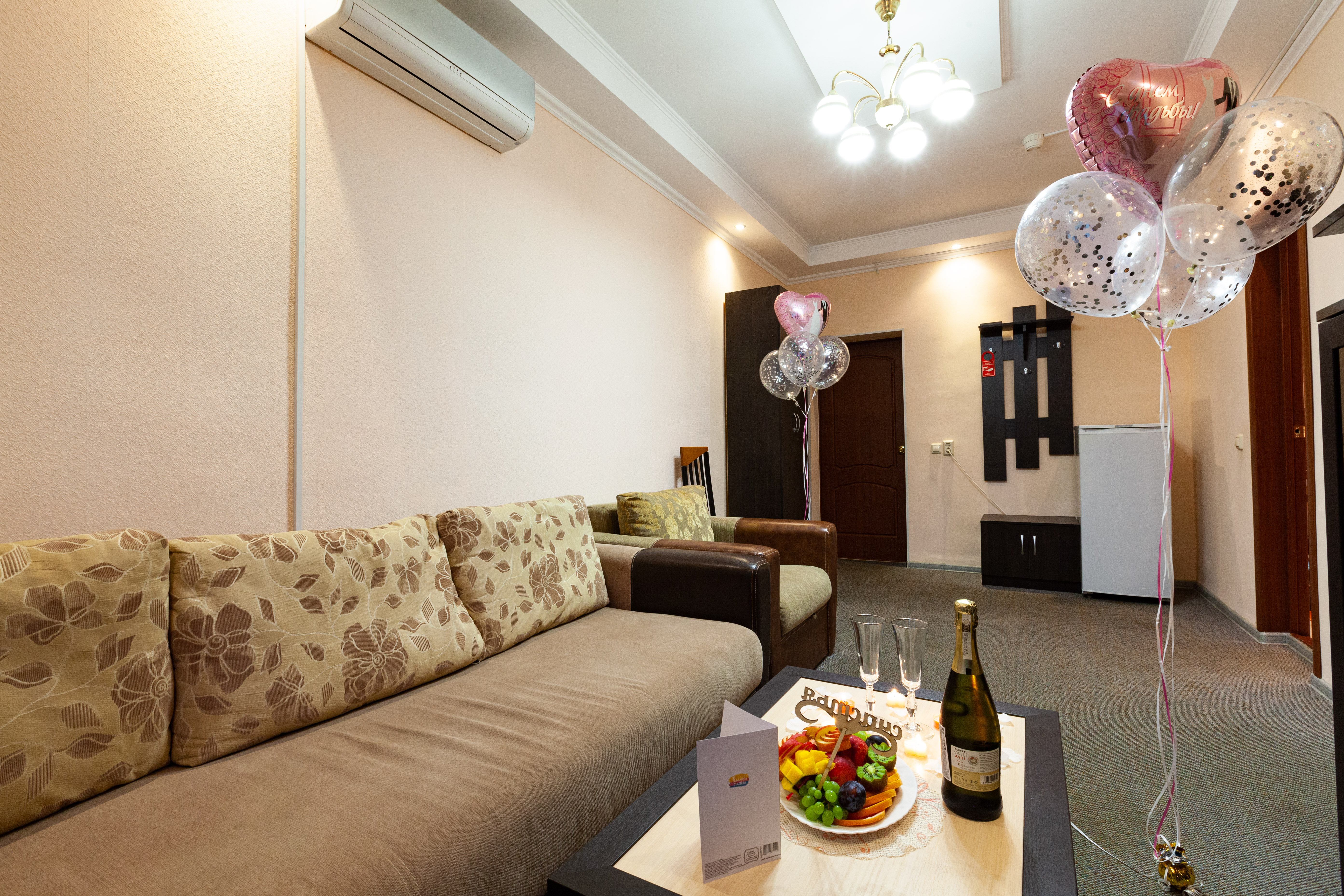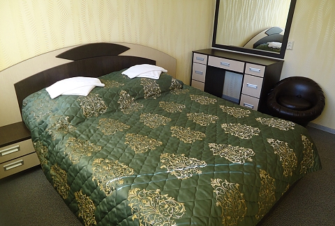 В номере: диван, зеркало, кровать двуспальная, прикроватные тумбочки, стол, столик журнальный, стулья, шкаф, кондиционер, телевизор, холодильник, чайный набор посуды
