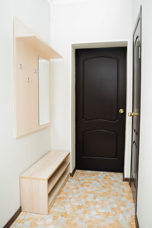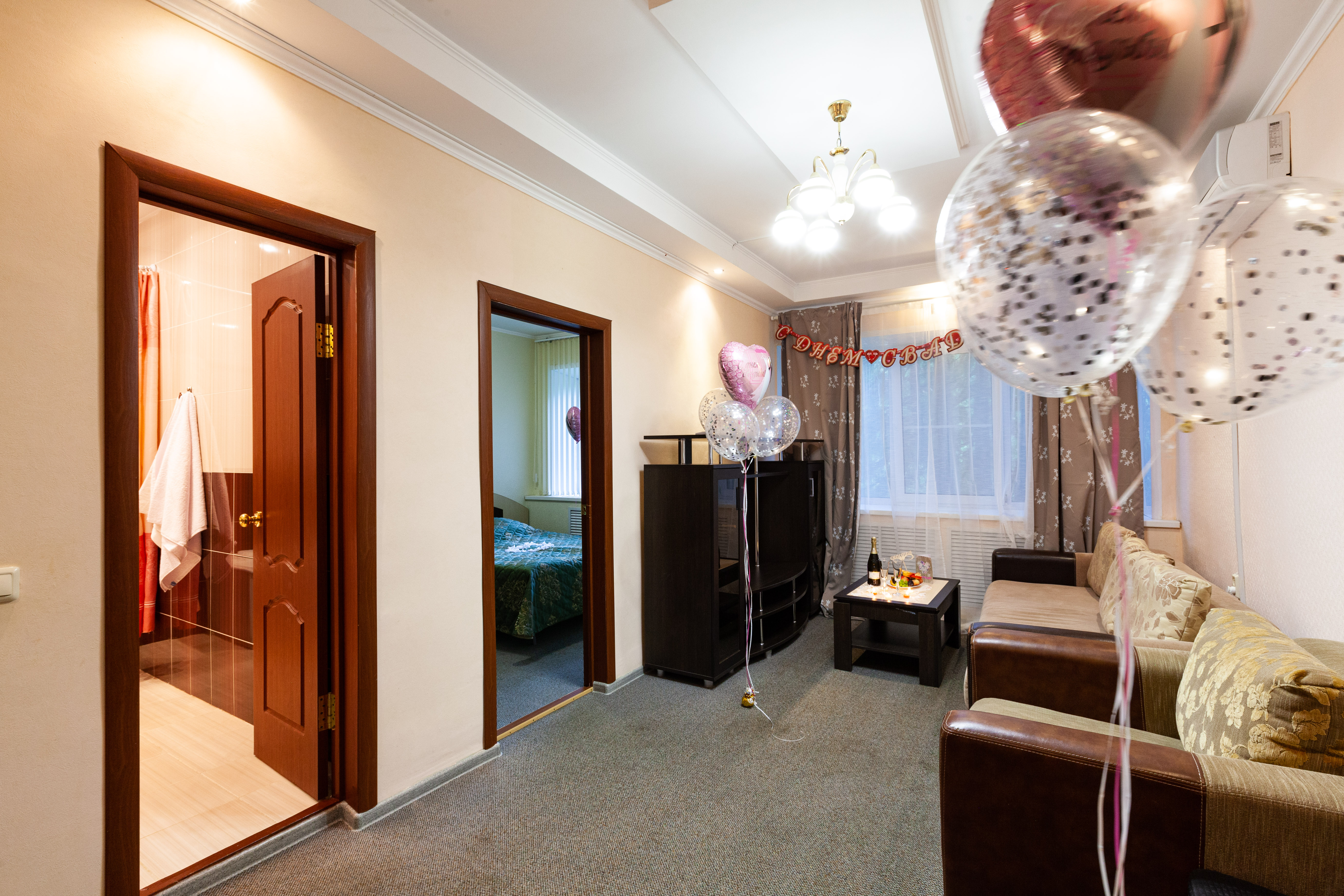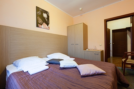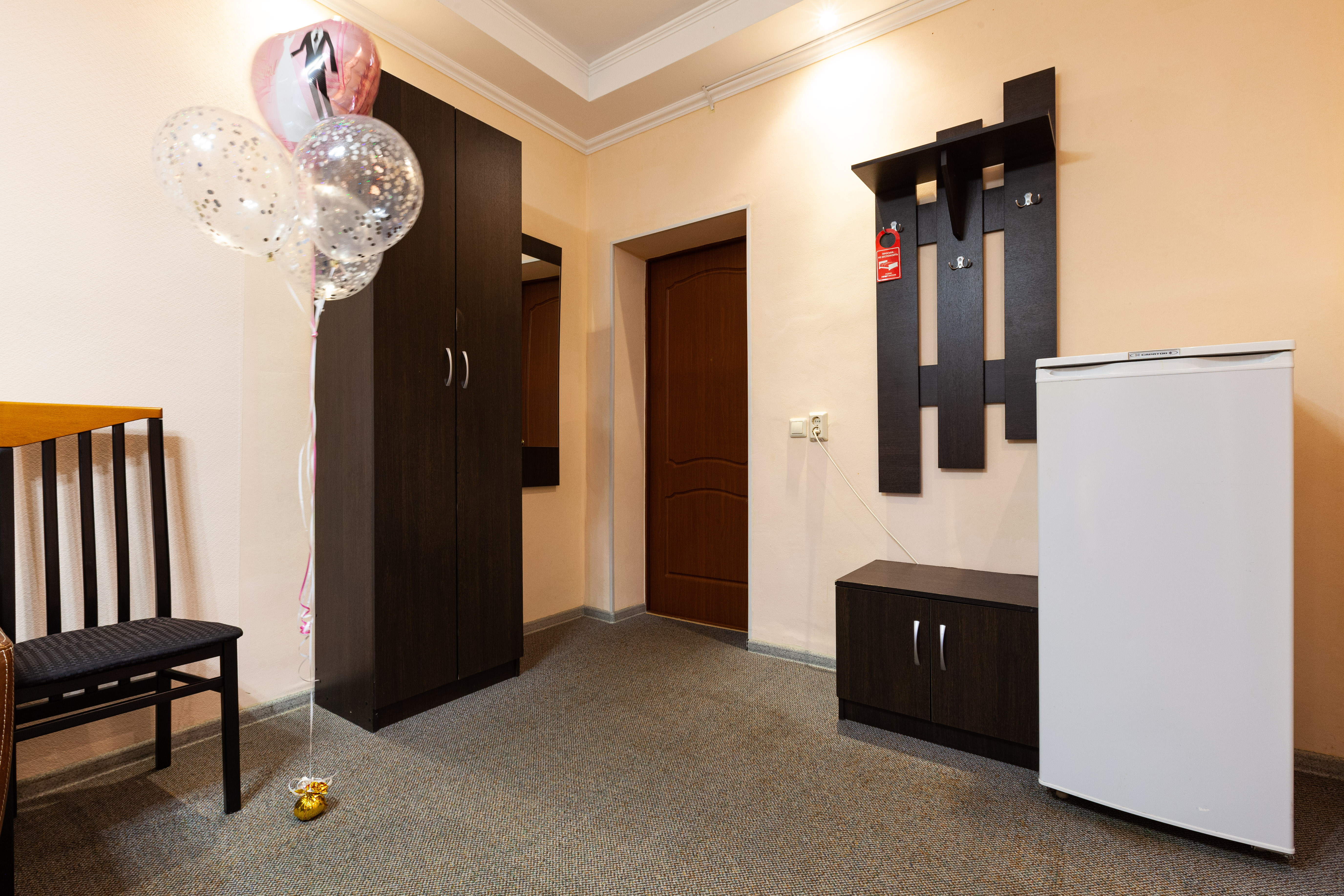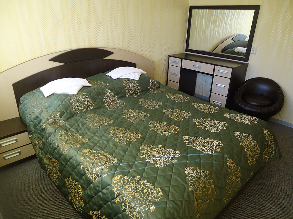 В номере: вешалка, диван, зеркало, кровать двуспальная, прикроватные тумбочки, стол, стулья, шкаф, телевизор, холодильник