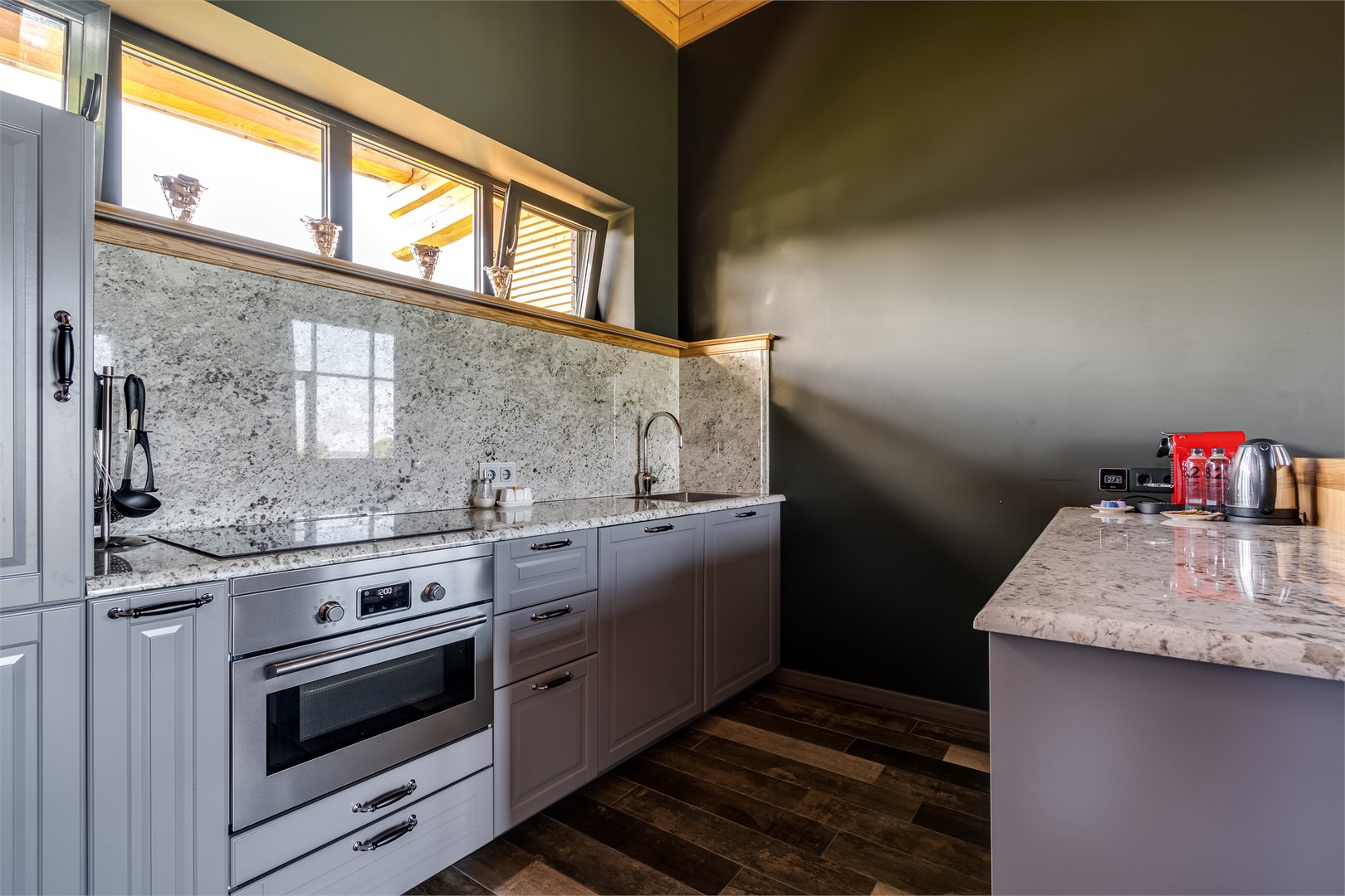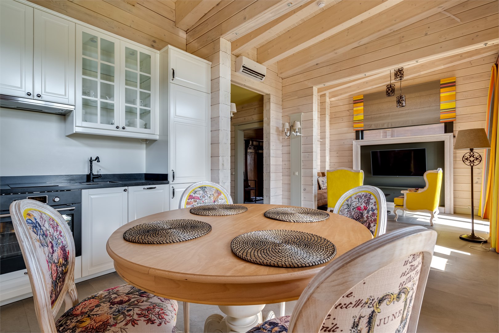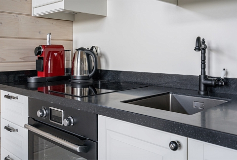 В номере: вешалка, зеркало, кровати односпальные, кровать двуспальная, кухонная мебель, набор мягкой мебели, прикроватные тумбочки, стол, стулья, шкаф, кондиционер, сейф, телевизор, телефон, чайный набор посуды, электрочайник