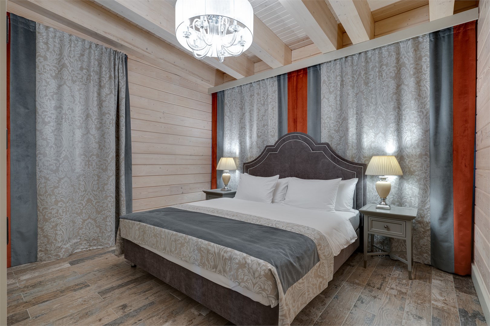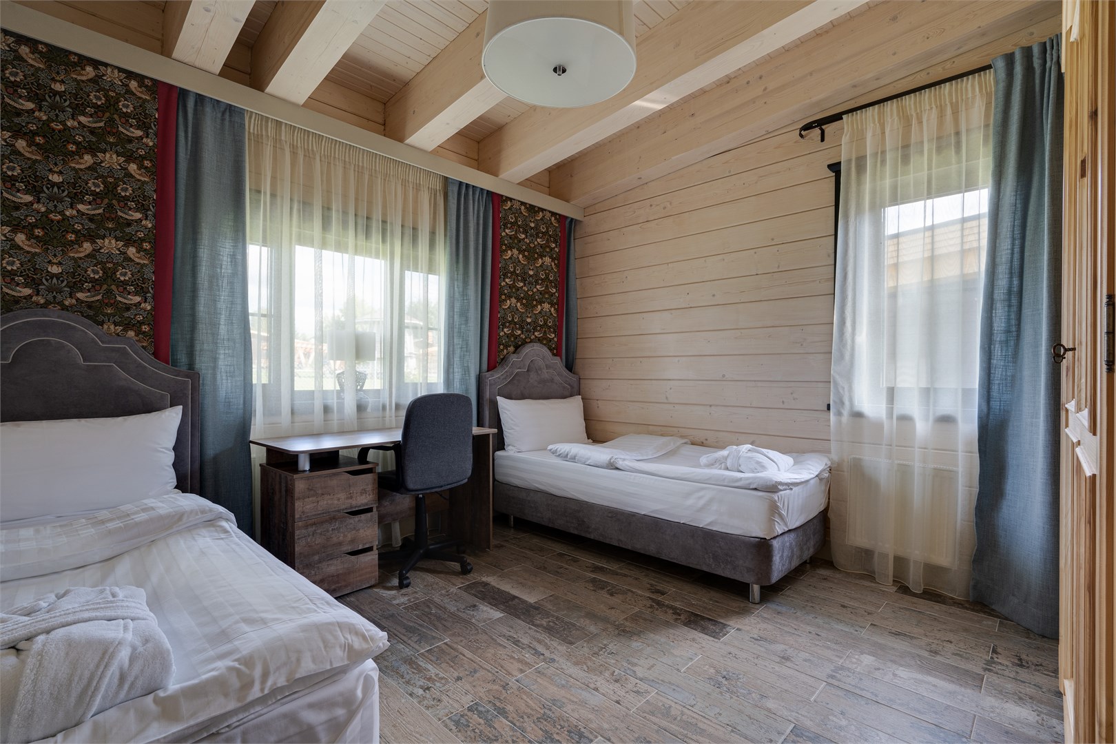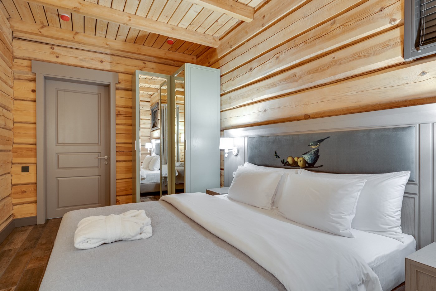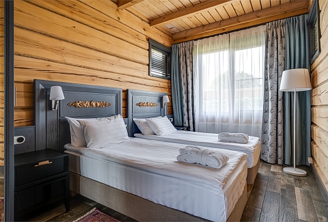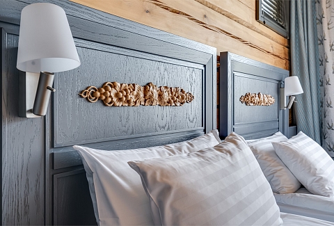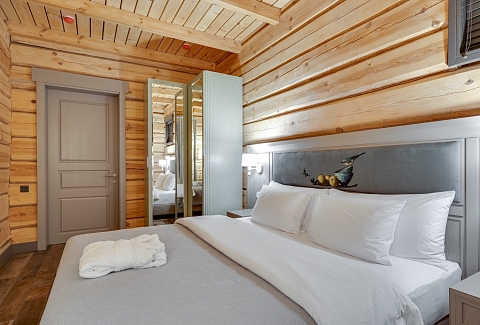 В номере: вешалка, зеркало, кровати односпальные, кровать двуспальная, прикроватные тумбочки, стол, стулья, шкаф, кондиционер, кофемашина, микроволновая печь, набор посуды, плита электрическая, сейф, телевизор ЖК, телефон, чайный набор посуды, электрочайник