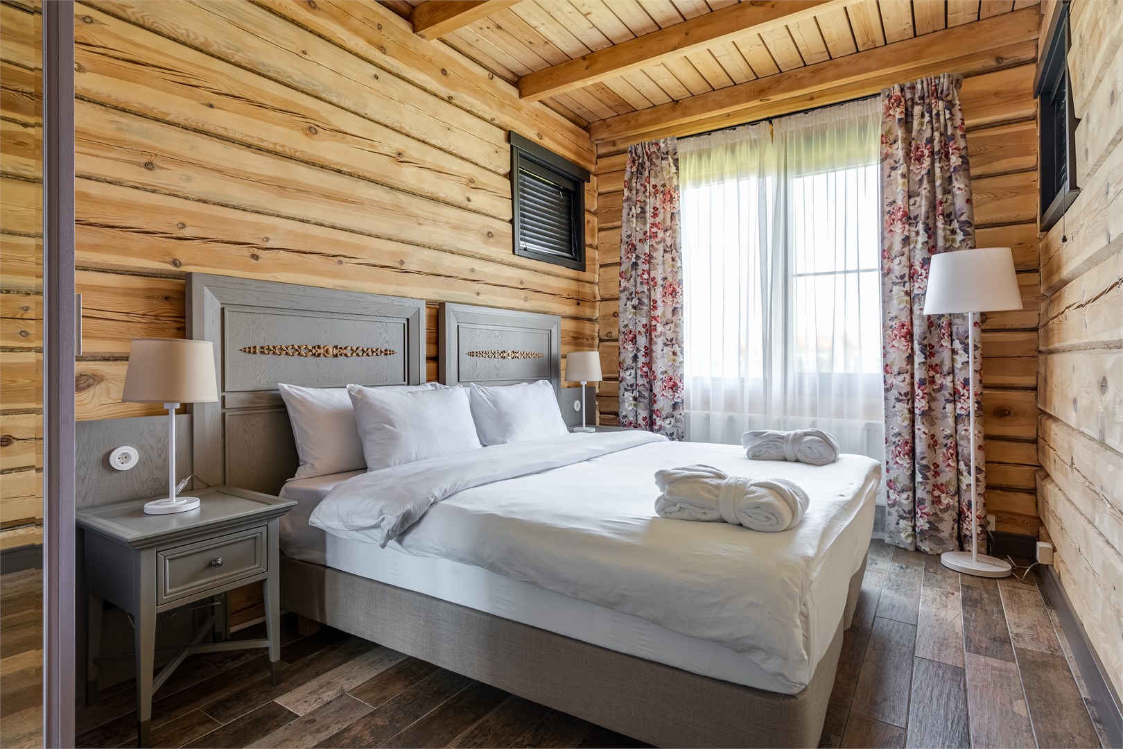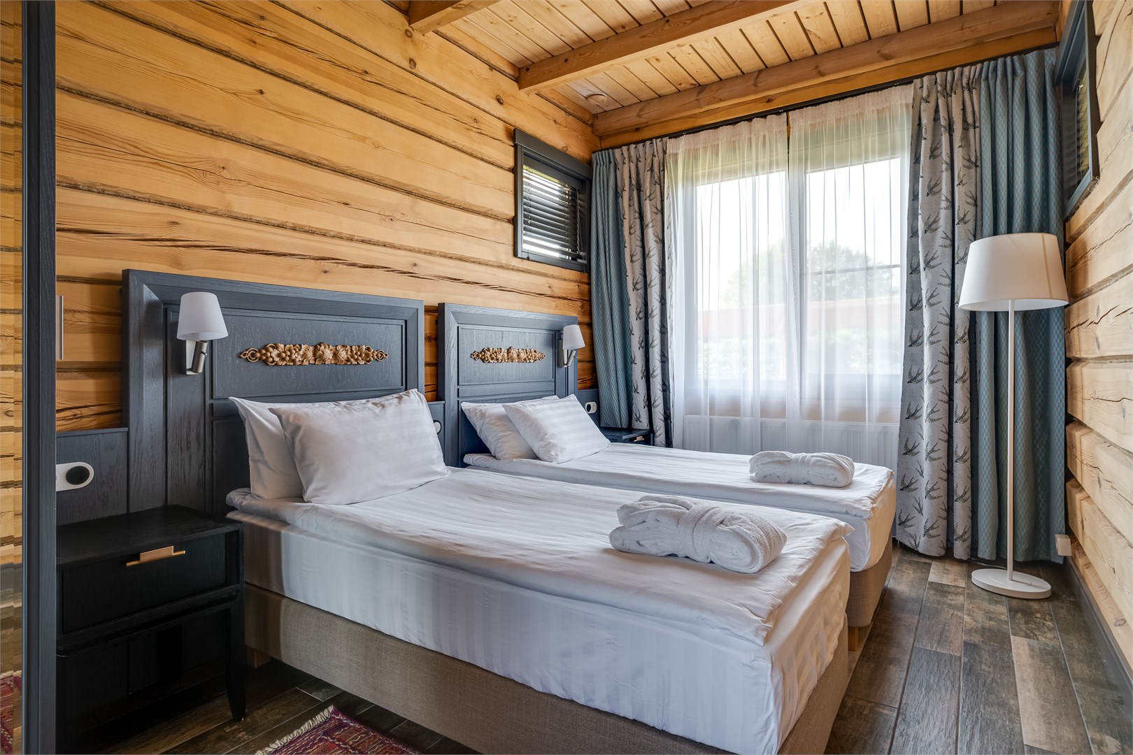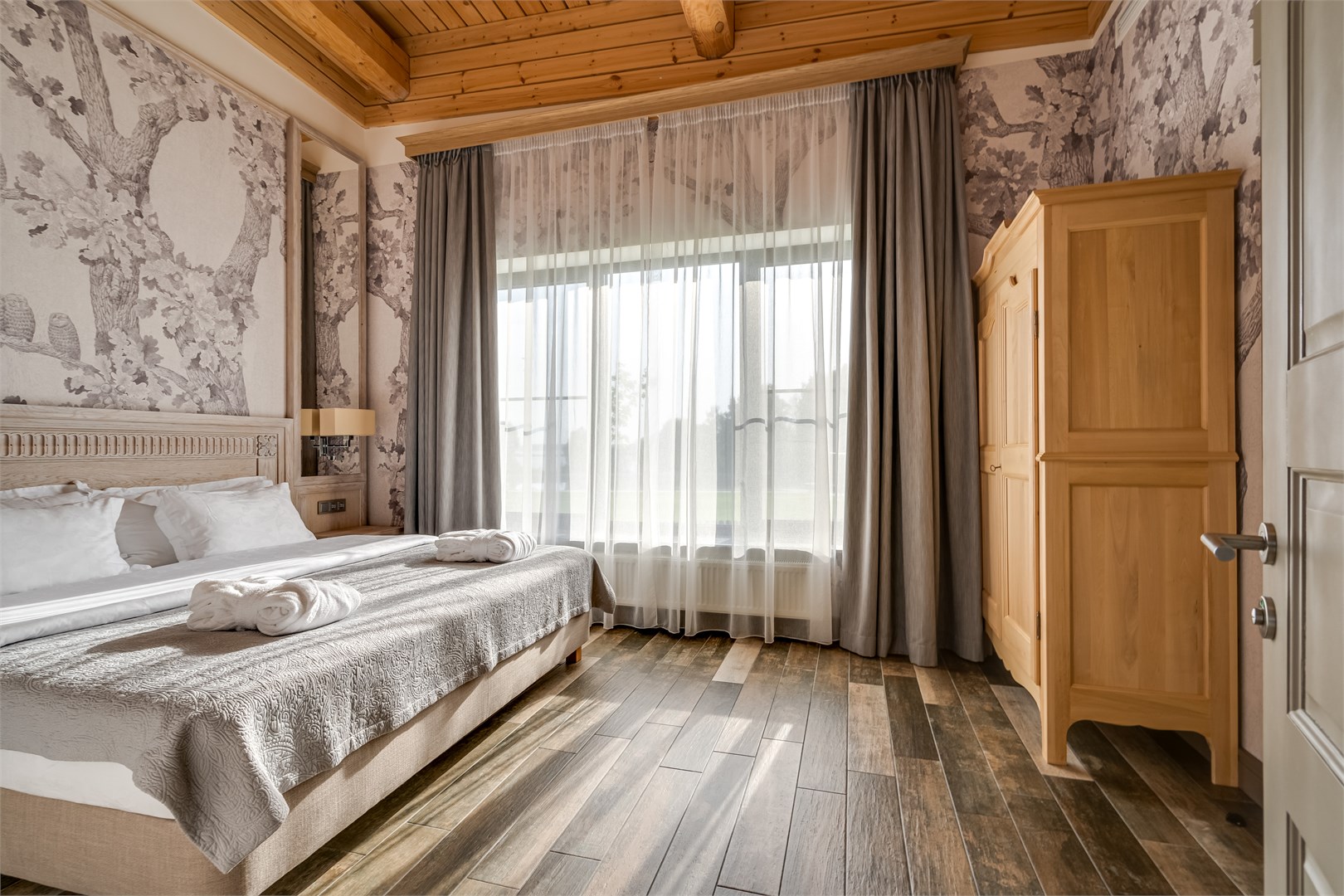 В номере: вешалка, зеркало, кровати односпальные, кровать двуспальная, прикроватные тумбочки, стол, стулья, шкаф, кондиционер, кофемашина, микроволновая печь, набор посуды, плита электрическая, сейф, телевизор ЖК, телефон, чайный набор посуды, электрочайник