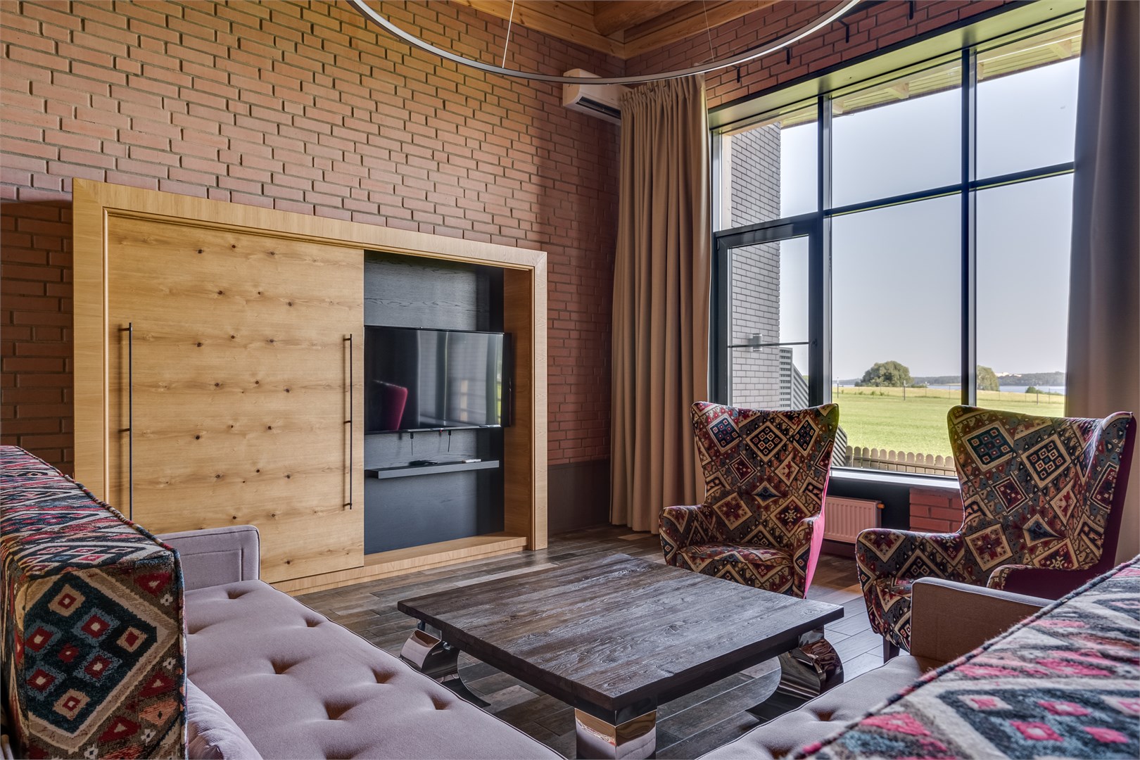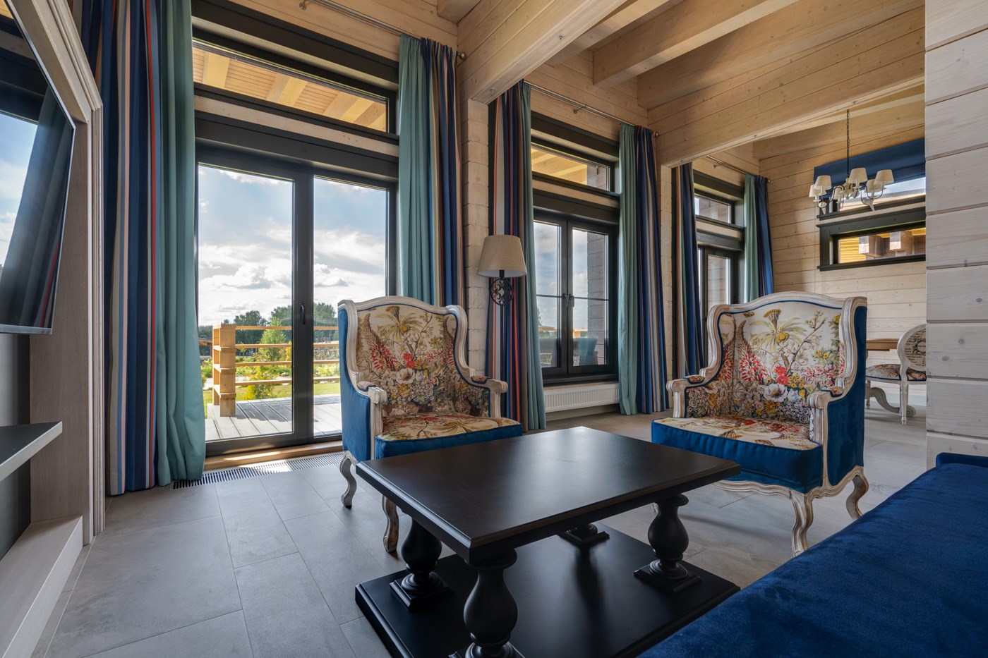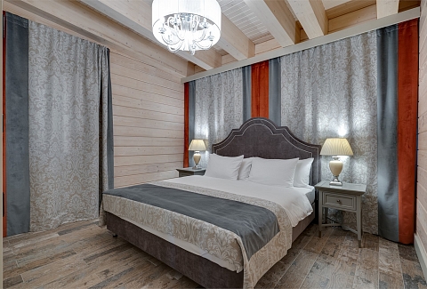 В номере: вешалка, диван, зеркало, кресло, кровать двуспальная, кухонная мебель, набор мягкой мебели, прикроватные тумбочки, стол, стулья, шкаф, гладильная доска, кондиционер, мини-холодильник, набор посуды, сейф, сплит-система, телевизор ЖК, телефон, утюг, чайная станция, электрочайник