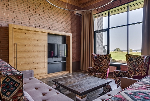В номере: вешалка, диван, зеркало, кресло, кровати односпальные, кухонная мебель, набор мягкой мебели, прикроватные тумбочки, столик журнальный, стулья, шкаф, гладильная доска, кондиционер, мини-холодильник, набор посуды, сейф, сплит-система, телевизор ЖК, телефон, утюг, чайная станция, электрочайник