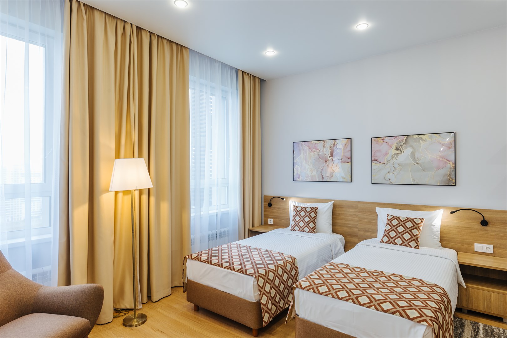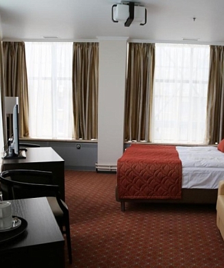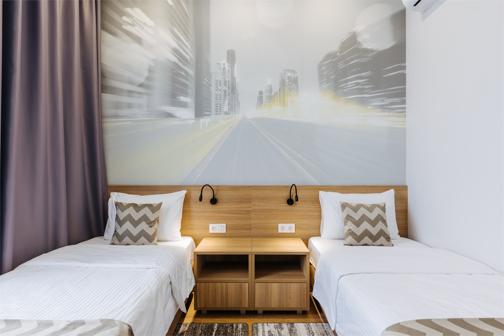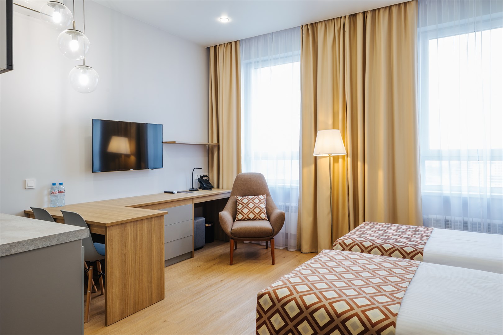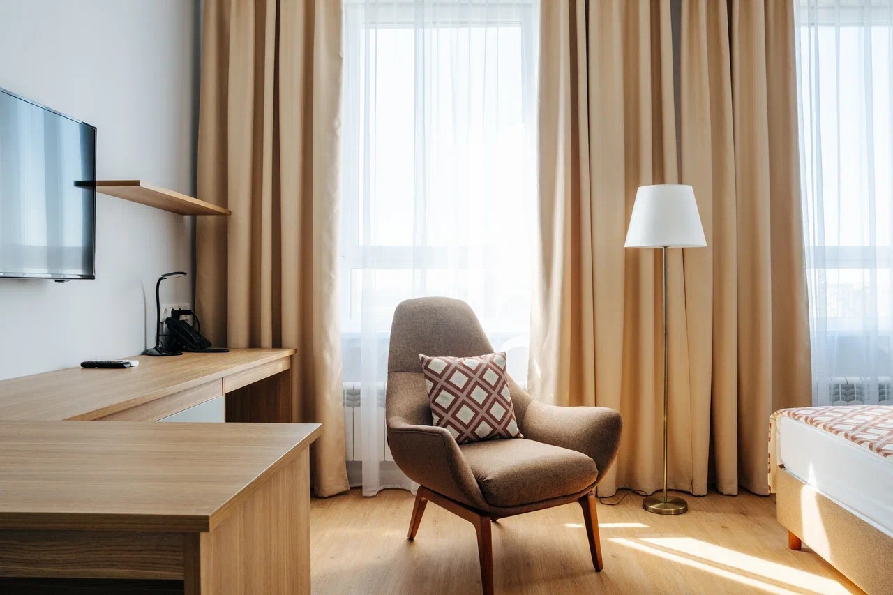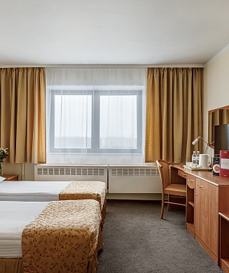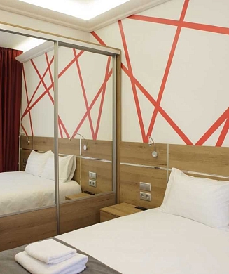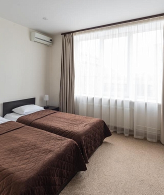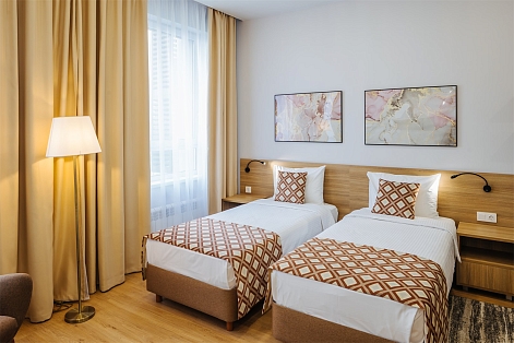 В номере: вешалка, зеркало, кровати односпальные, прикроватные тумбочки, стол, стулья, шкаф, кондиционер, мини-холодильник, сейф, телевизор, электрочайник
