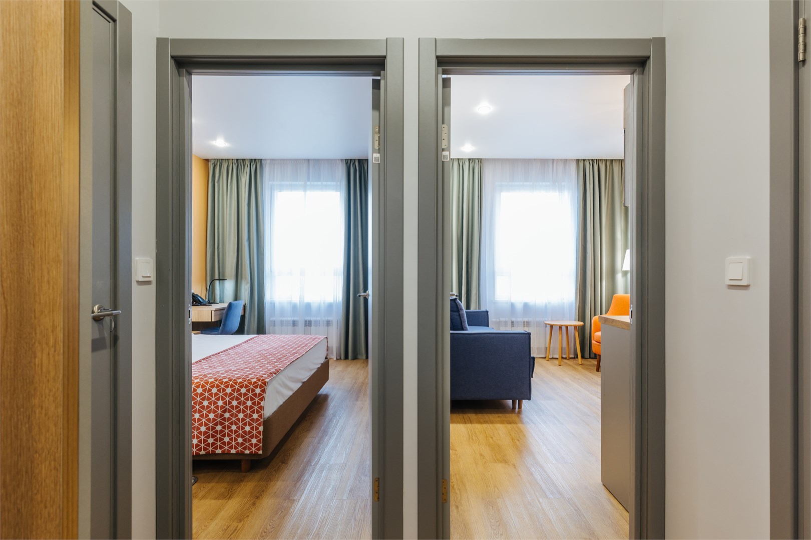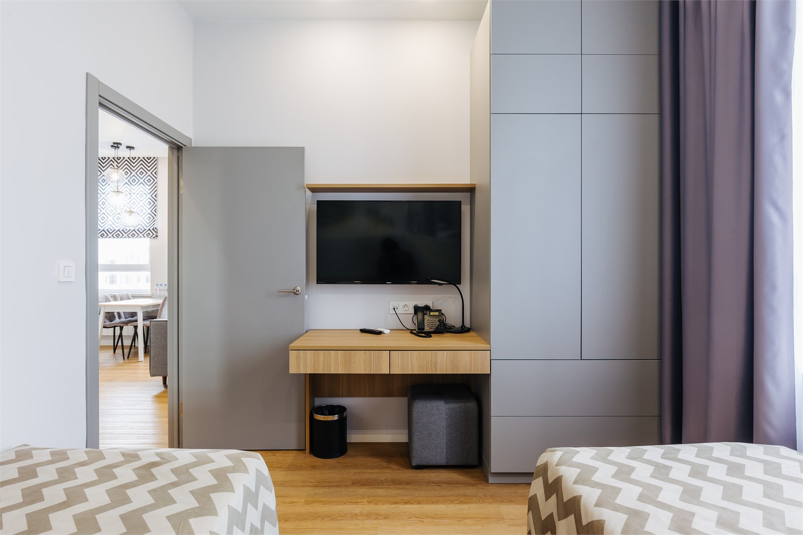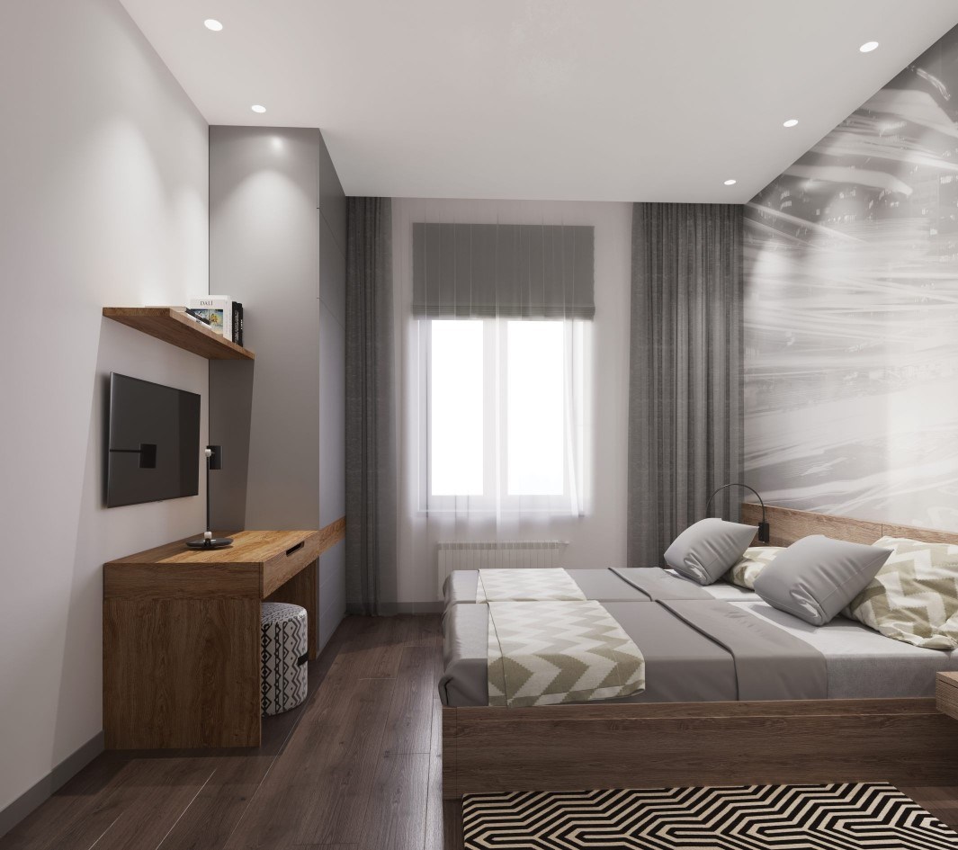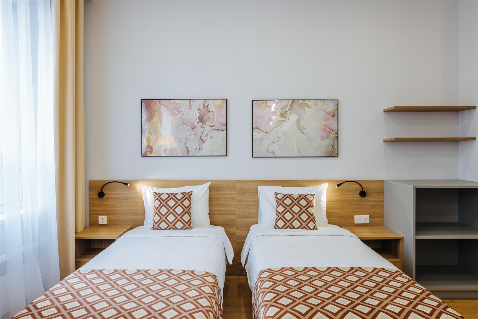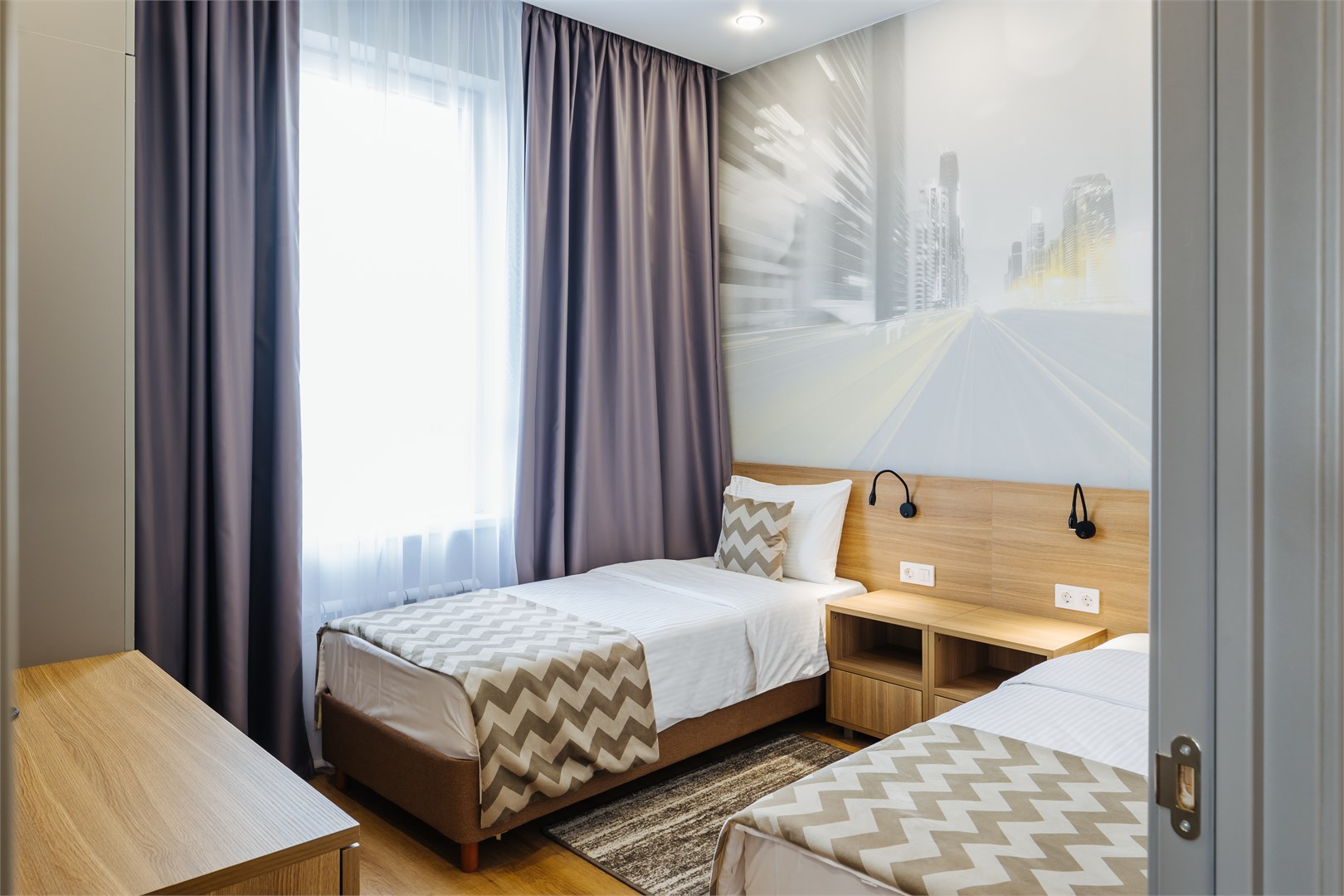 В номере: вешалка, зеркало, кровати односпальные, прикроватные тумбочки, стол, стулья, шкаф, кондиционер, мини-холодильник, сейф, телевизор, электрочайник