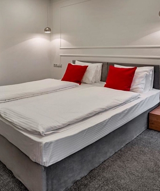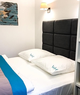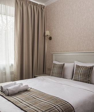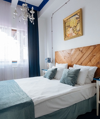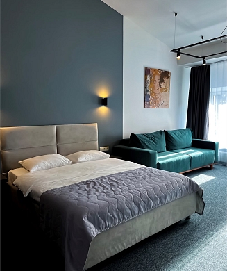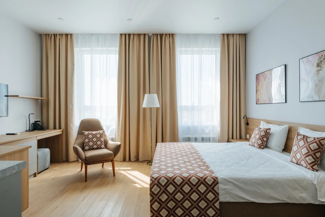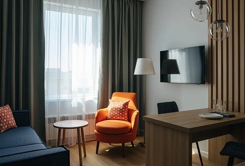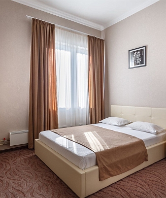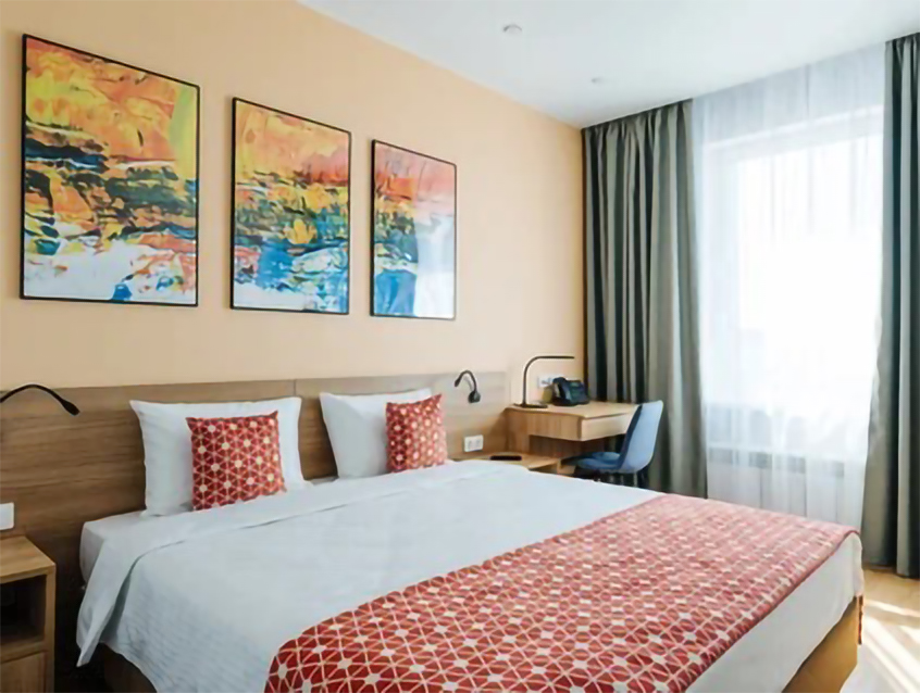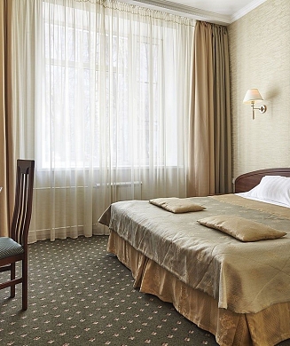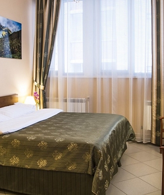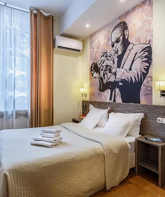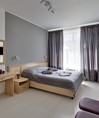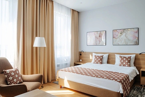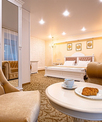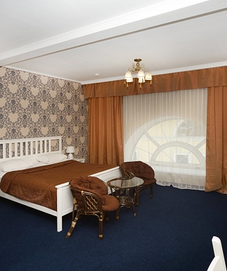 В номере: вешалка, диван, зеркало, кровать двуспальная, прикроватные тумбочки, стол, стулья, шкаф, кондиционер, мини-холодильник, набор посуды, сейф, телевизор, электрочайник