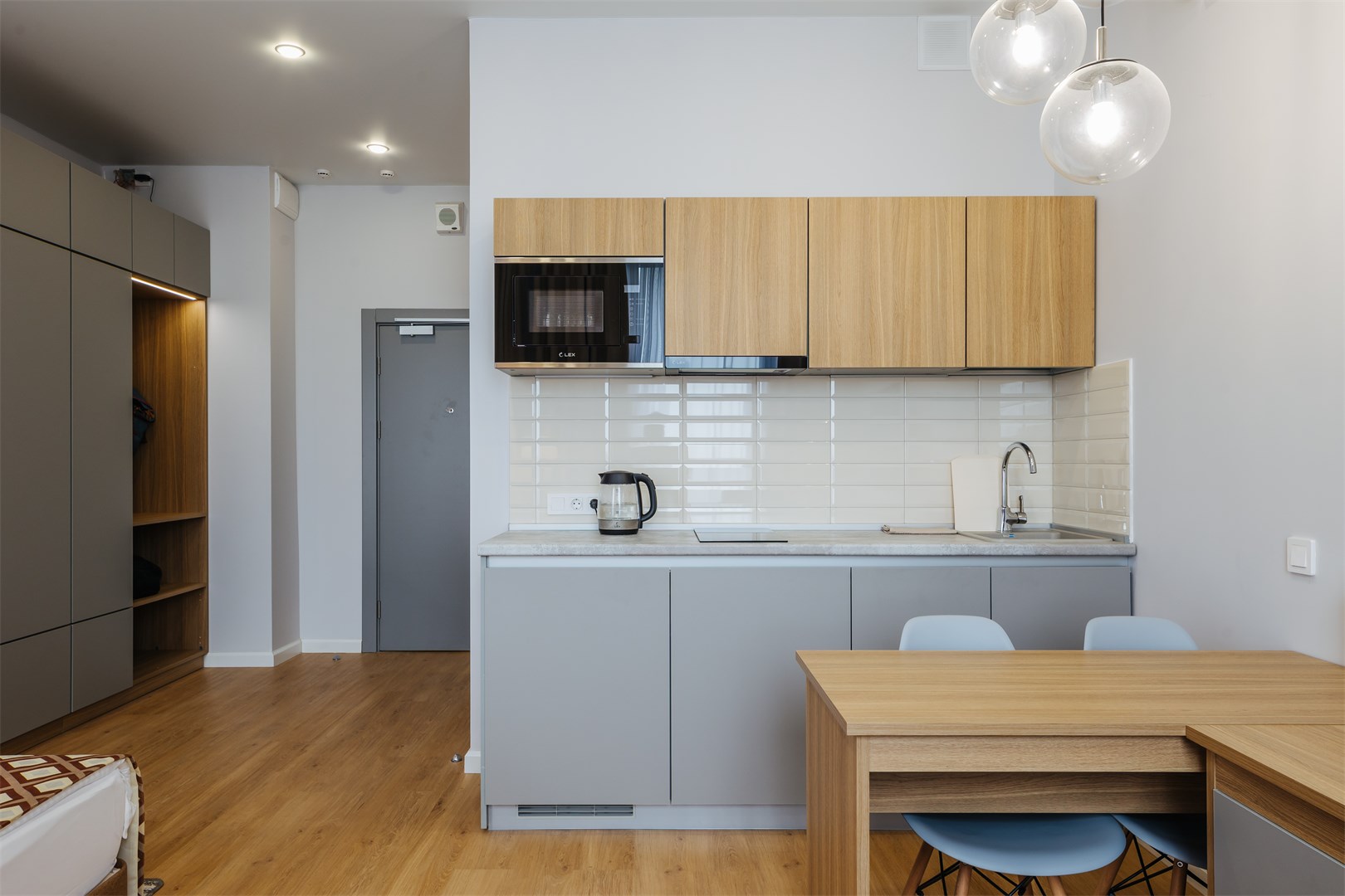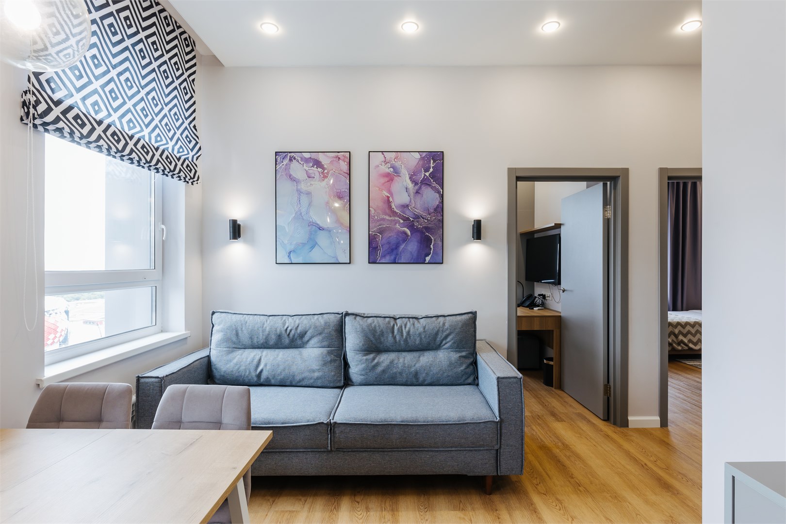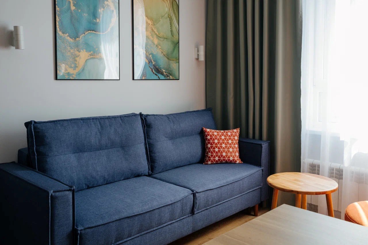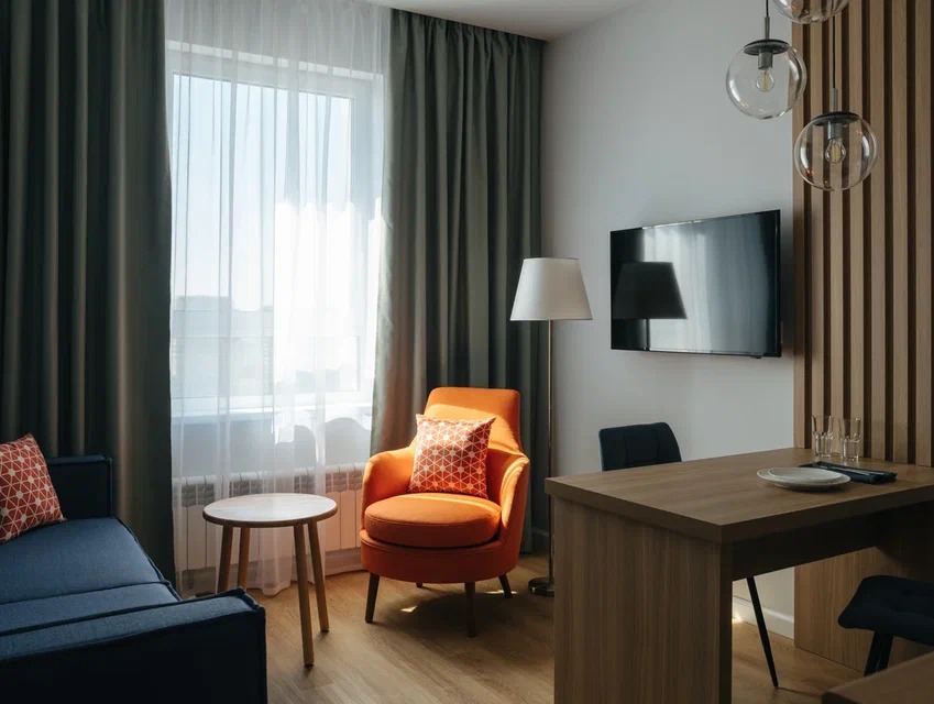 В номере: вешалка, диван, зеркало, кровать двуспальная, прикроватные тумбочки, стол, стулья, шкаф, кондиционер, мини-холодильник, набор посуды, сейф, телевизор, электрочайник