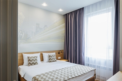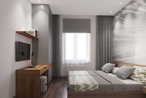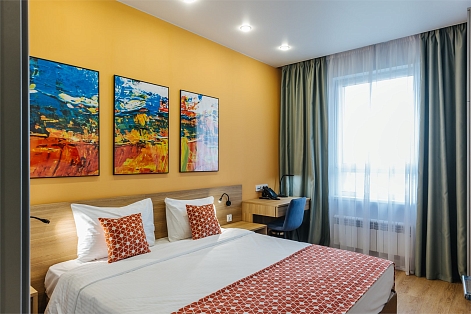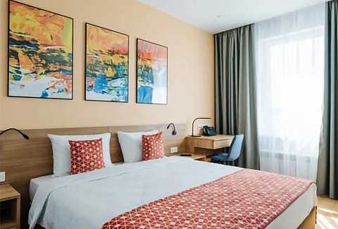 В номере: зеркало, кровать двуспальная, прикроватные тумбочки, стол, стулья, шкаф, кондиционер, мини-холодильник, набор посуды, сейф, телевизор, электрочайник