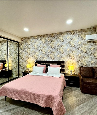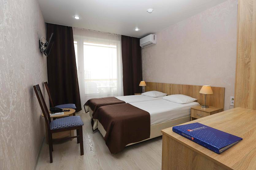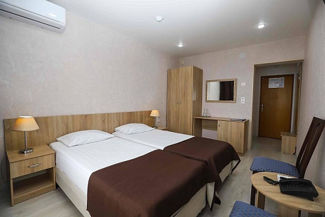 В номере: вешалка, зеркало, кровати односпальные /одна двуспальная кровать, стол, стул, шкаф, кондиционер, мини-холодильник, телевизор, телефон
