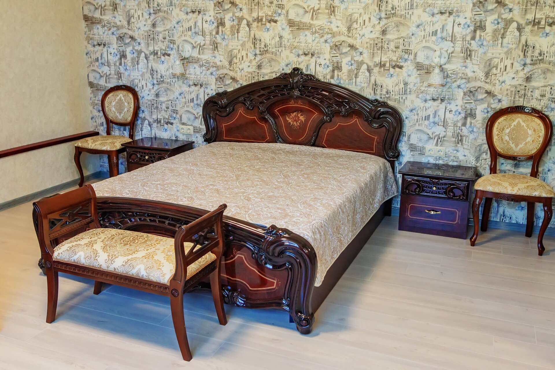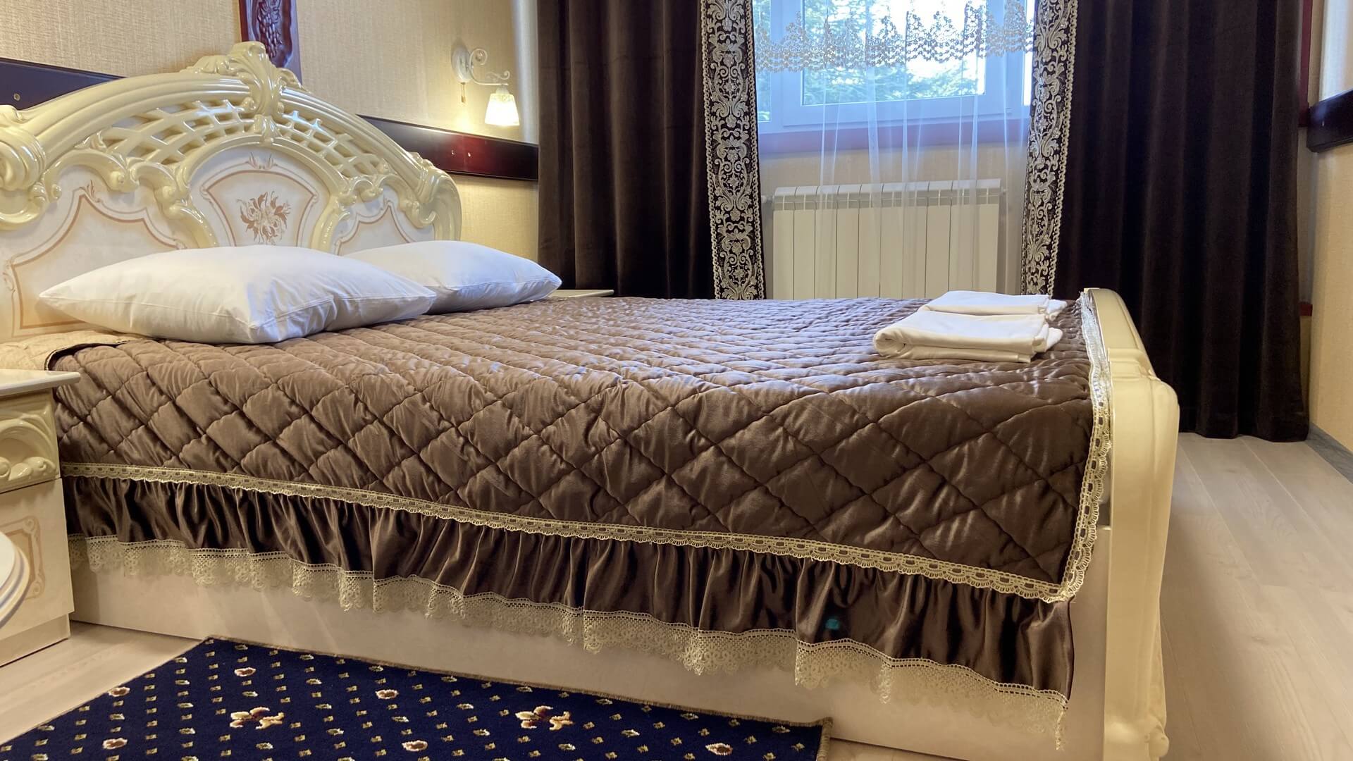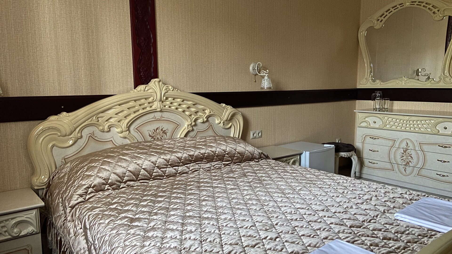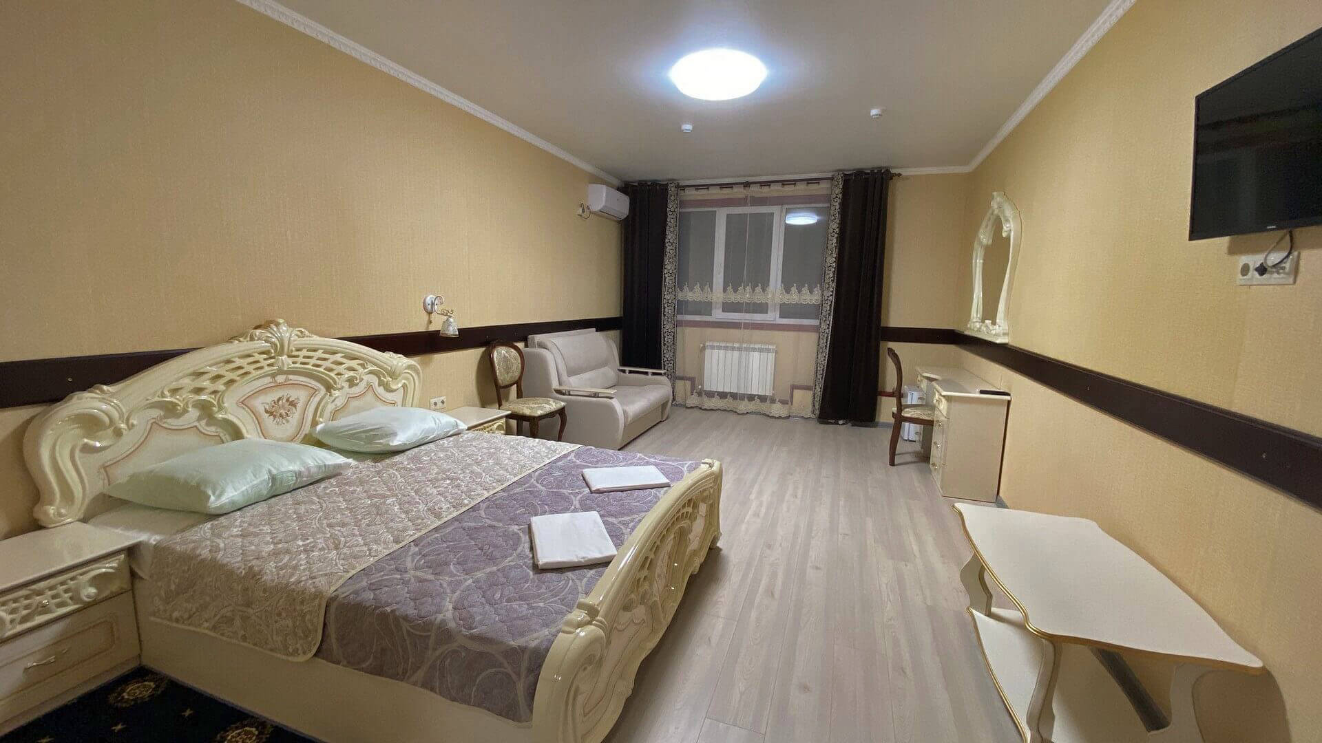 В номере: зеркало, кровать двуспальная, прикроватные тумбочки, стол, стул, шкаф, кондиционер, сейф, телевизор, электрочайник