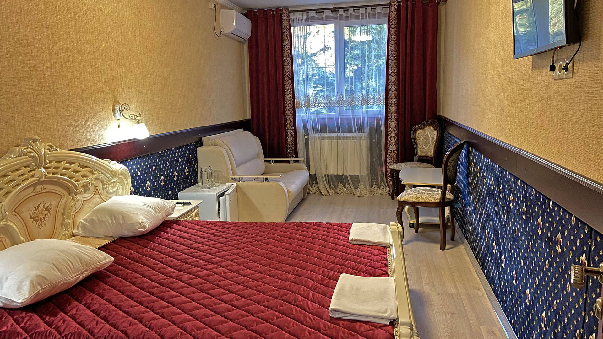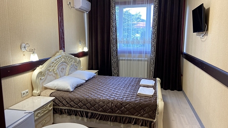 В 10 минутах ходьбы — железнодорожная станция, а до аэропорта Адлера всего 12 километров. Четырехэтажный корпус отеля разместился в 800 метрах от моря на берегу горной реки Хосты. Гостей ожидают двухместные номера с классическим интерьером, оборудованные резным мебельным гарнитуром, кондиционером и индивидуальным санузлом. Также везде установлен плазменный телевизор, фен, электрочайник. В распоряжении отдыхающих сауна, беспроводной интернет. Малышам администрация отеля по предварительному запросу предоставляет в аренду детские кроватки. В 10 минутах ходьбы находится оборудованный галечный пляж. На побережье установлены раздевалки, навесы, шезлонги, работают кафе, доступны водные развлечения.
