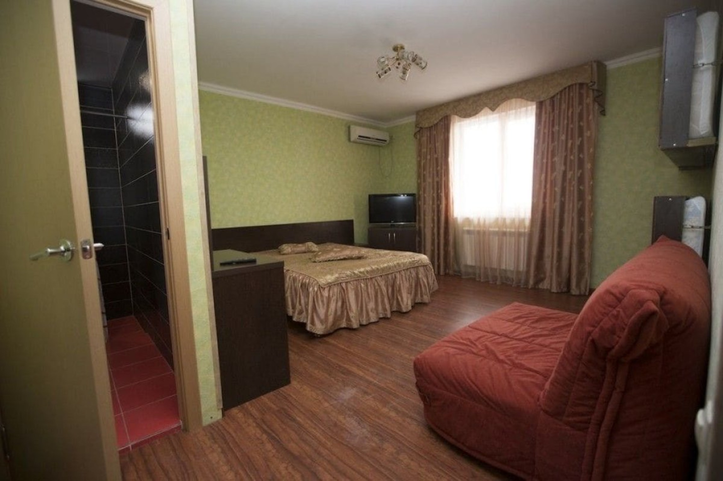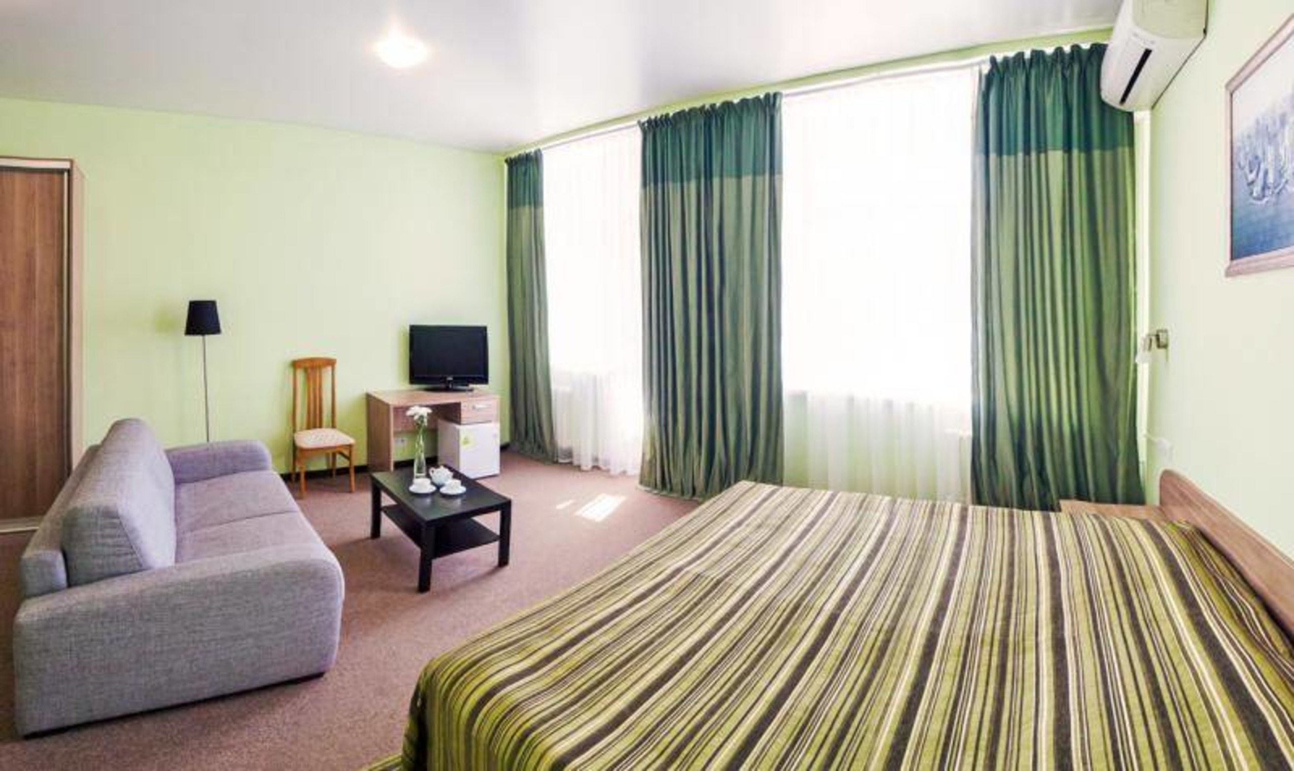 В номере: диван раскладной, зеркало, кровать двуспальная, прикроватные тумбочки, столик журнальный, стул, шкаф, кондиционер, телевизор, холодильник
