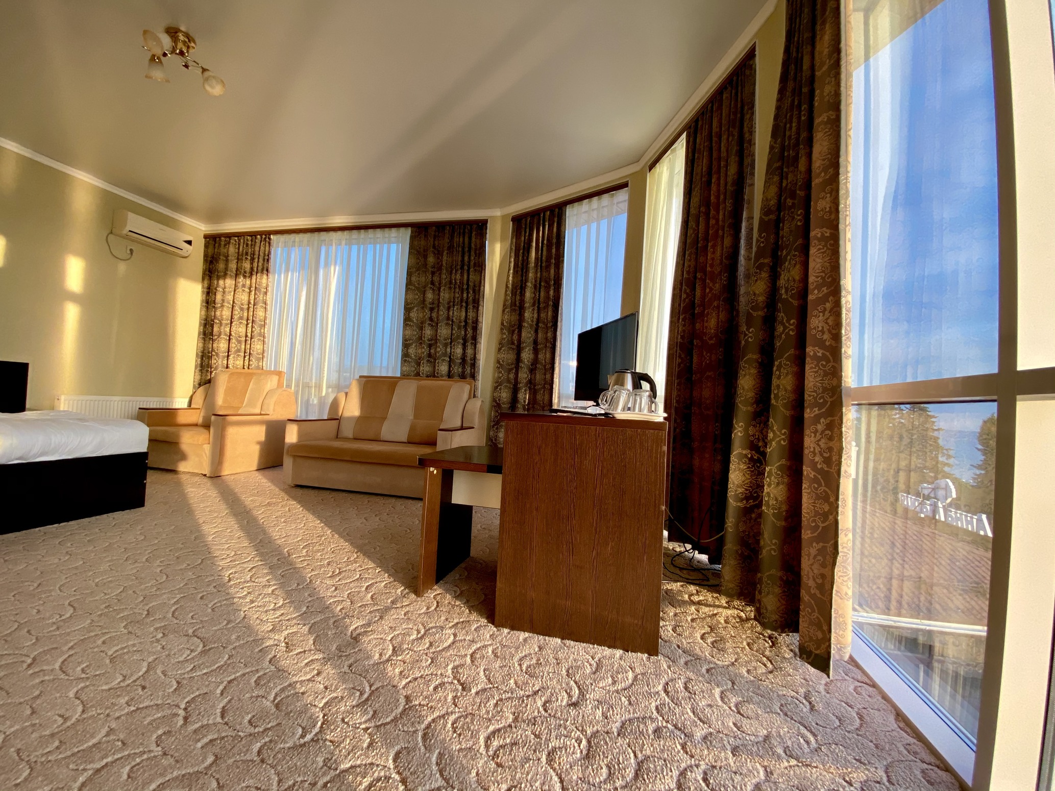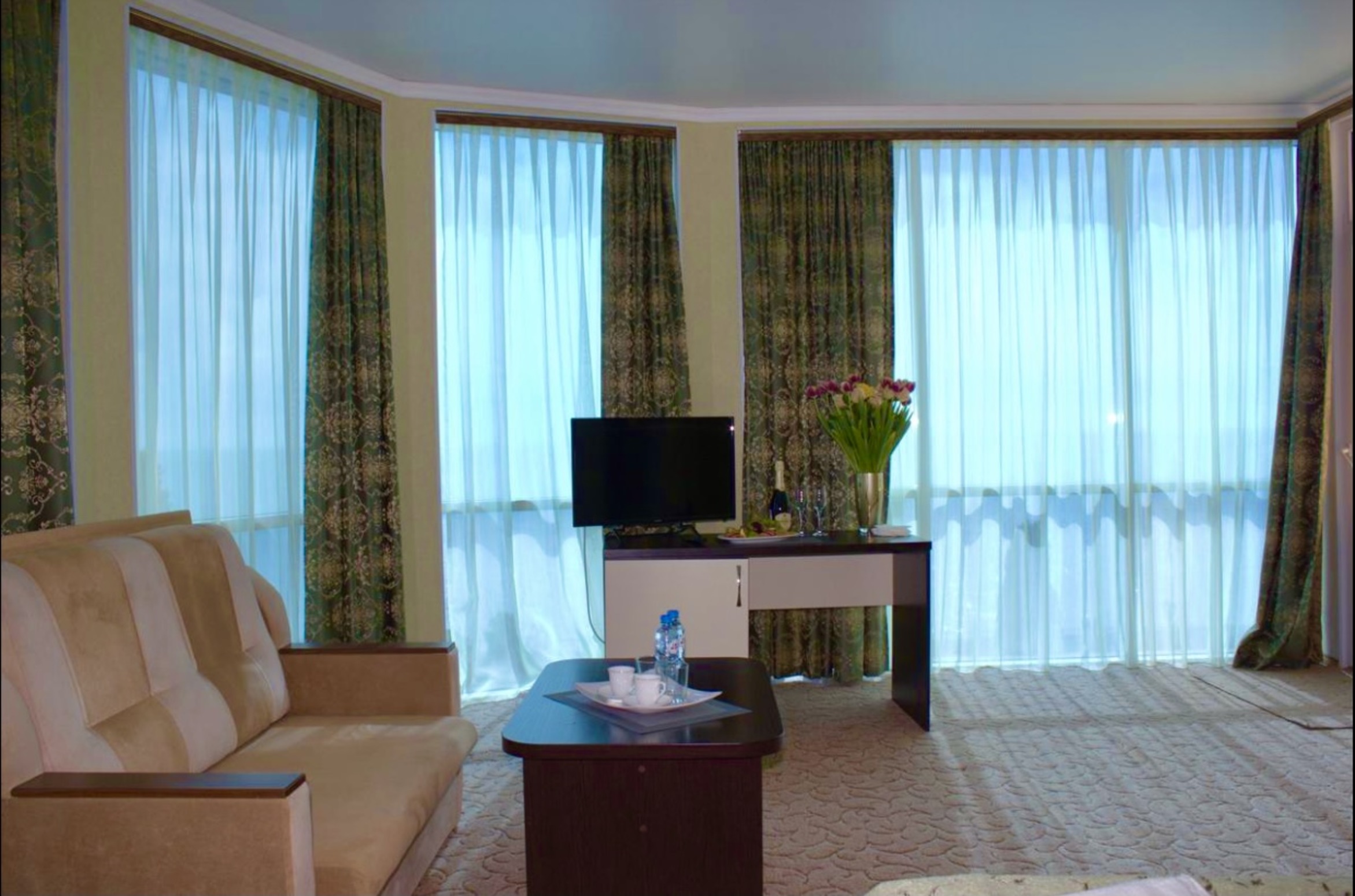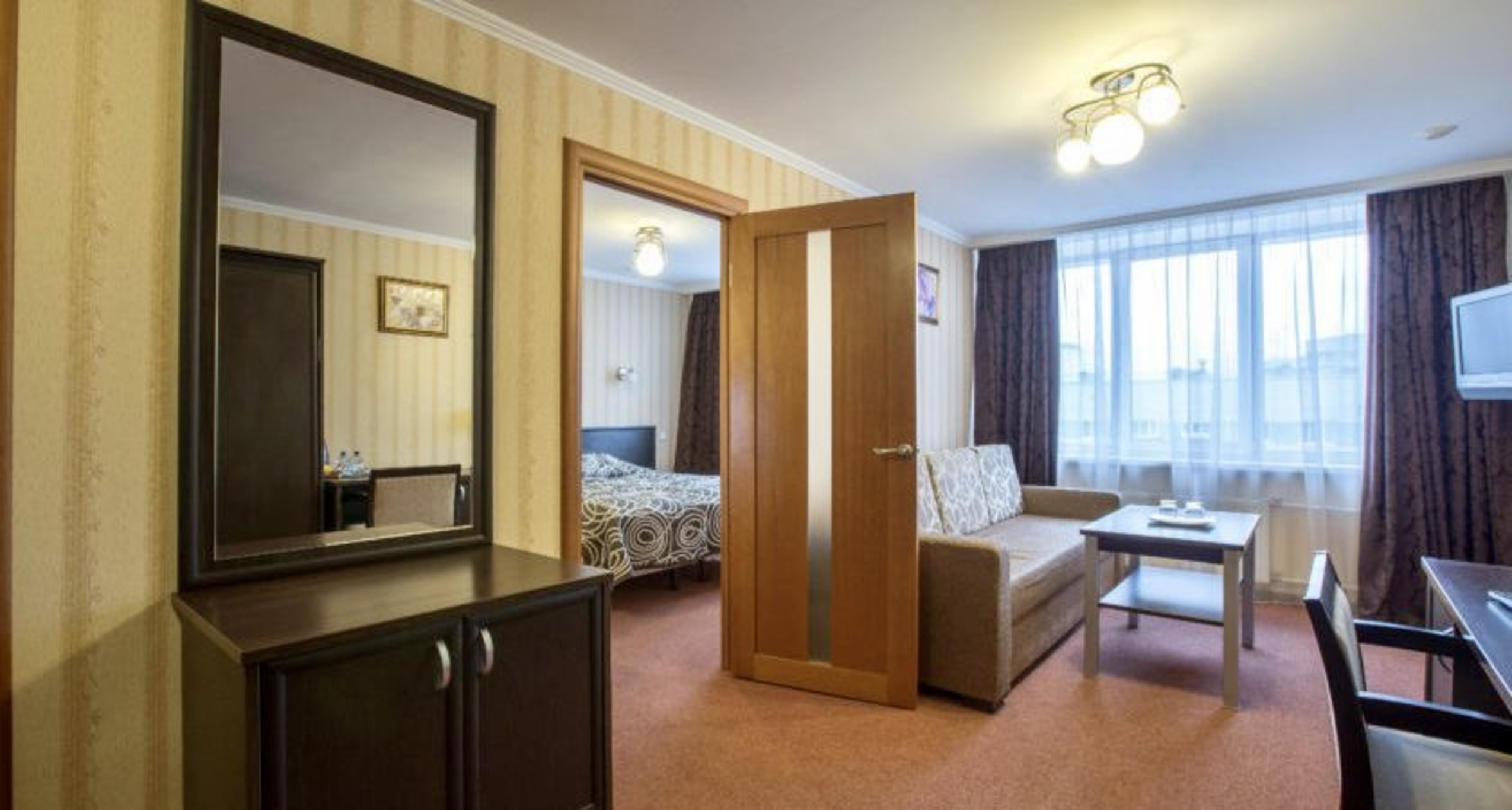 В номере: диван раскладной, зеркало, кровать двуспальная, прикроватные тумбочки, стол, столик журнальный, стул, шкаф, кондиционер, телевизор, холодильник