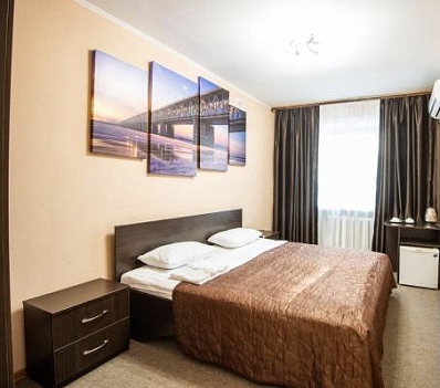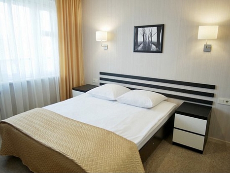 В номере: зеркало, кровать двуспальная, прикроватные тумбочки, столик журнальный, шкаф, кондиционер, телевизор, холодильник