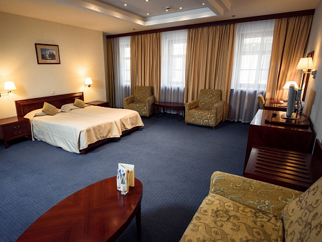 В номере: диван, зеркало, кресло, кровать двуспальная, прикроватные тумбочки, стол, стулья, шкаф, кондиционер, телевизор, холодильник